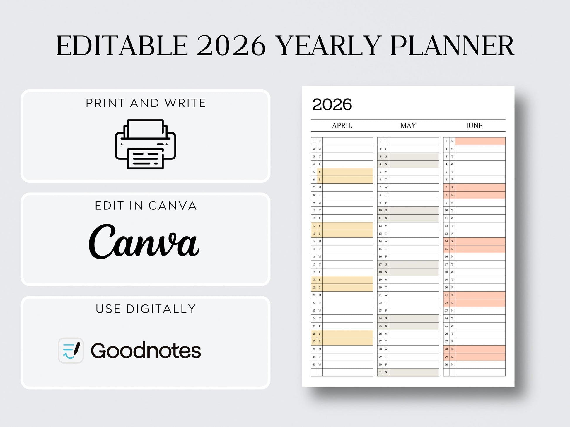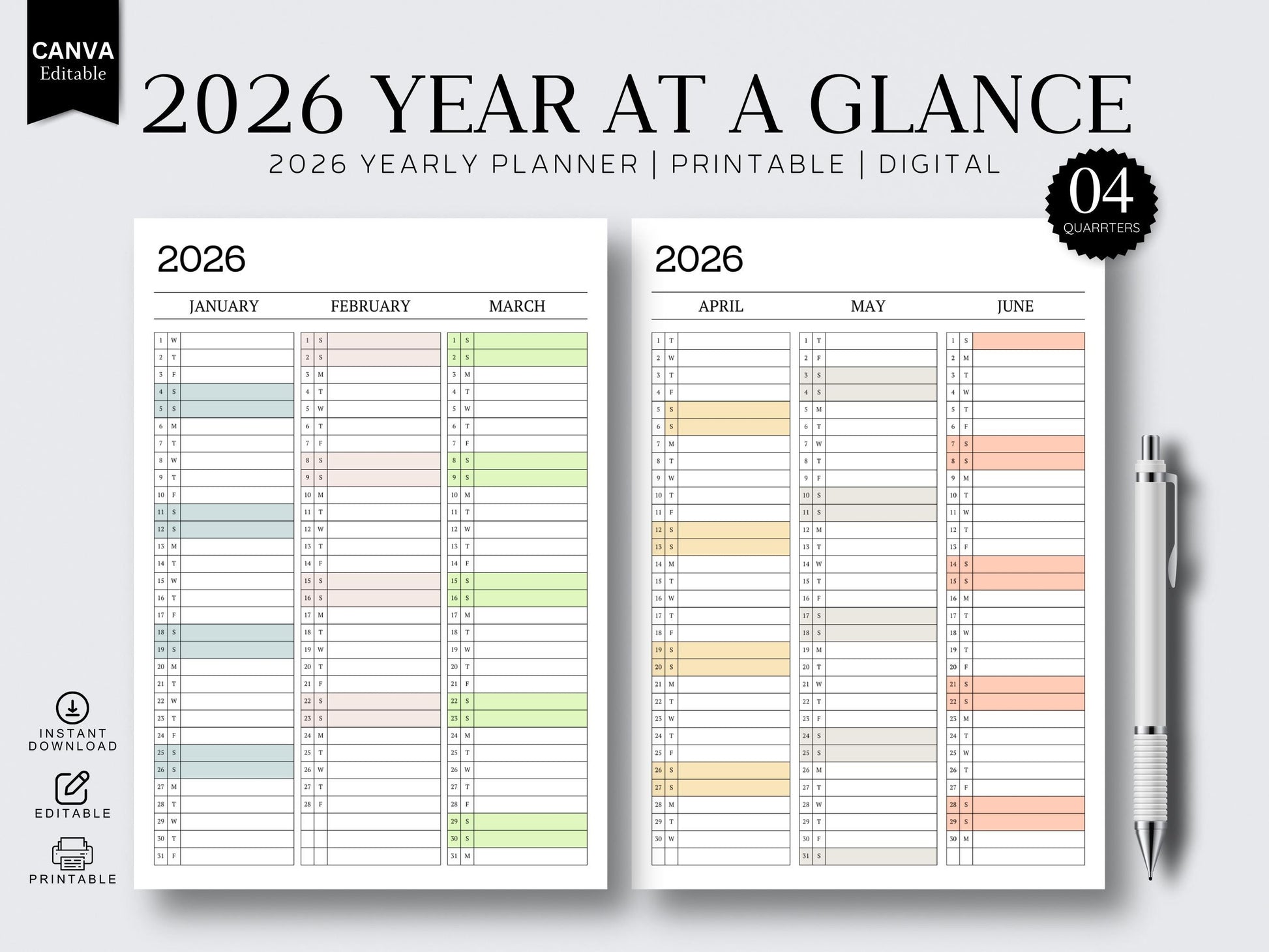 Mit diesem übersichtlichen und minimalistischen Jahreskalender 2026 behalten Sie das ganze Jahr über den Überblick. Das Kalenderblatt ist im vertikalen Monatslayout gestaltet und zeigt auf jeder Seite drei Monate mit sanften Pastellfarben – ideal zum Planen, Organisieren und für eine einfache Jahresübersicht.