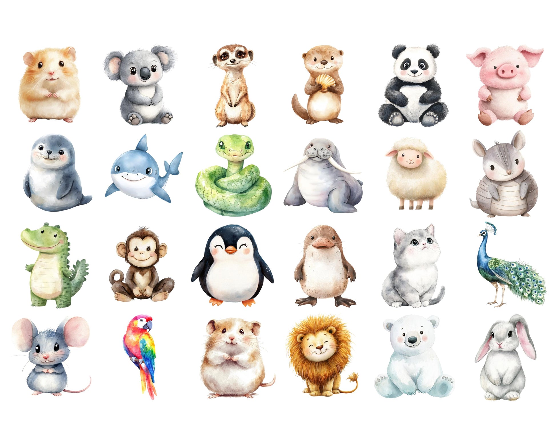 50 niedliche Tier-Cliparts (PNG-Bundle), Aquarell-Tier-Cliparts, Tier-Cliparts, skurrile Tier-Cliparts, Baby-Tier-Cliparts zum Ausdrucken