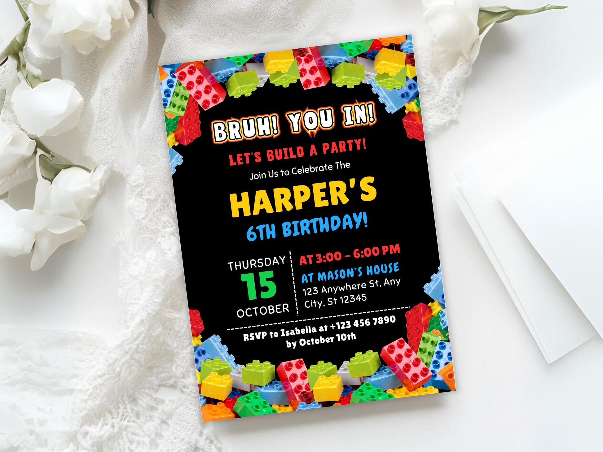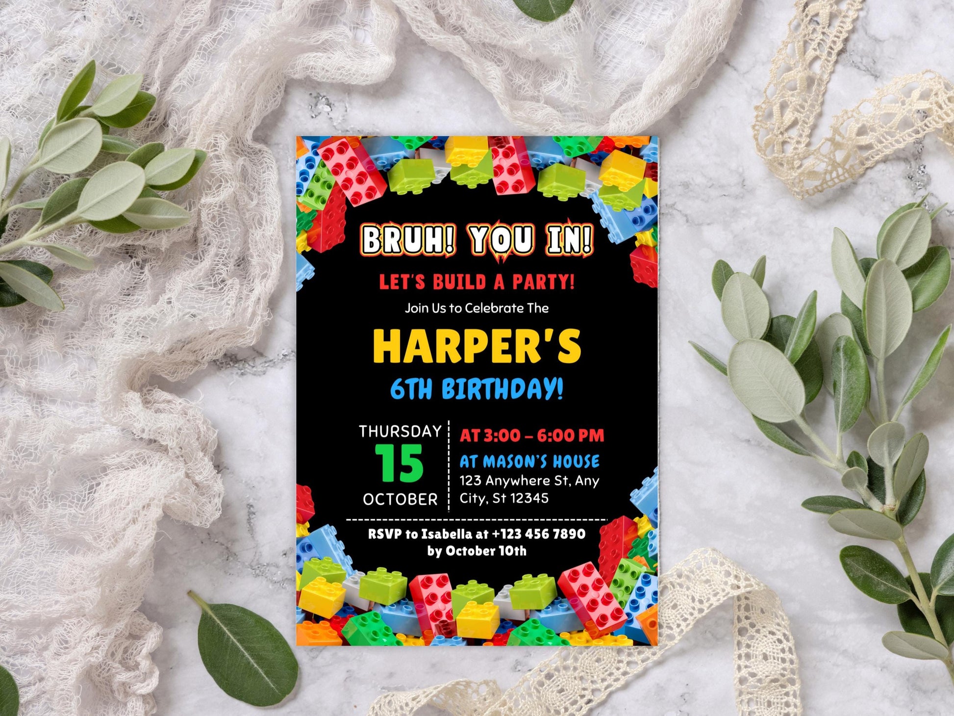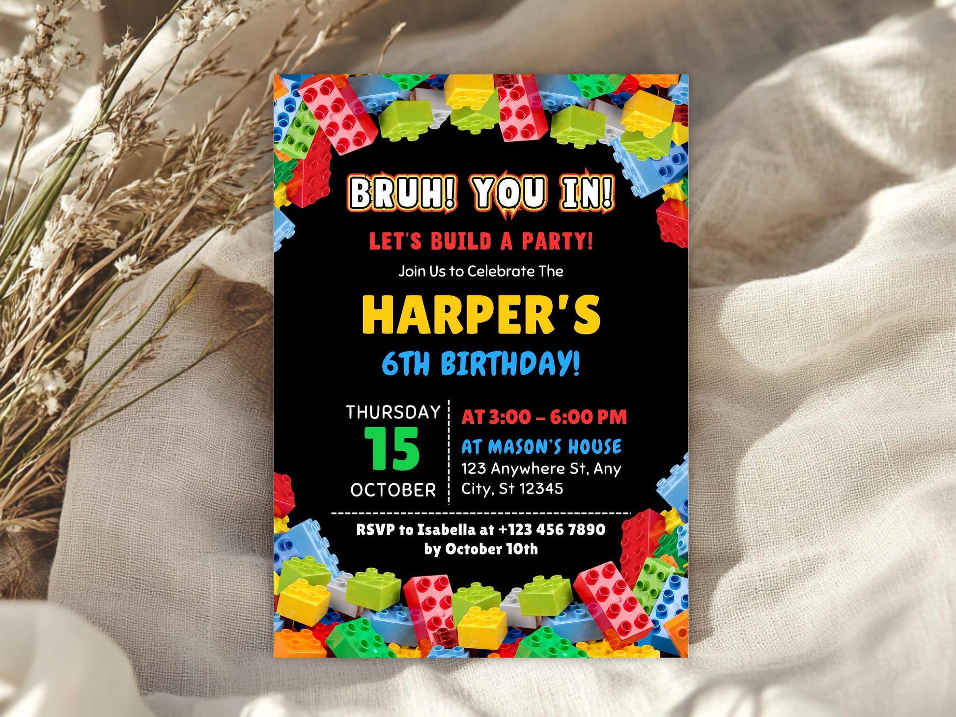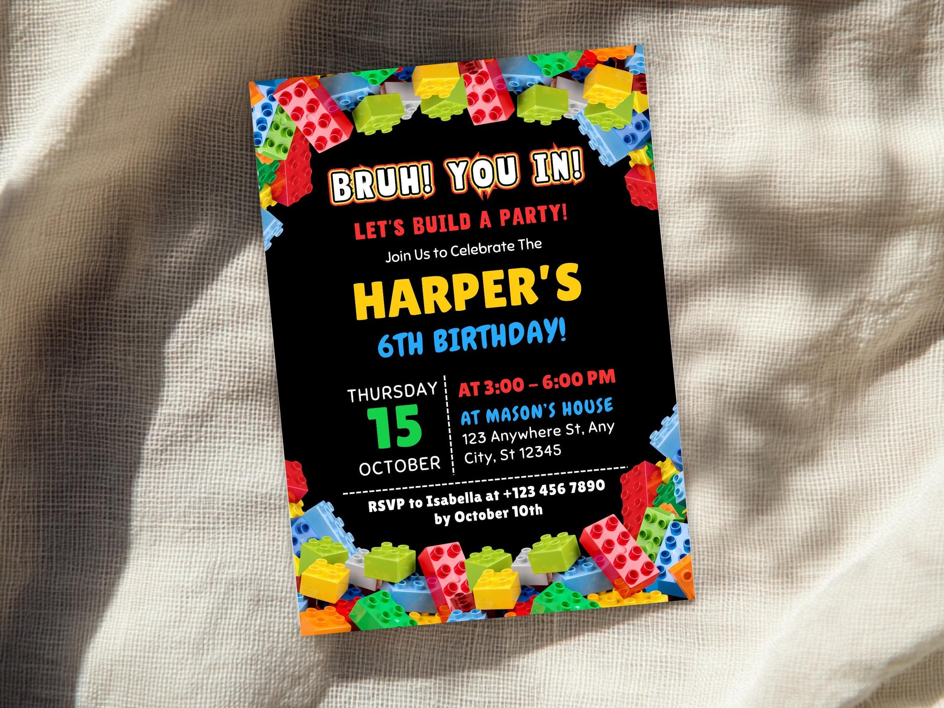 Bearbeitbare Geburtstagseinladung mit Bausteinen-Motiv, Einladung zur Baustein-Mottoparty, Einladungsvorlage, Canva-Vorlage, digitaler Download