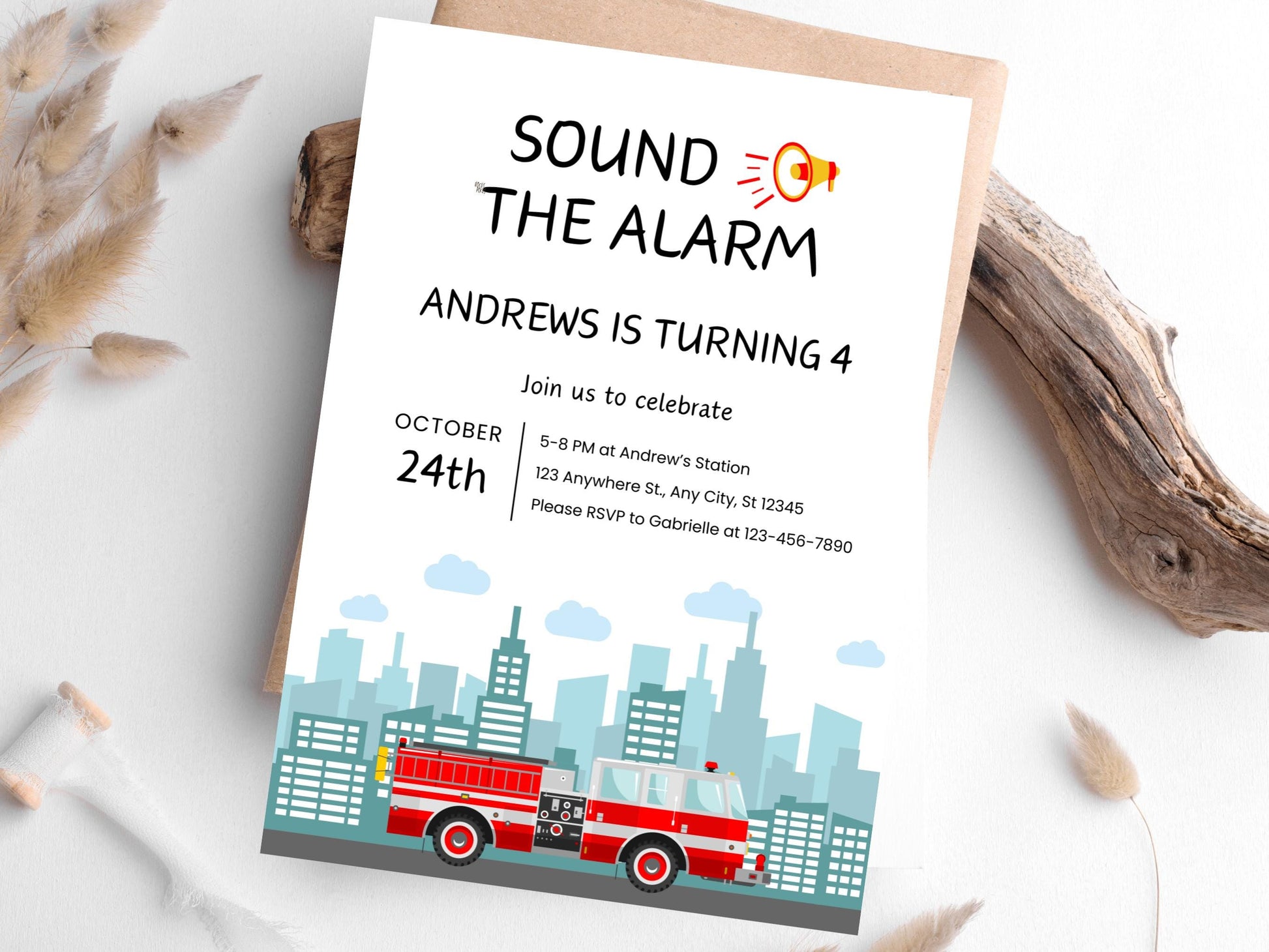 Bearbeitbare Geburtstagseinladung mit Feuerwehrauto-Motiv, Canva-Vorlage (PDF)