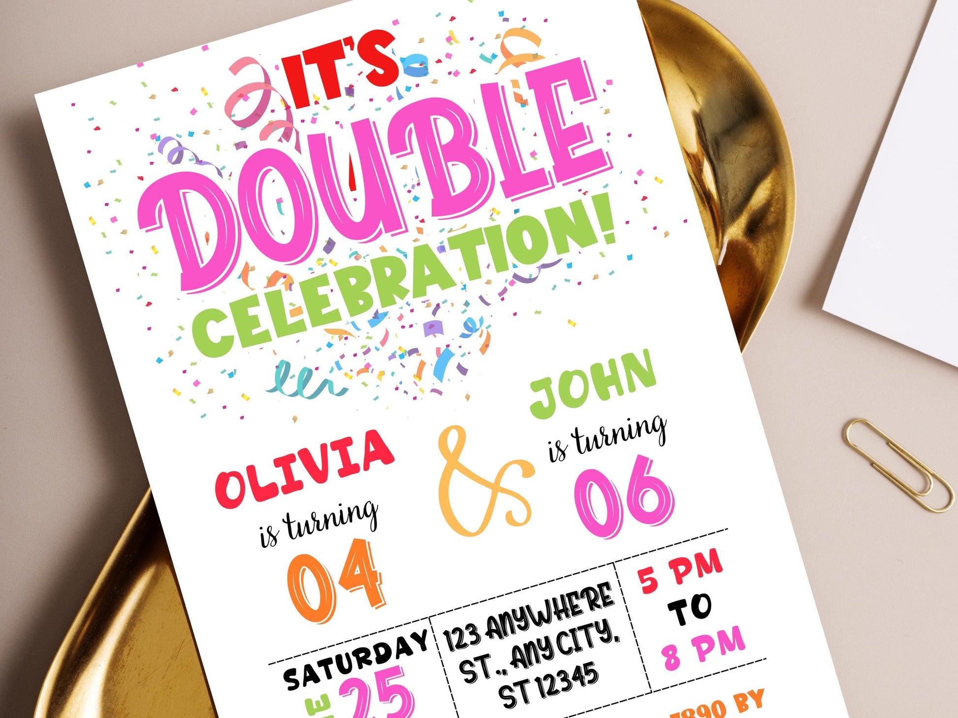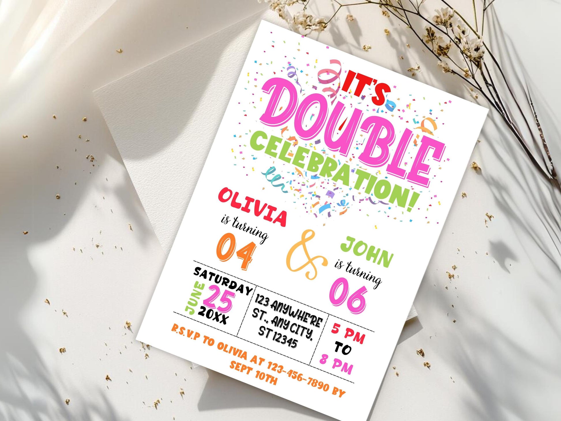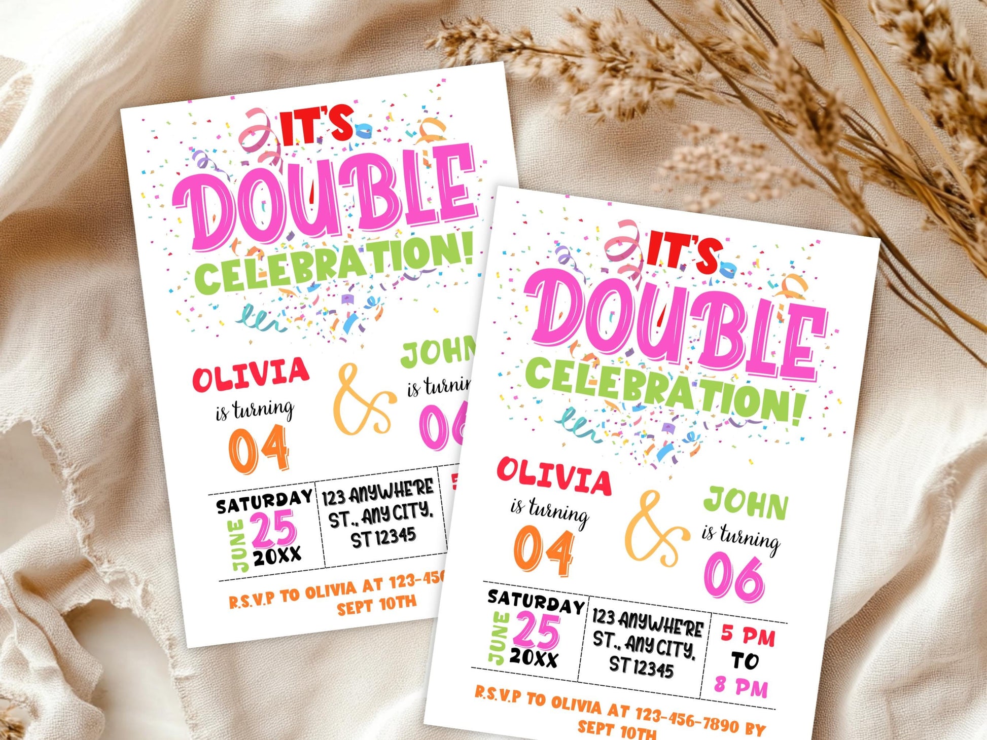 Vorlage für eine bearbeitbare gemeinsame Geburtstagseinladung, Einladung zum Doppelgeburtstag, Geschwistergeburtstagseinladung, Zwillingsgeburtstagseinladung