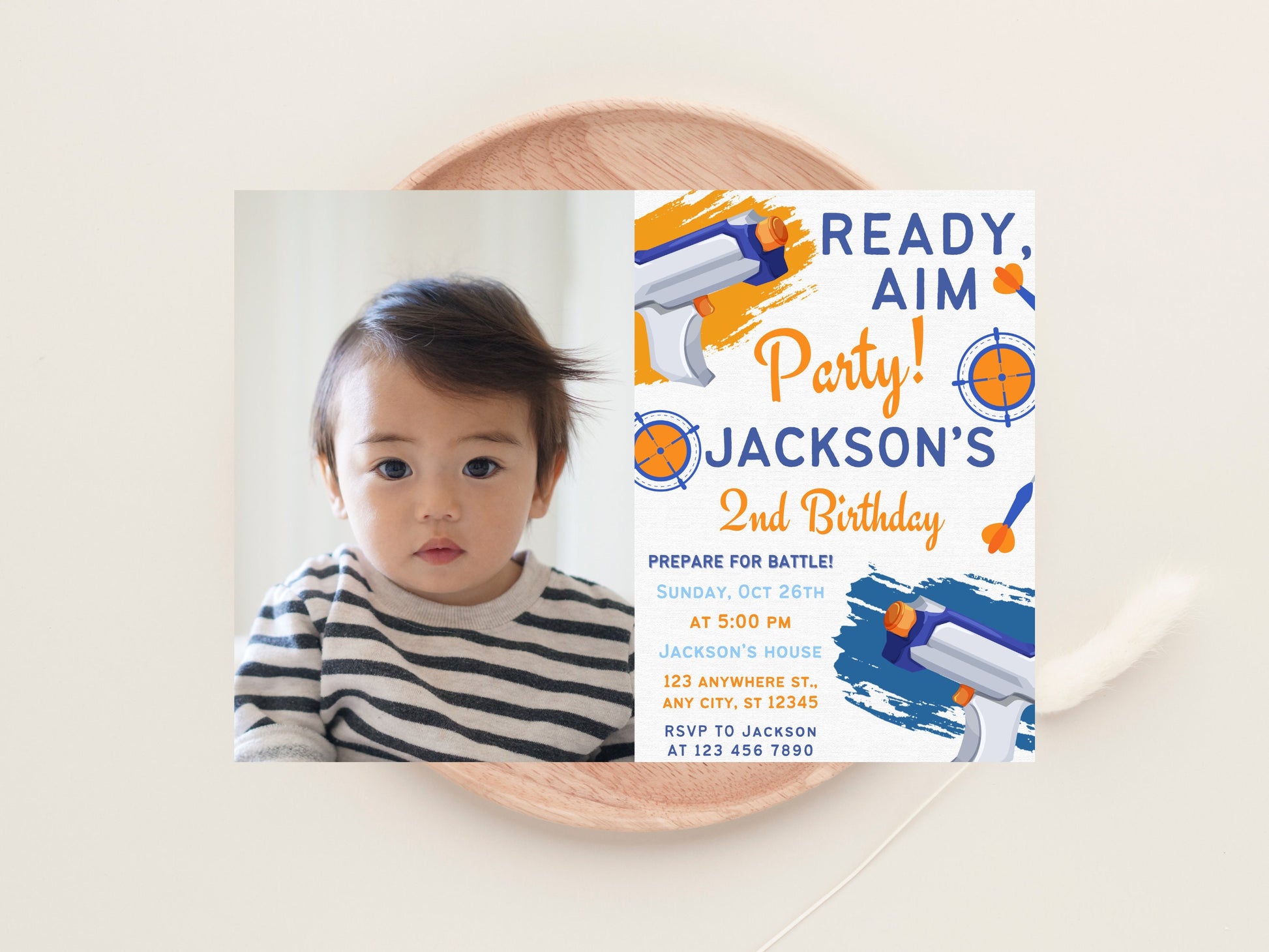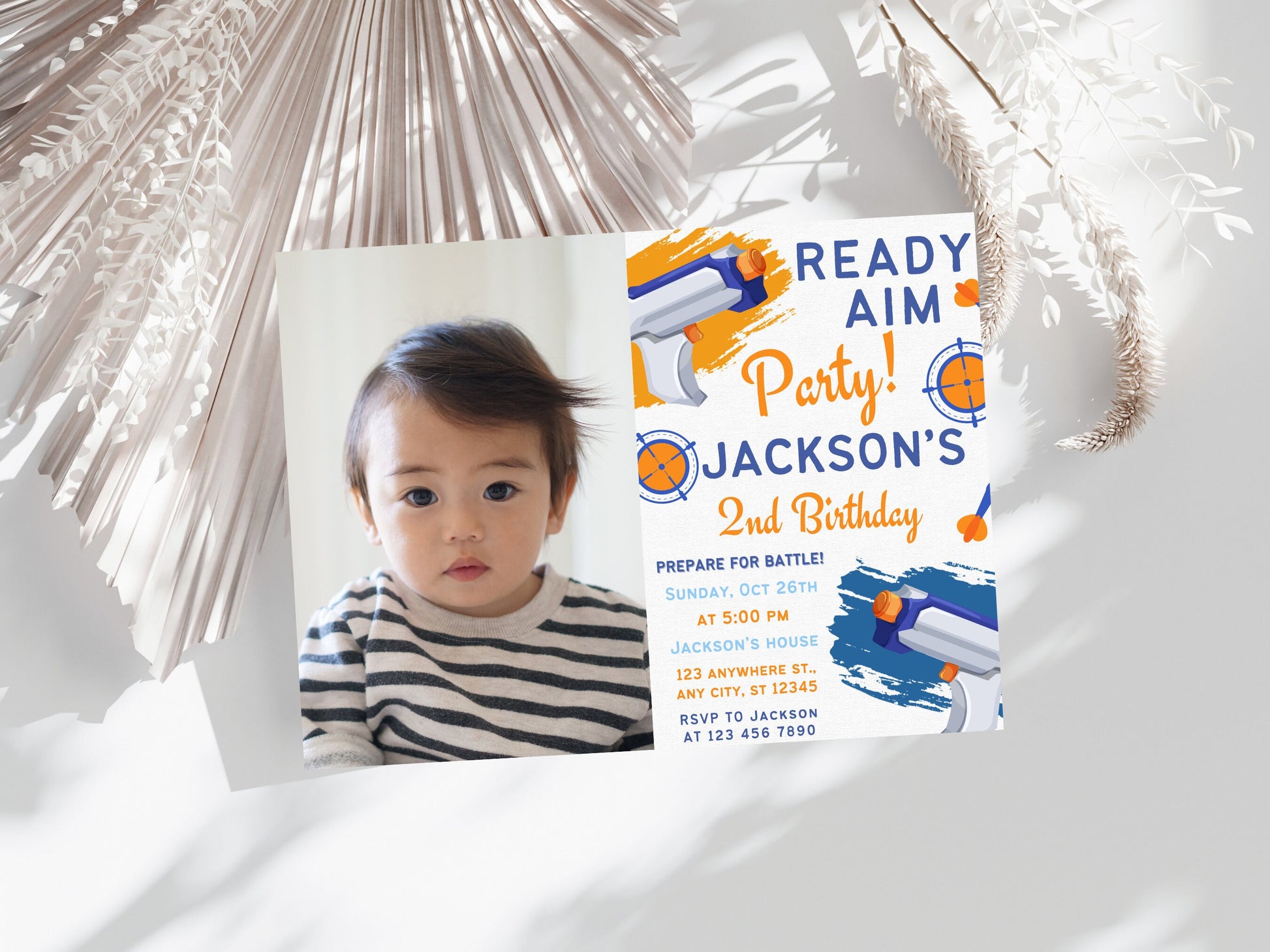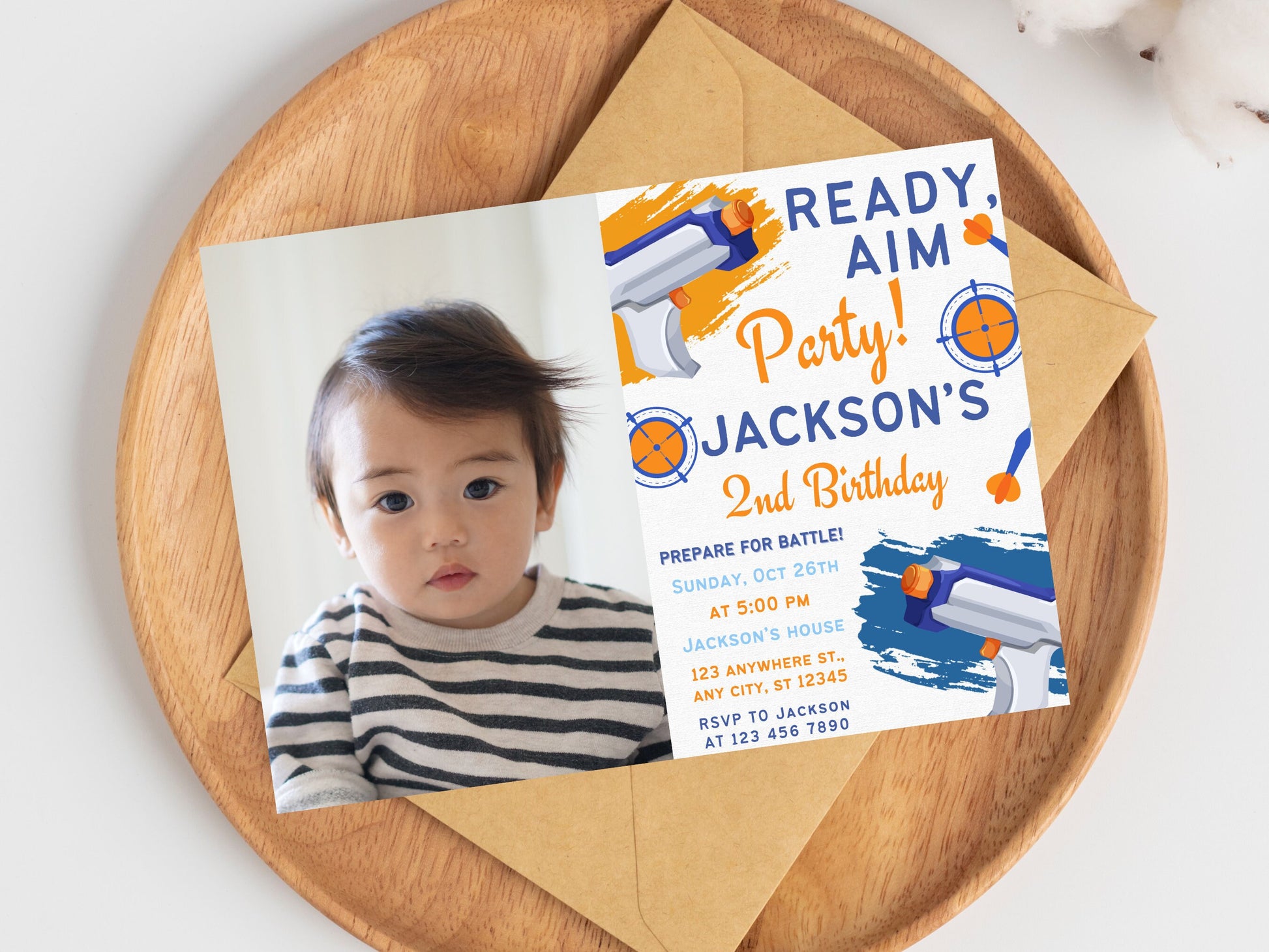Bearbeitbare Nerf-Geburtstagseinladung, Foto-Dart-Party (Canva-Vorlage)