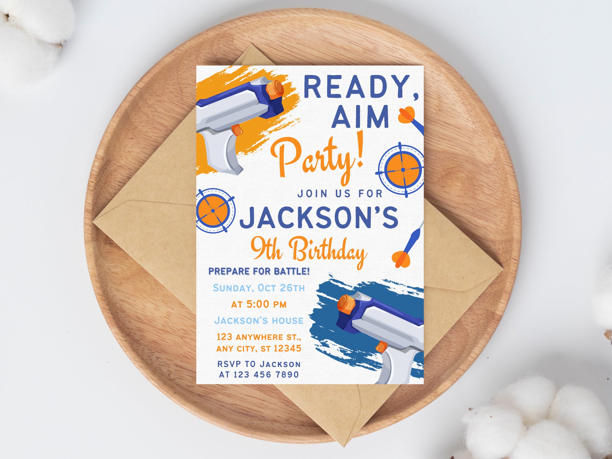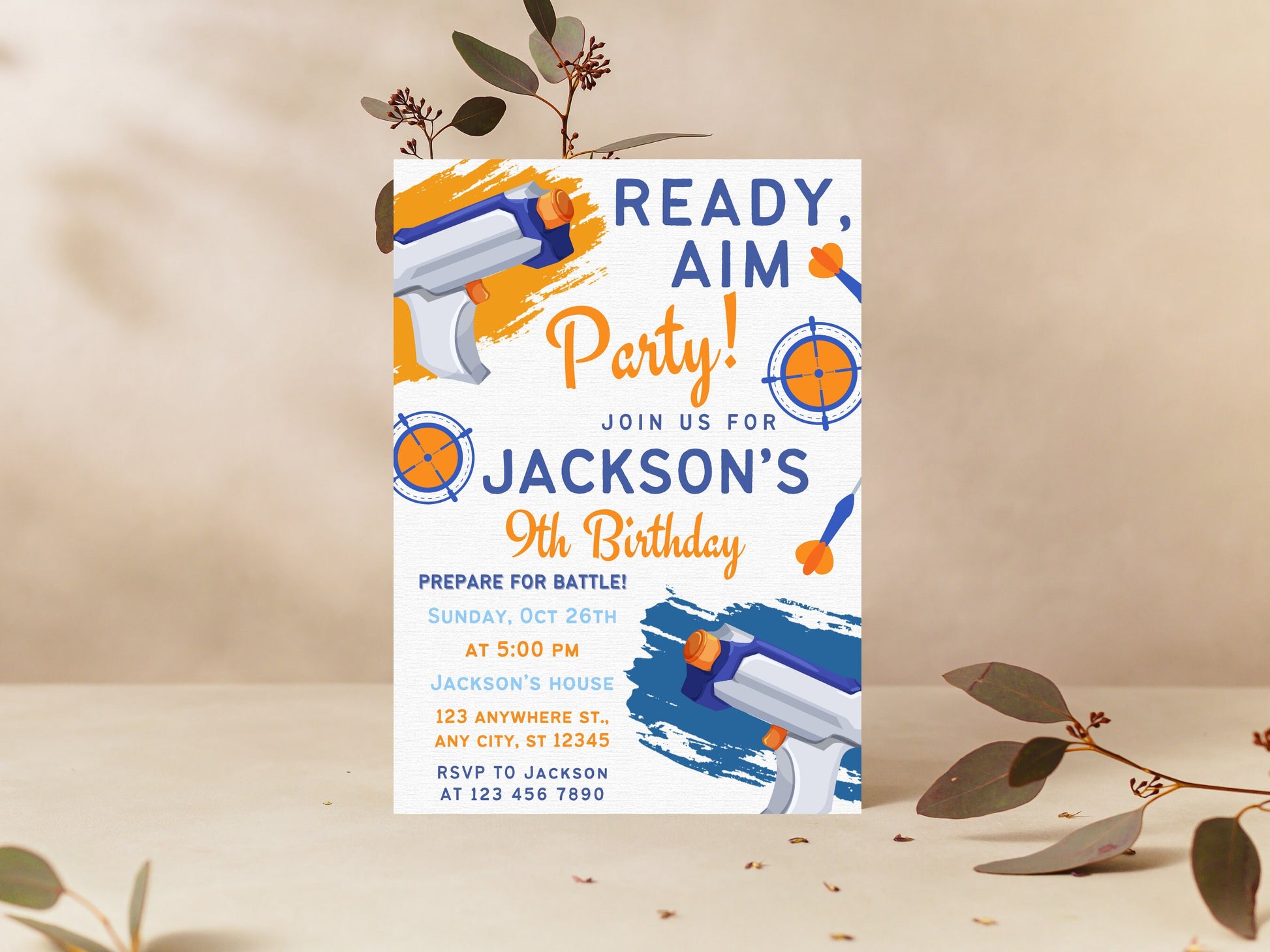 Bearbeitbare Einladung zur Nerf-Geburtstagsparty, Dart-Geburtstagseinladung, Dart-Geburtstagseinladung, bearbeitbare Canva-Vorlage, sofortiger Download