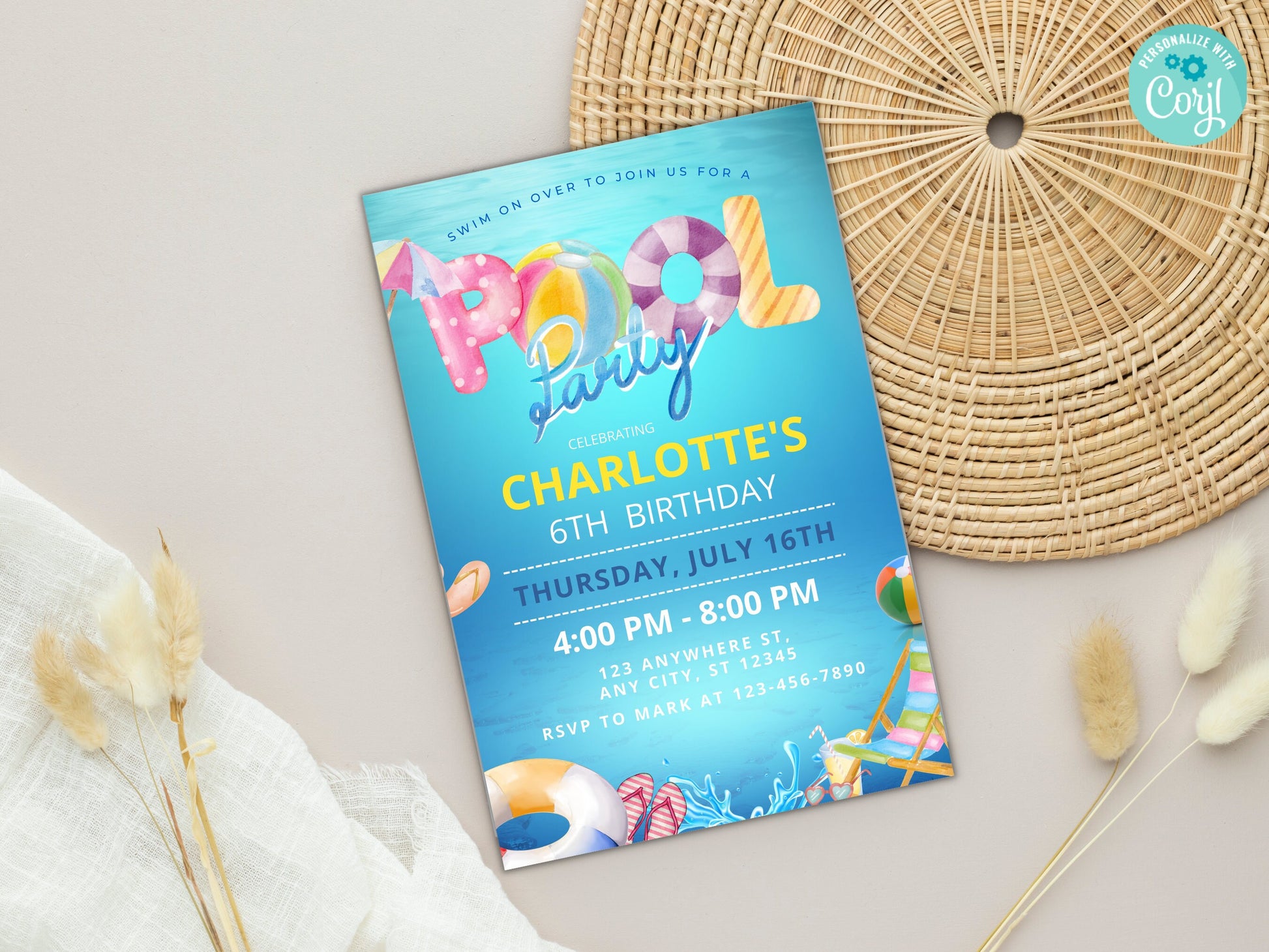 Vorlage für eine bearbeitbare Einladung zur Poolparty-Geburtstagsfeier (Digitaler Download)