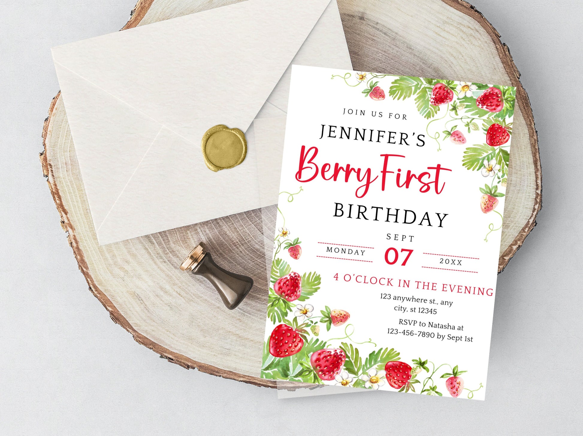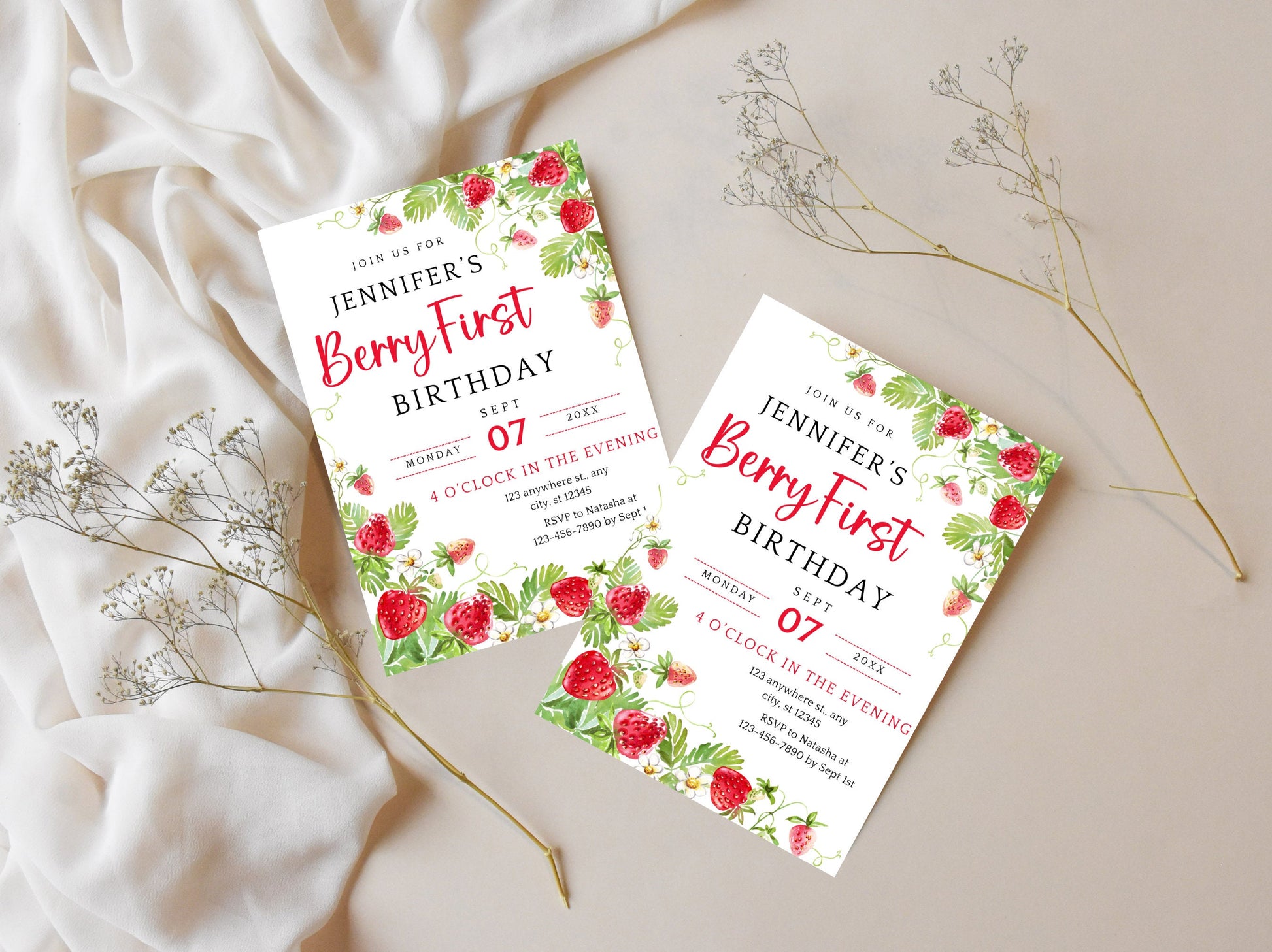 Vorlage für eine personalisierbare Einladung zum ersten Geburtstag mit Beerenmotiv, Erdbeer-Geburtstagseinladung für Mädchen, Druckbare Einladung zum ersten Geburtstag für die Süße