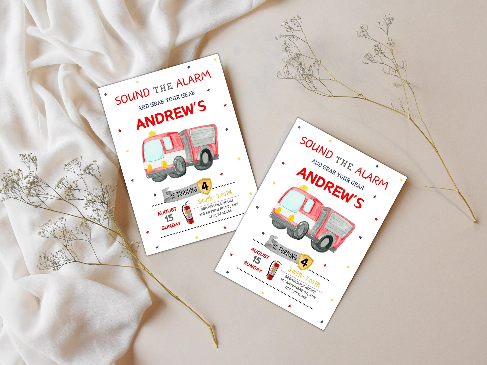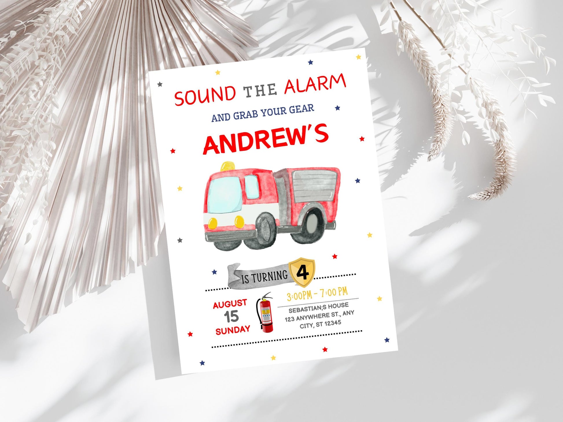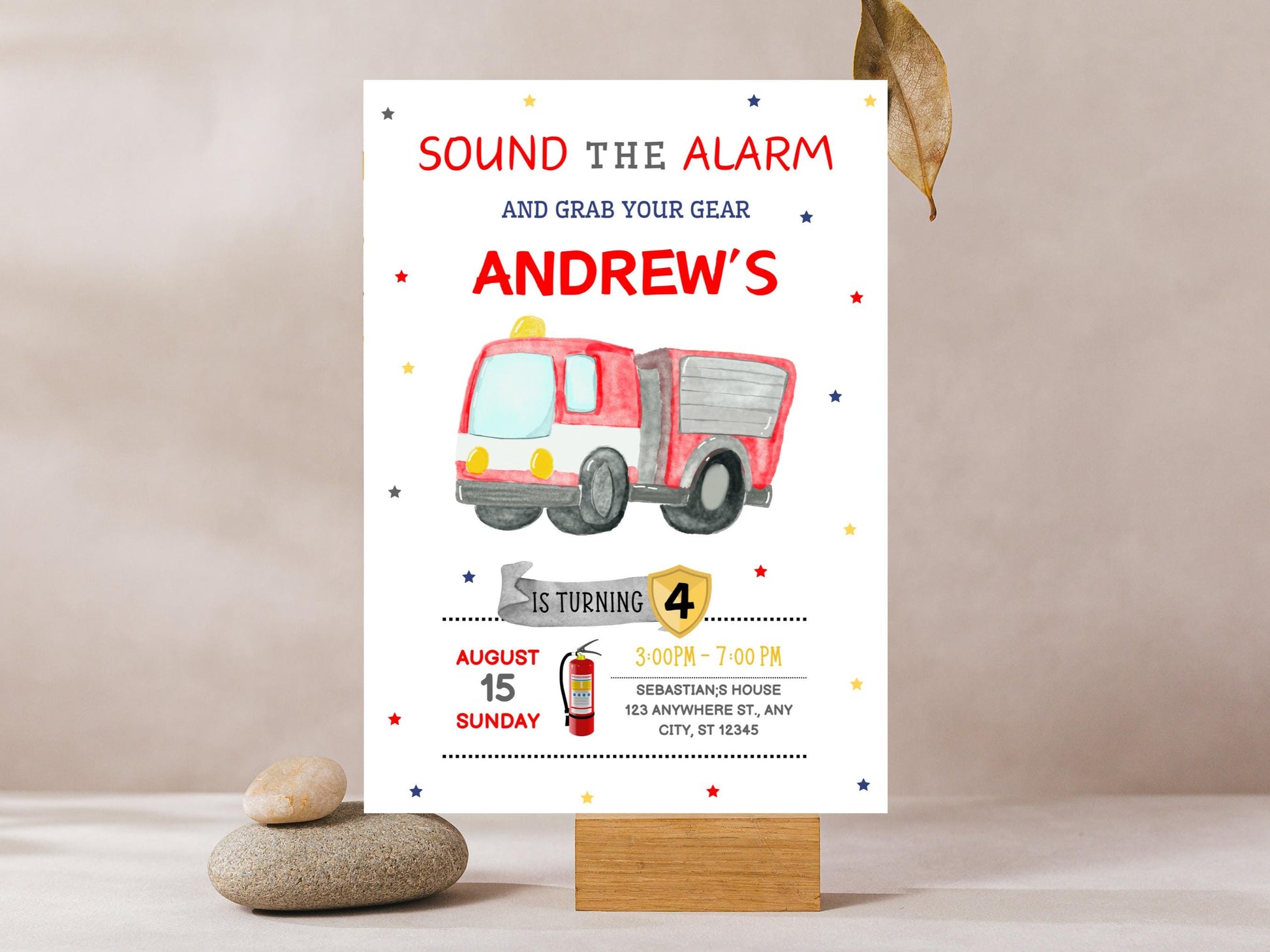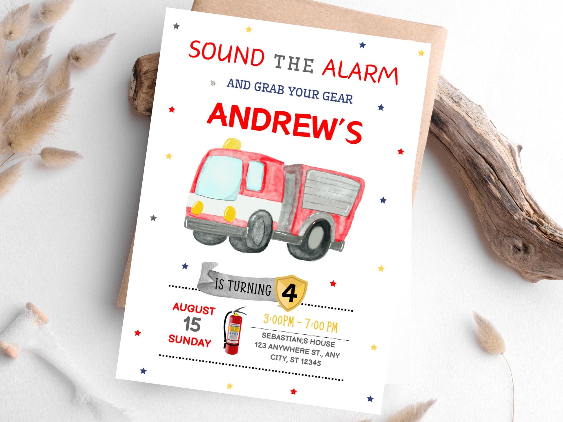 Vorlage für eine Geburtstagseinladung mit Feuerwehrmotiv, bearbeitbare Canva-Datei (digitaler Download)