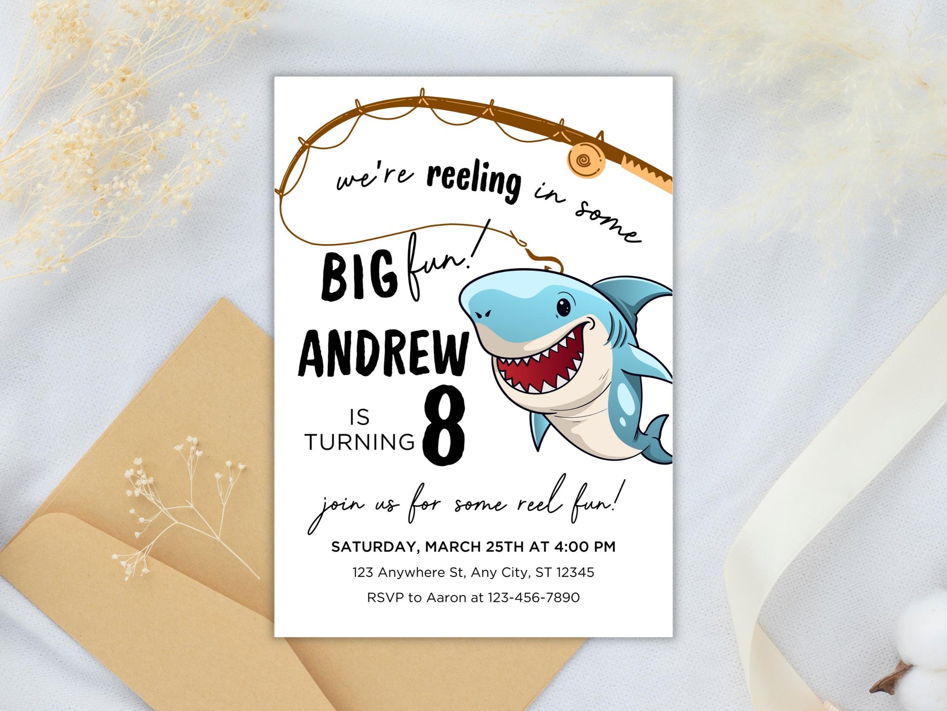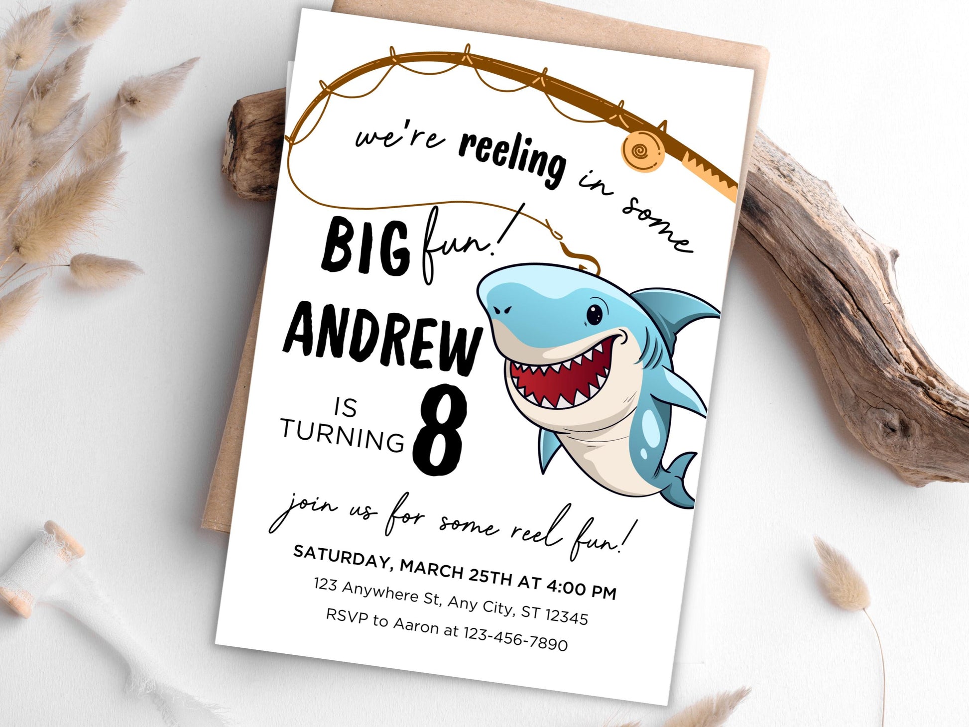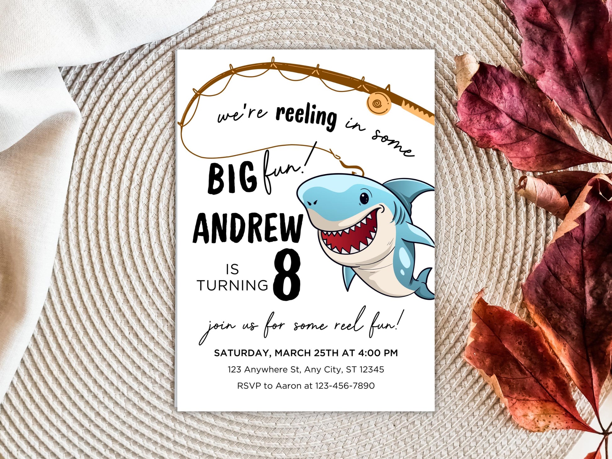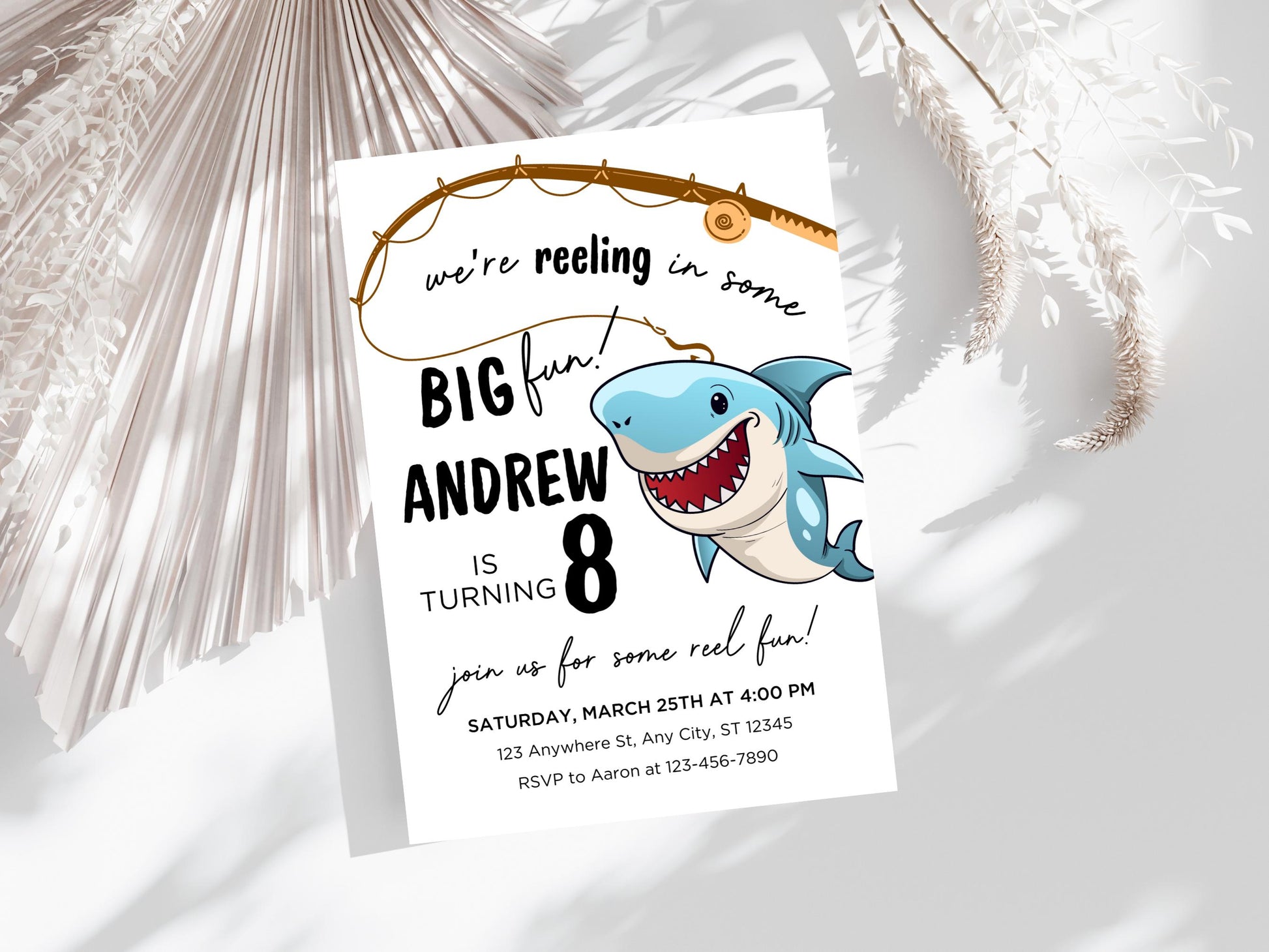 Geburtstagseinladung zum Thema Angeln, Hai-Motiv, bearbeitbare E-Einladung (digitaler Download)