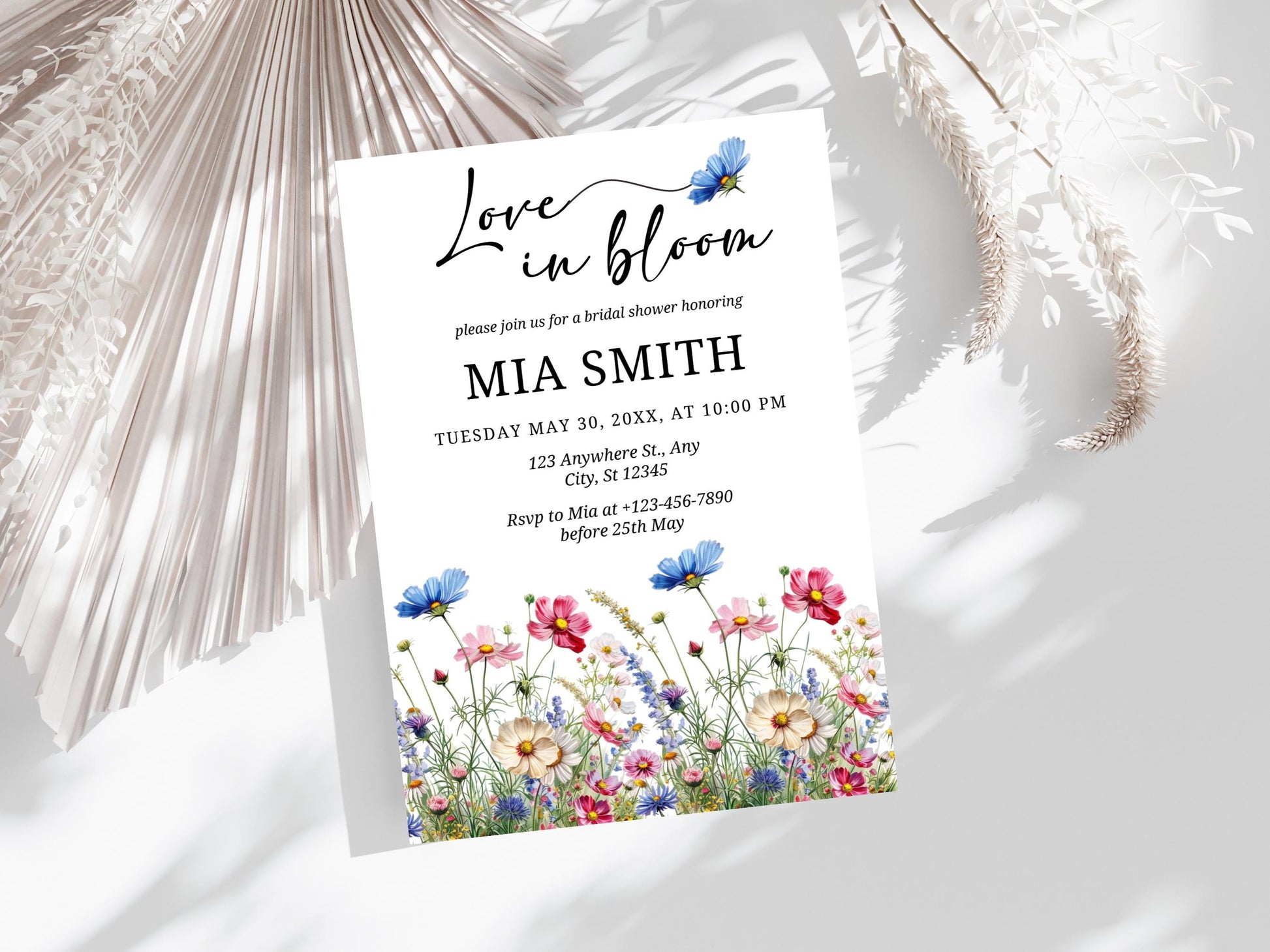 Bearbeitbare Einladung „Love in Bloom“, Einladung zur Brautparty mit Blumenmuster, Vorlage für eine Brautparty „Love in Bloom“, Einladungskarten für eine Boho-Gartenparty mit Blumenmuster