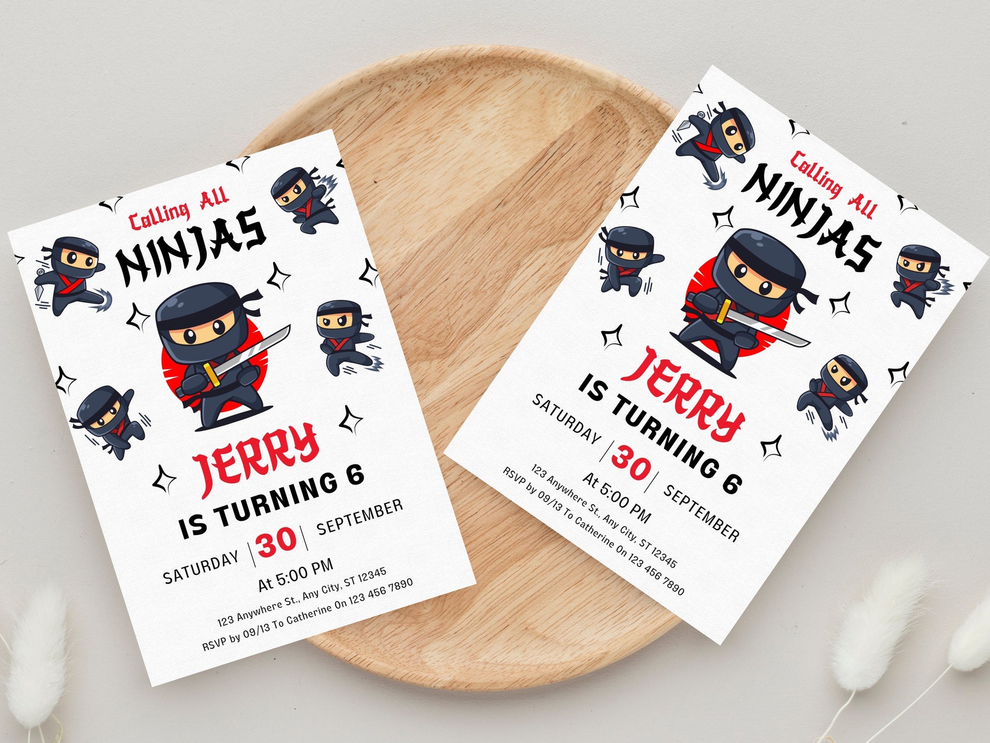 Wir präsentieren unsere individuell anpassbare Ninja-Geburtstagseinladungsvorlage! Diese vielseitige Vorlage lässt sich ganz einfach an Ihre Wünsche anpassen. Ändern Sie Text, Schriftgröße und Schriftart und bearbeiten oder entfernen Sie Bilder nach Belieben.