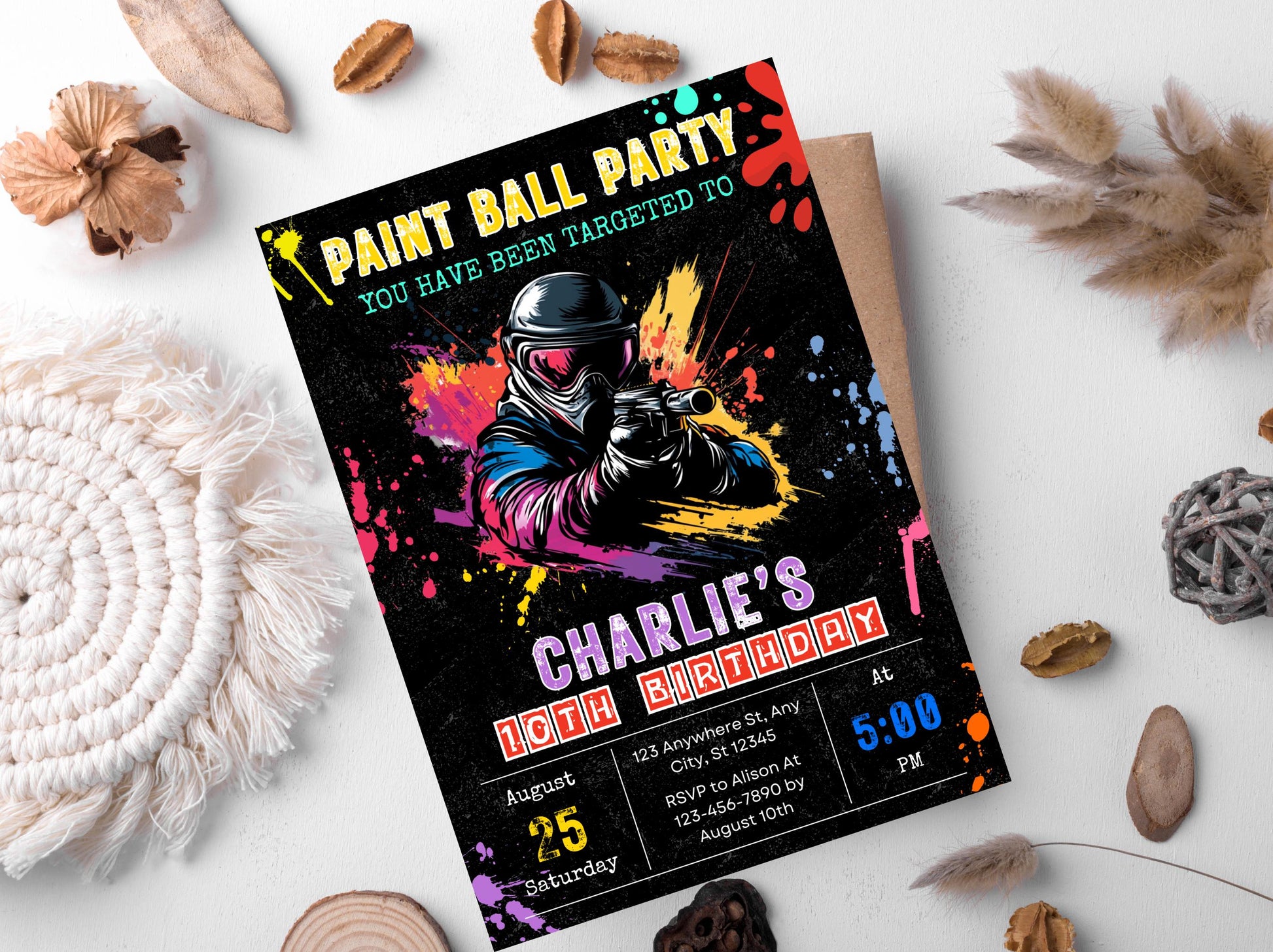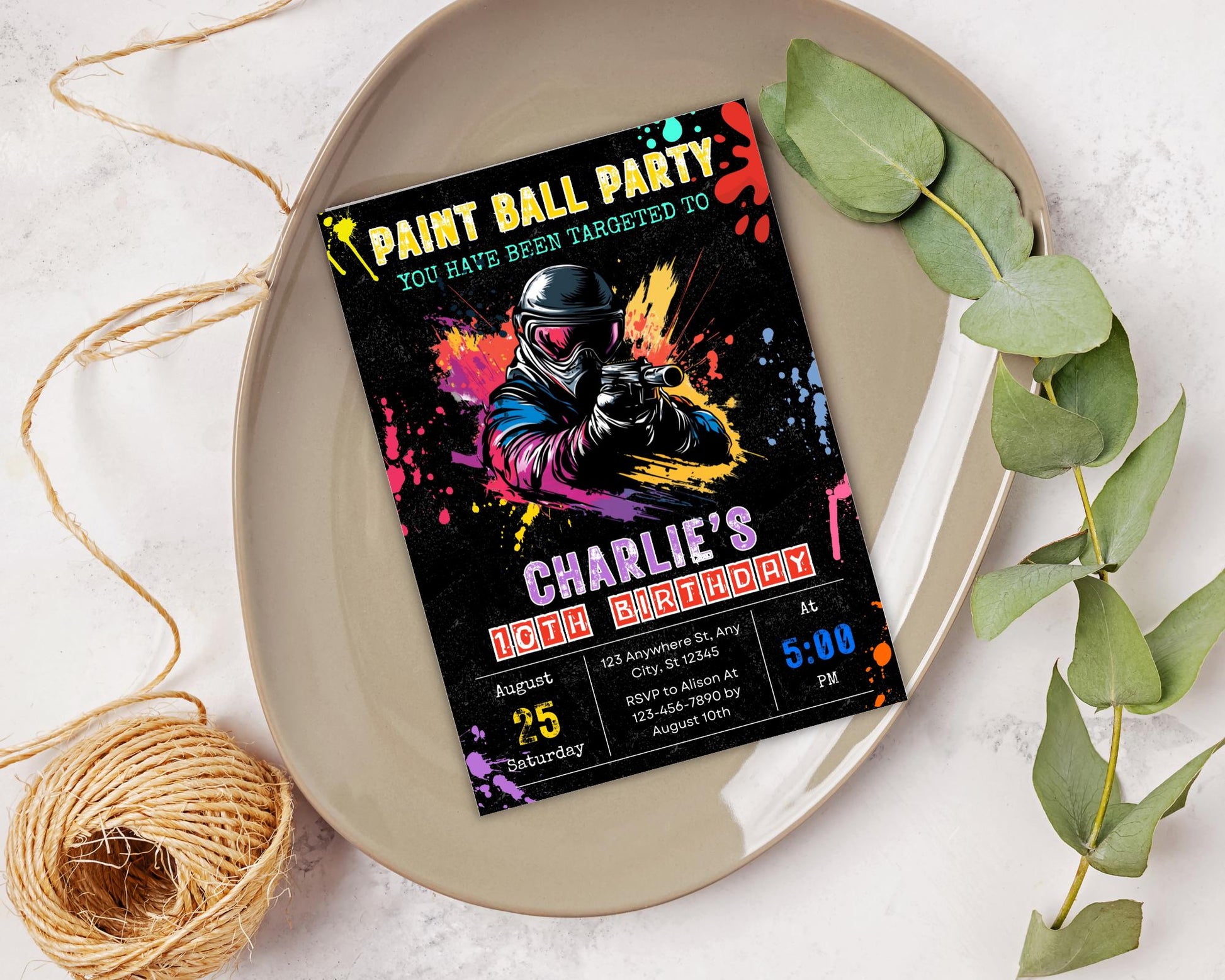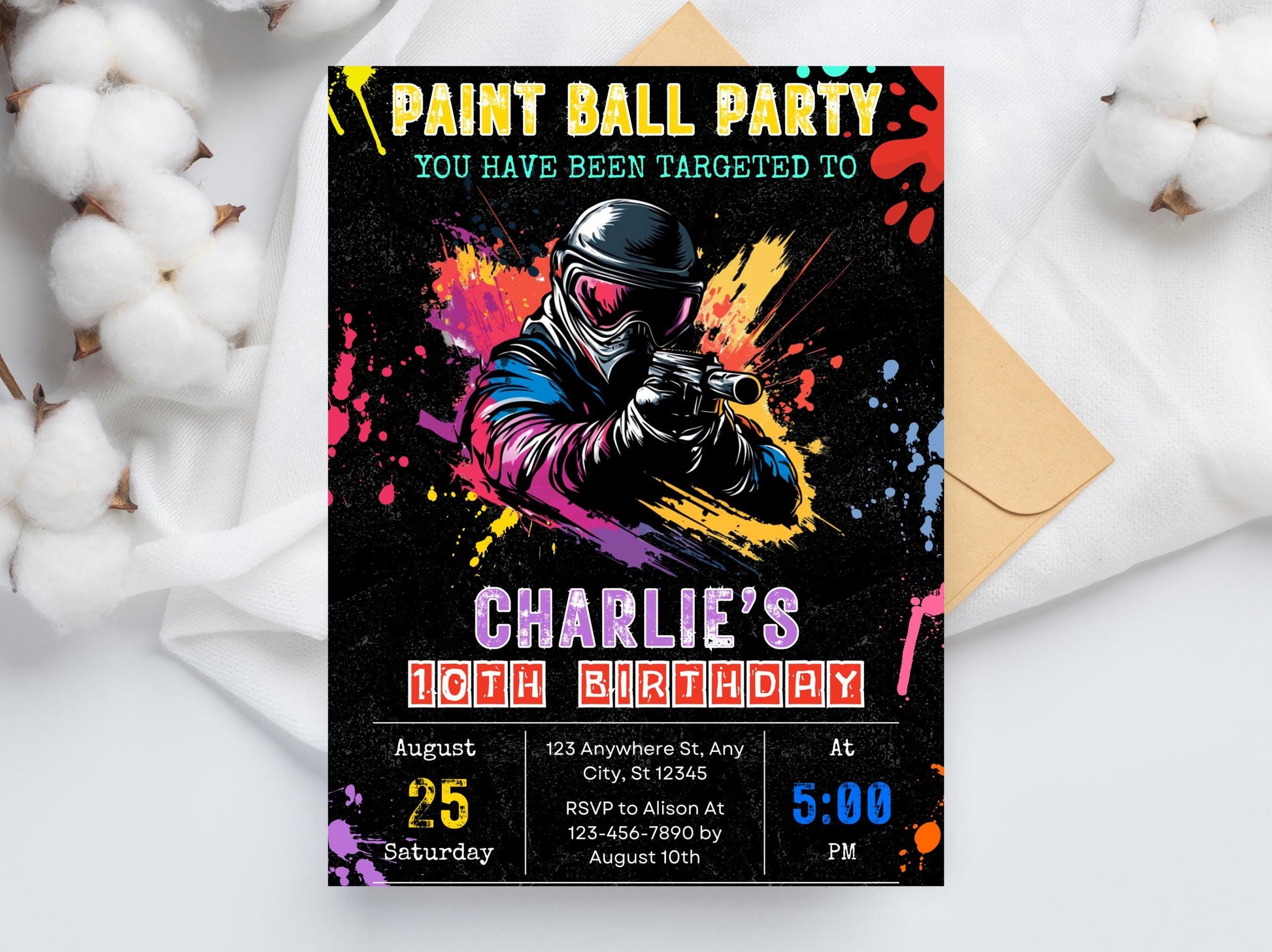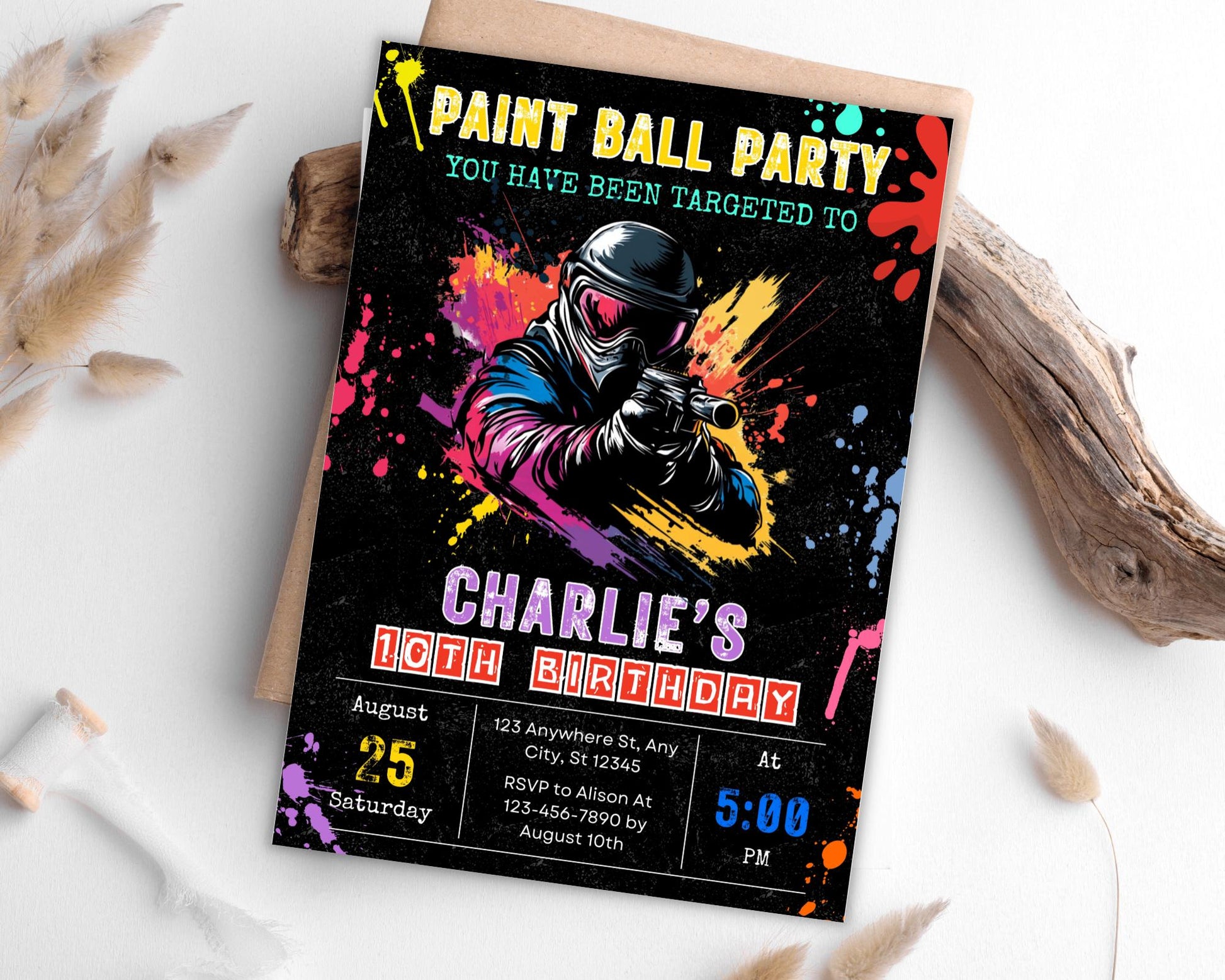 Einladung zur Paintball-Geburtstagsparty, Paintball-Geburtstagsparty für Jungen, Farbteller, Einladung zur Paintball-Party, DIY-Geburtstagseinladung