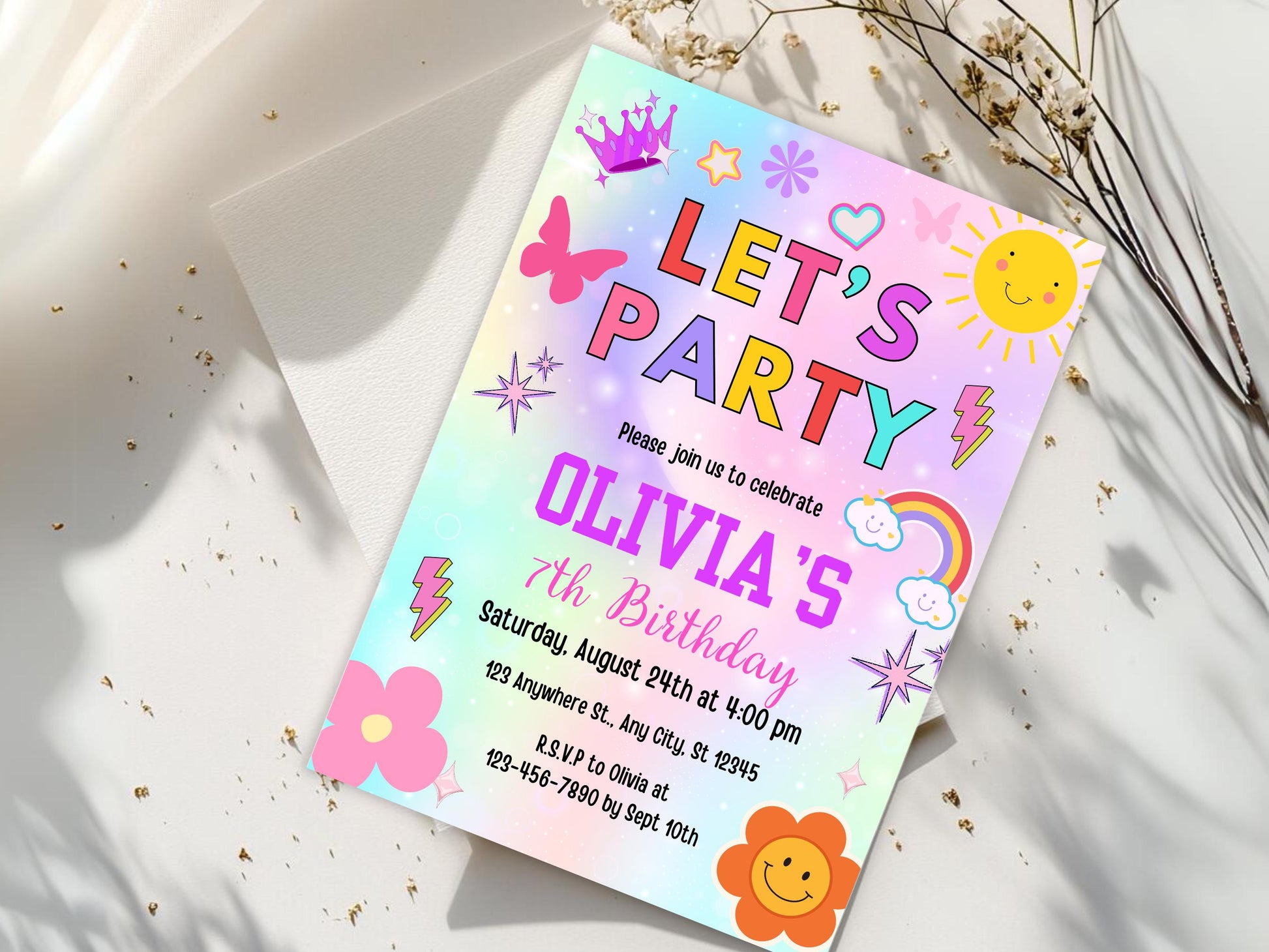 Regenbogen-Geburtstagseinladung | Bearbeitbare Partyeinladungsvorlage (PDF)