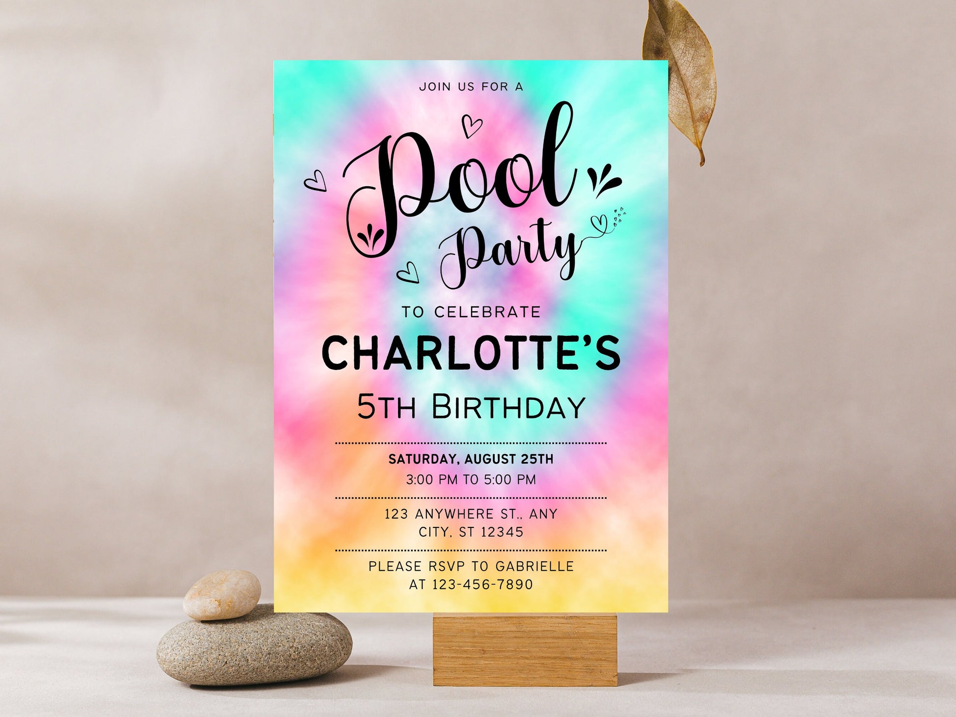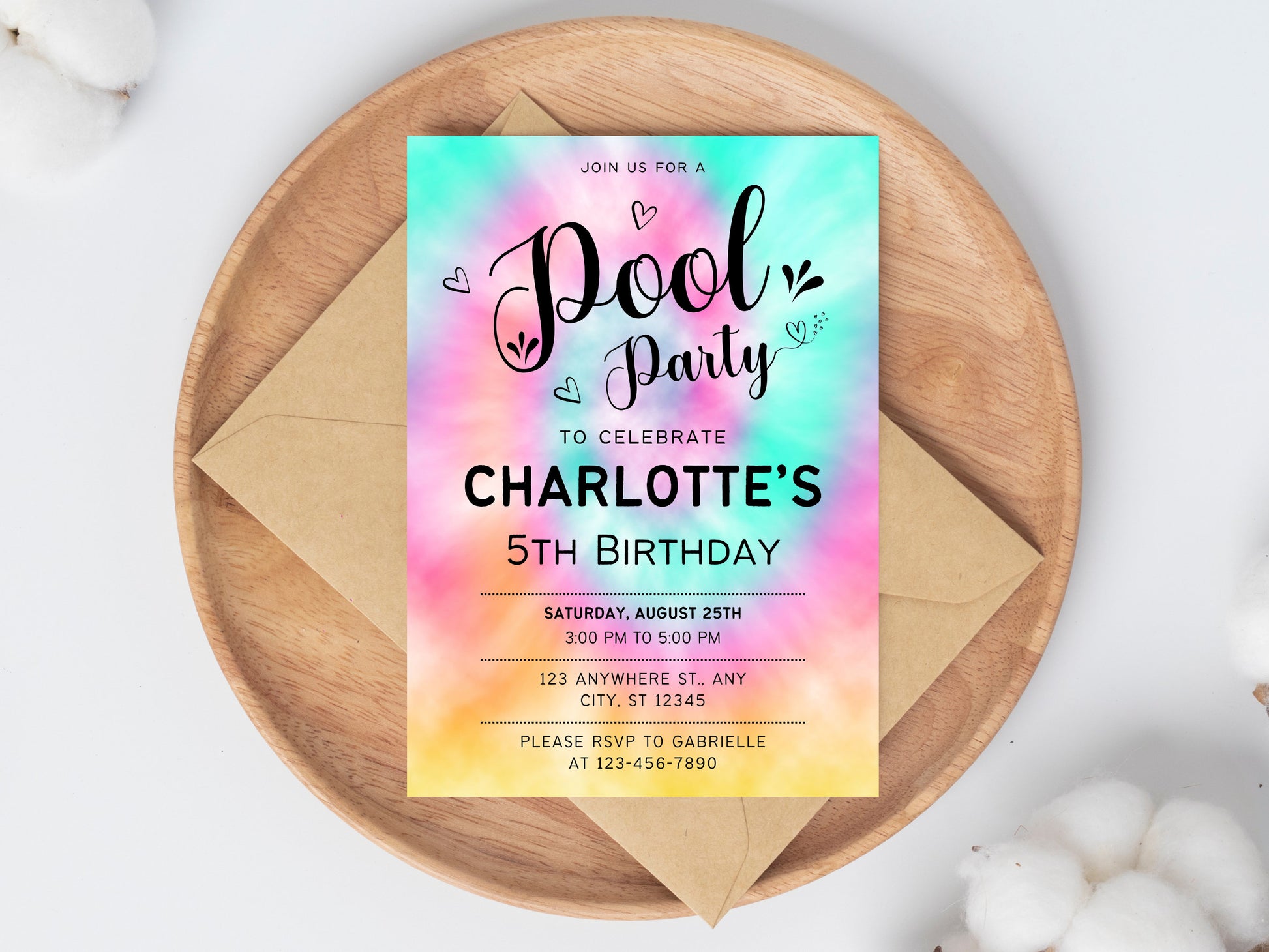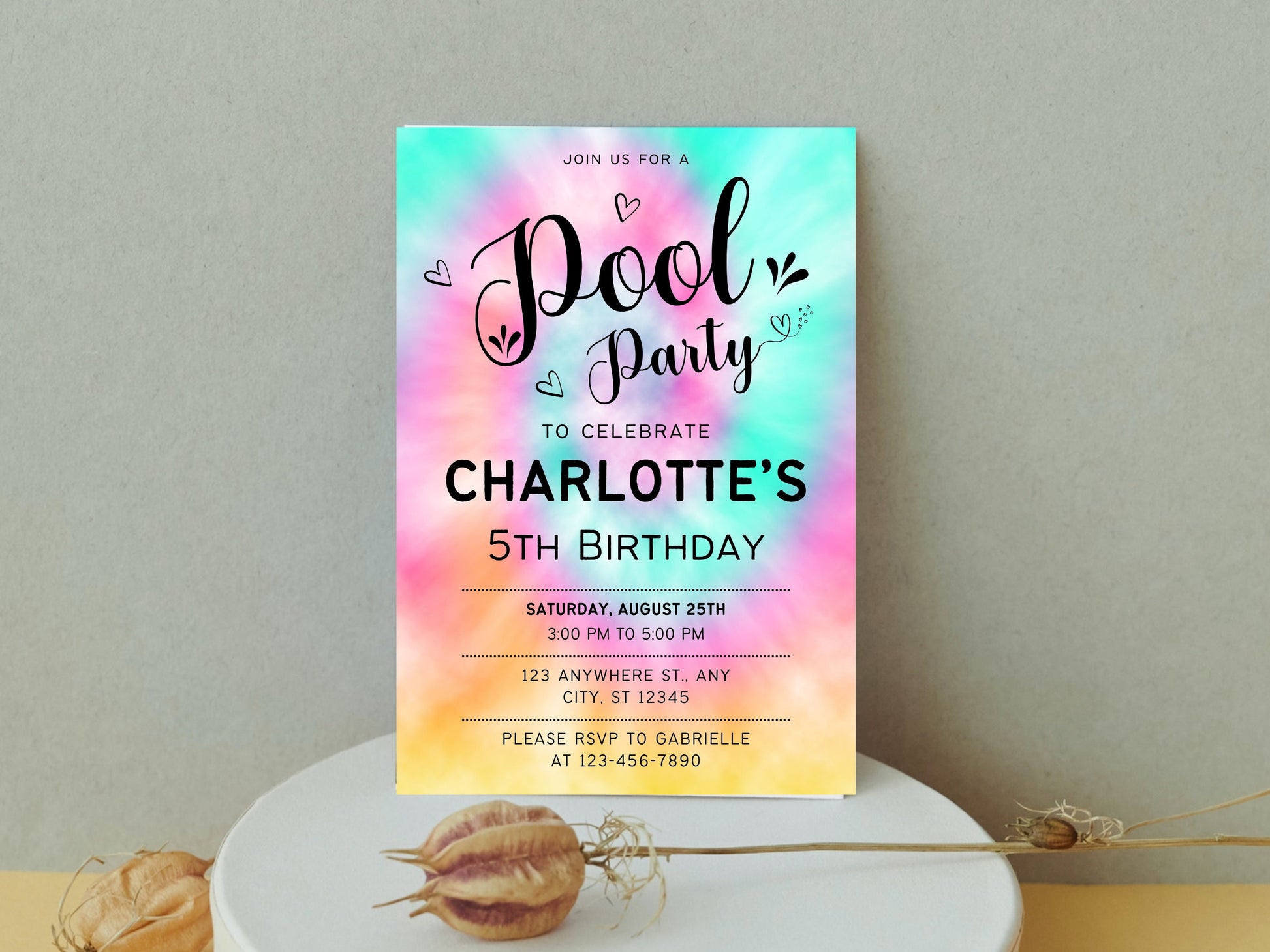 Geburtstagseinladung im Regenbogen-Tie-Dye-Stil, bearbeitbare Partyvorlage zum Ausdrucken (digitaler Download)