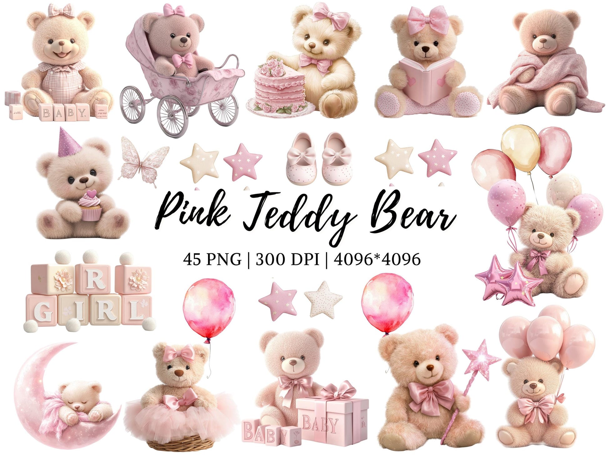 Diese Sammlung von 45 hochwertigen Cliparts mit rosa Teddybären ist perfekt, um jedem kreativen Projekt einen Hauch von Verspieltheit und Charme zu verleihen. Die hochauflösenden Designs mit transparentem Hintergrund eignen sich ideal für eine Vielzahl von Projekten – von Kindergeburtstagseinladungen über Kinderzimmerdekoration bis hin zu Scrapbooking und vielem mehr. Ob Sie individuelle Geschenke, digitale Planer oder Social-Media-Posts gestalten, diese niedlichen und vielseitigen Cliparts werden Ihre Arbeit garantiert aufwerten und jeder Kreation eine bezaubernde Note verleihen.