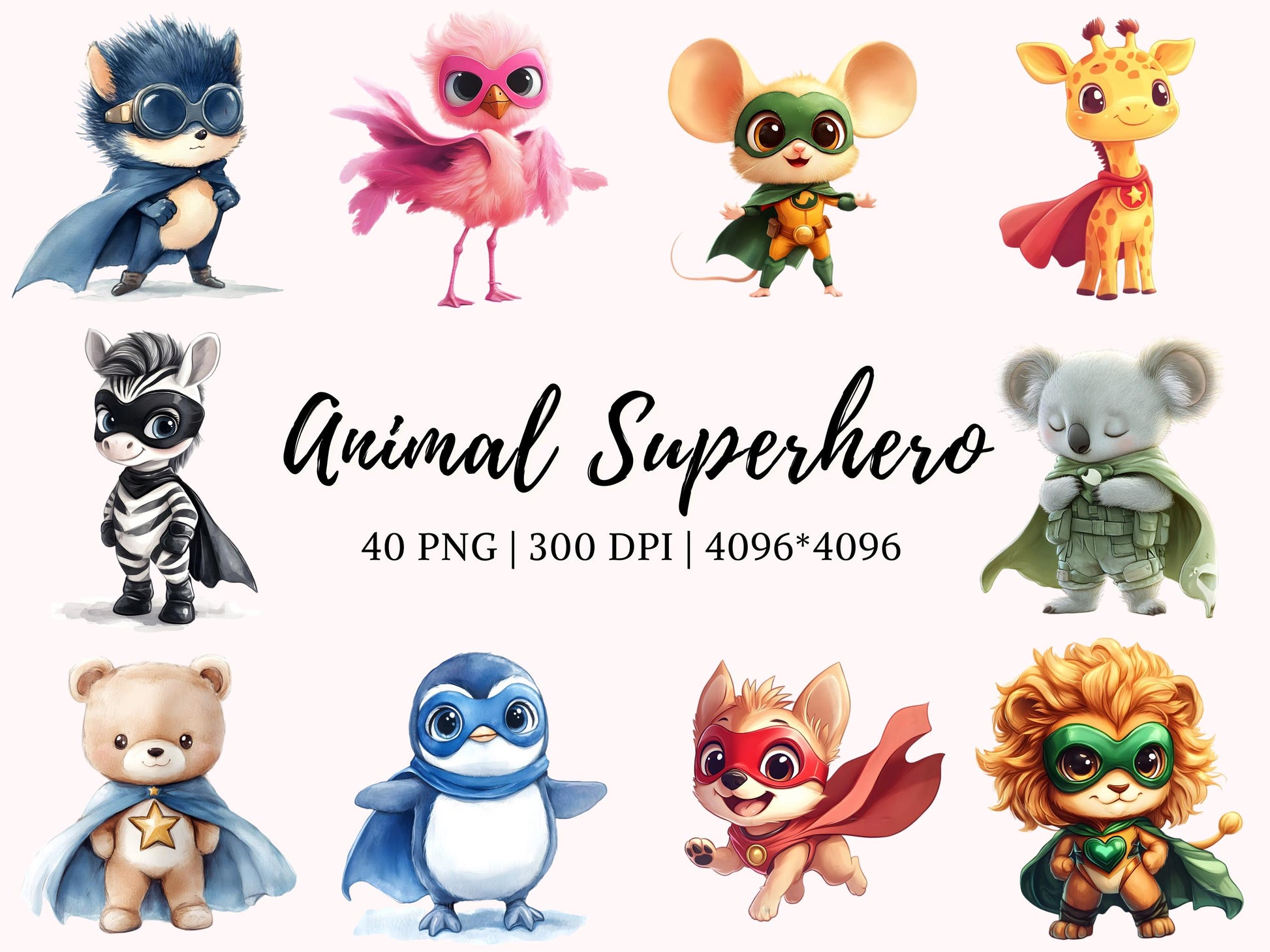 - 40 hochwertige Clipart-Bilddateien mit Tier-Superhelden und transparentem Hintergrund