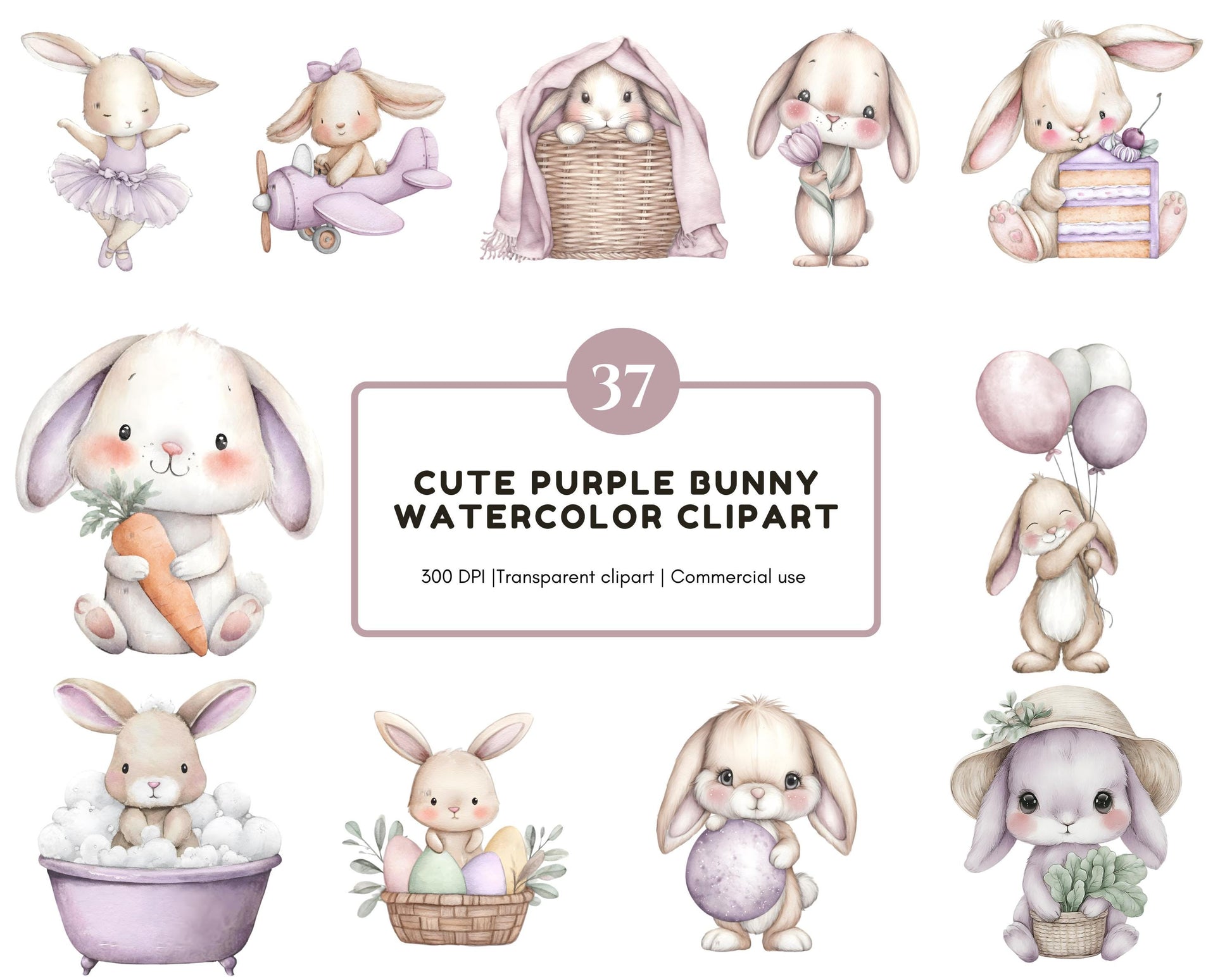 1) 37 hochwertige Clipart-Bilddateien mit niedlichen lila Hasen in Aquarelloptik und transparentem Hintergrund