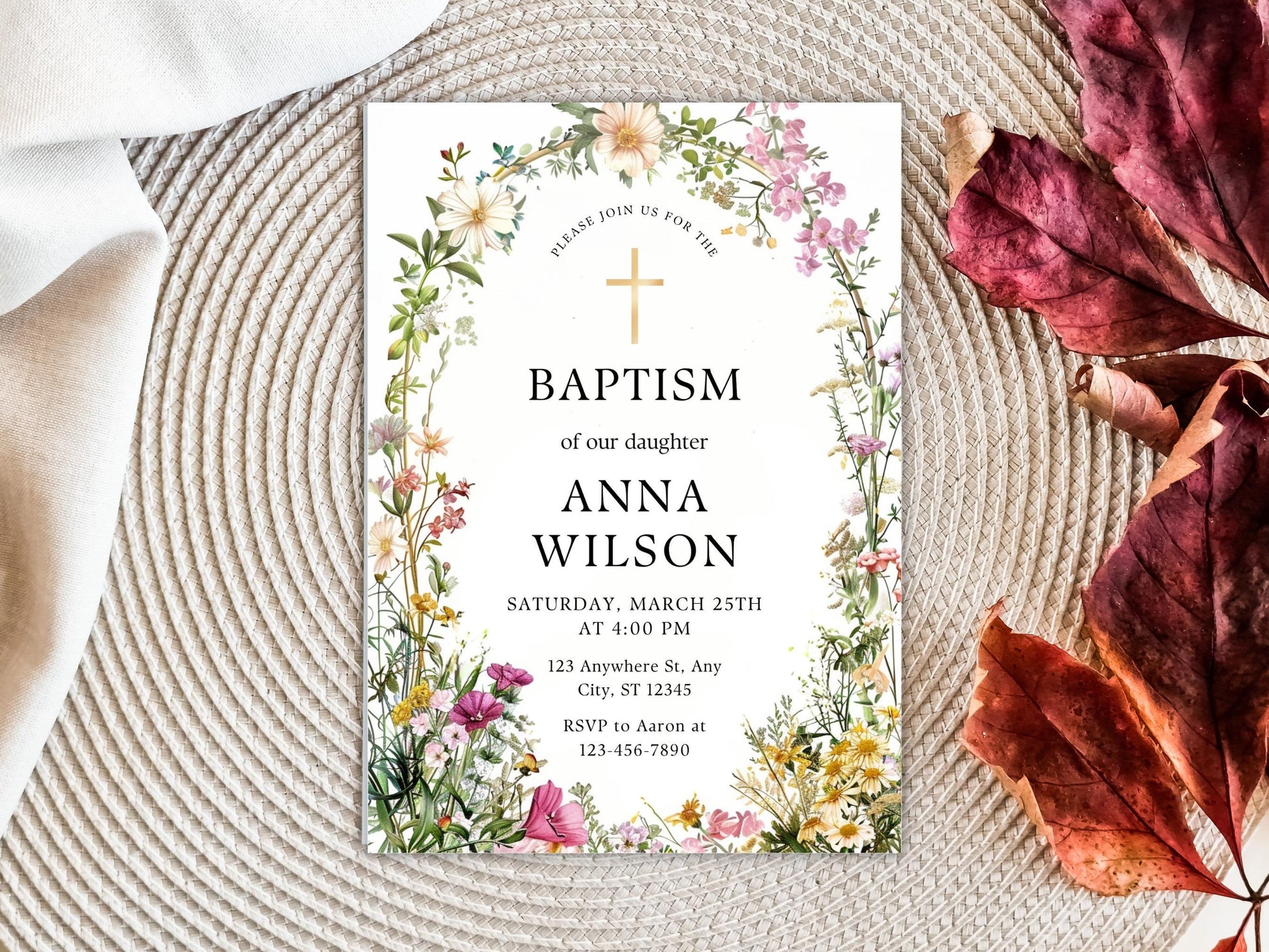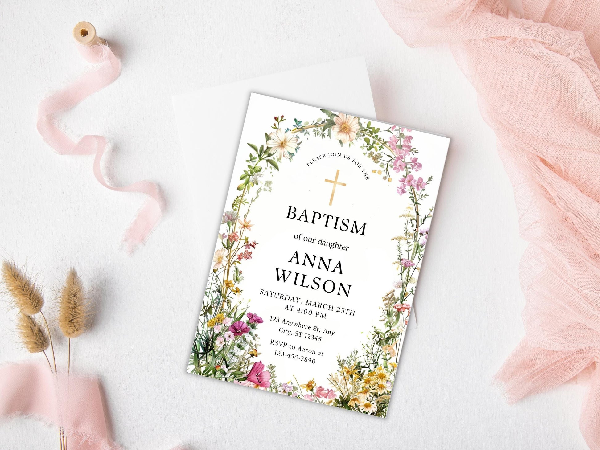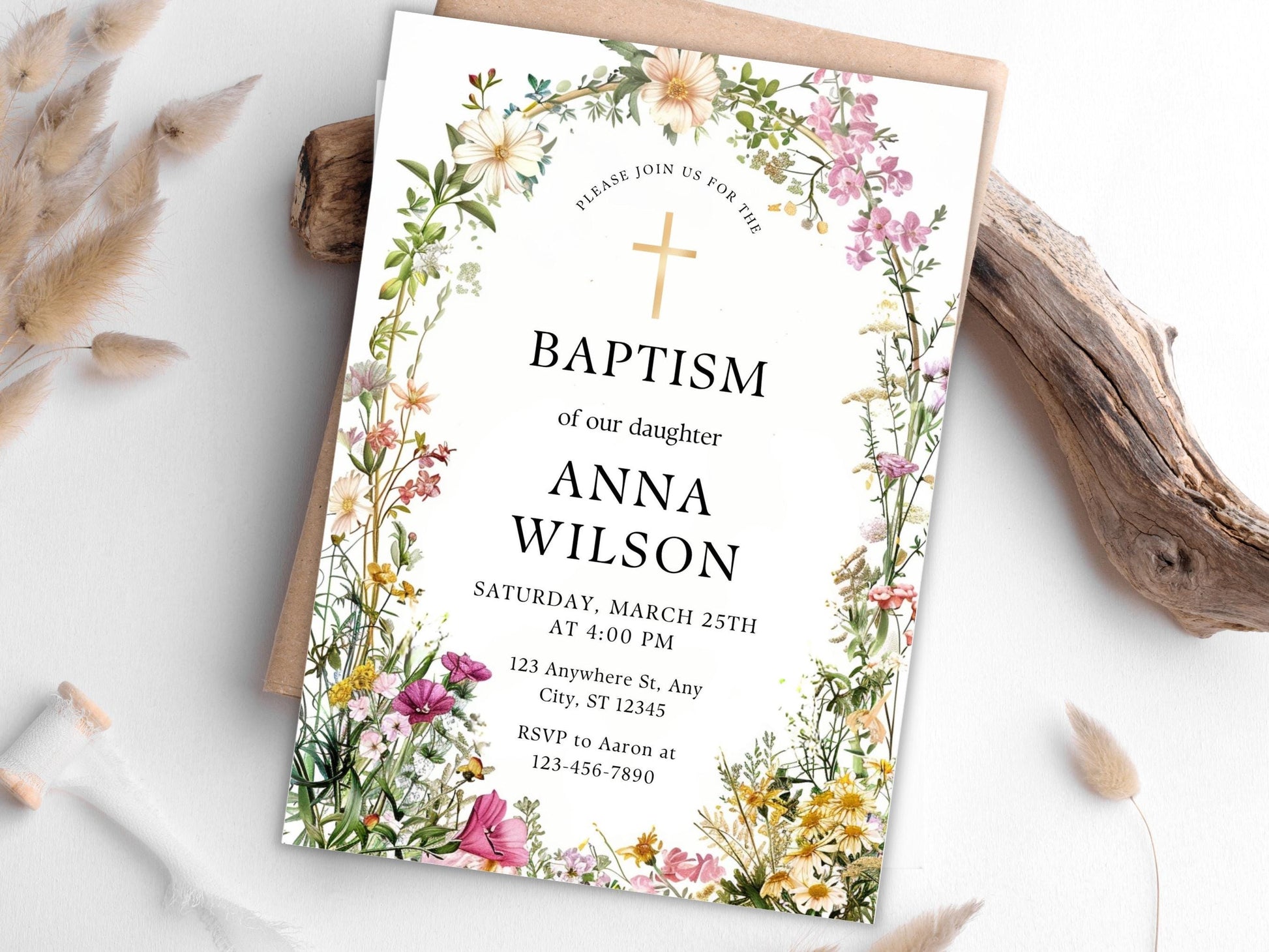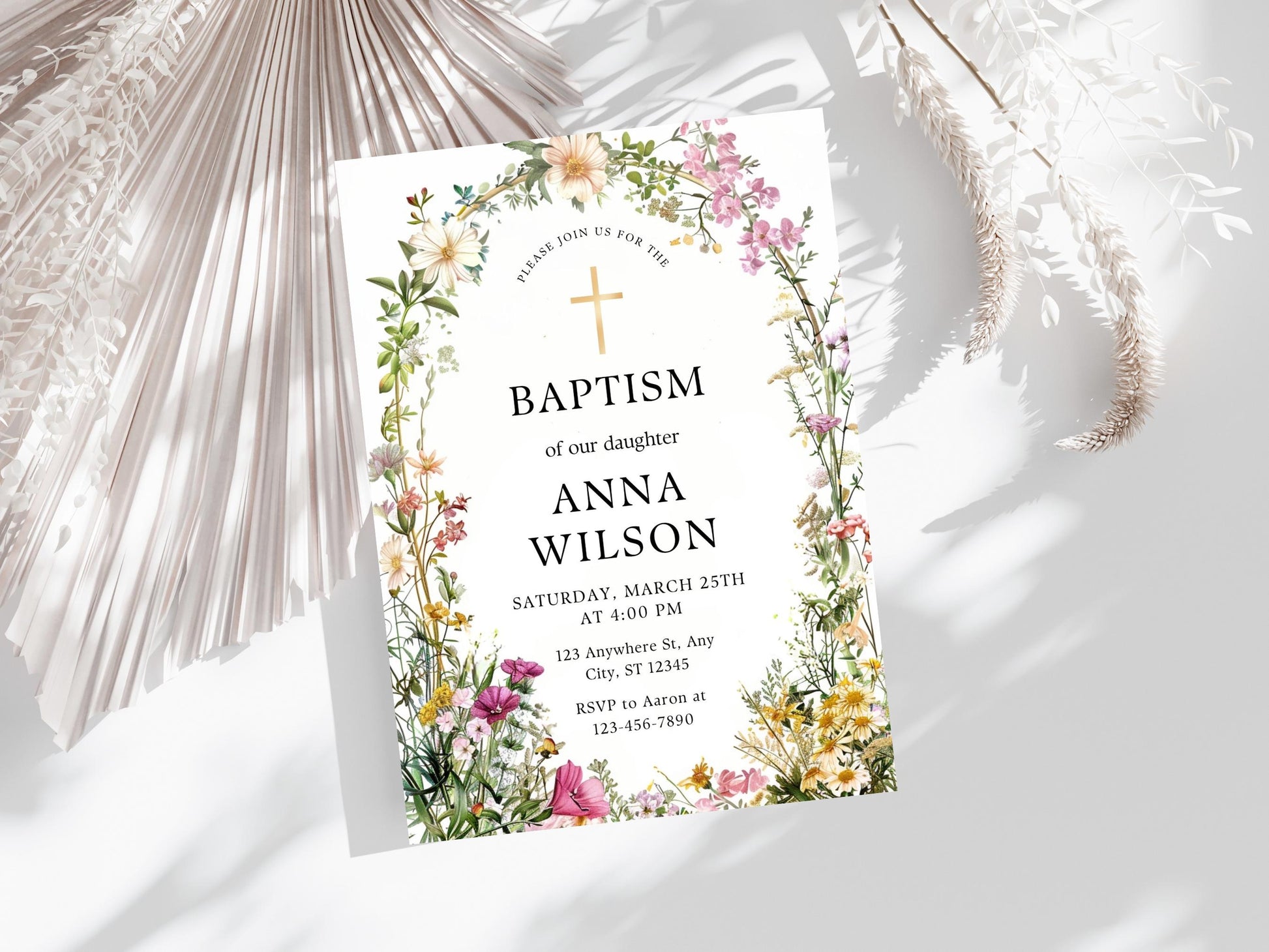 Einladungsvorlage zur Taufe mit Wildblumenmotiv, Tauf-Einladung für Mädchen, Online-Tauf-Einladung, Druckbare Tauf-Einladung, Einladung zur Taufe mit Grünpflanzenmotiv