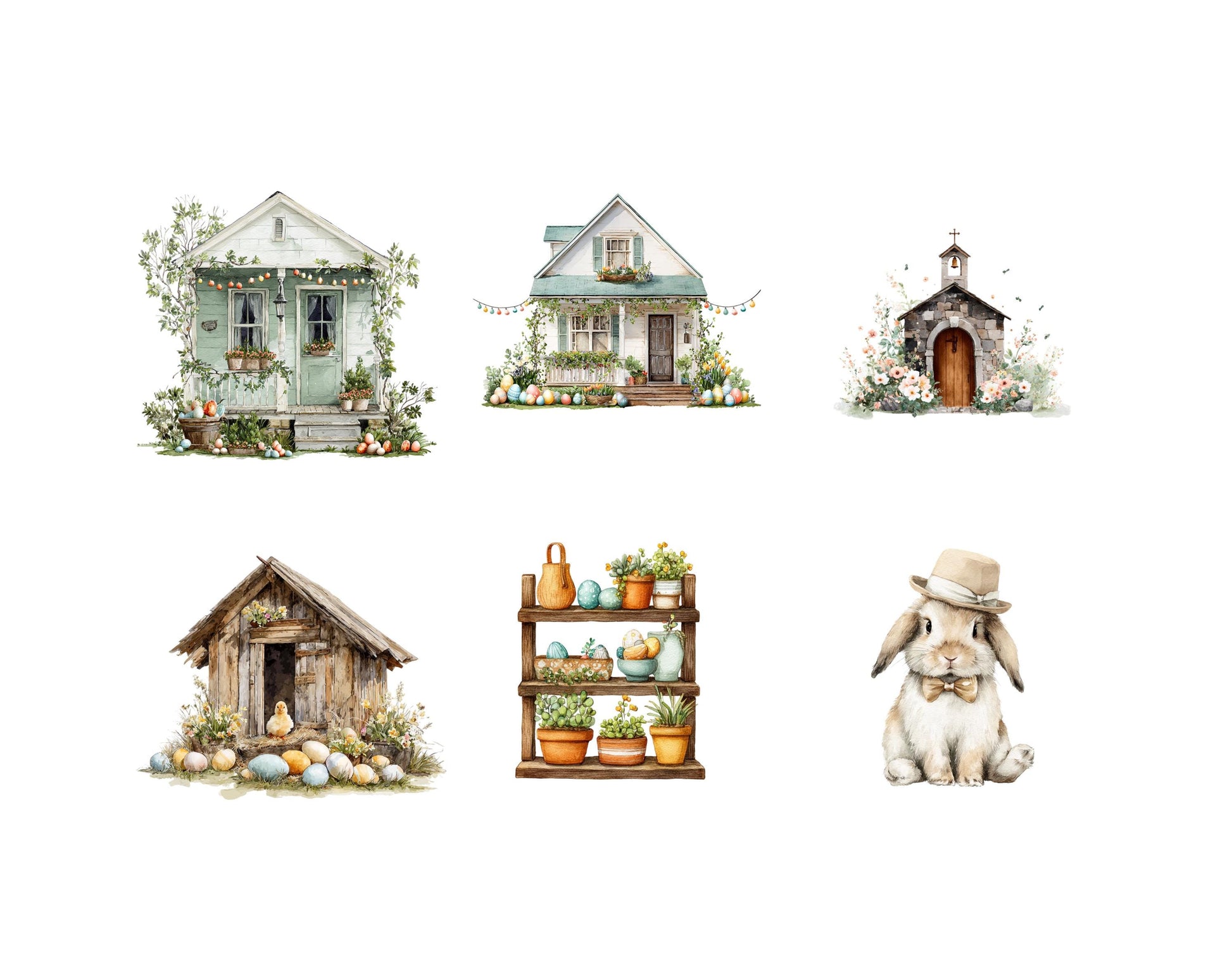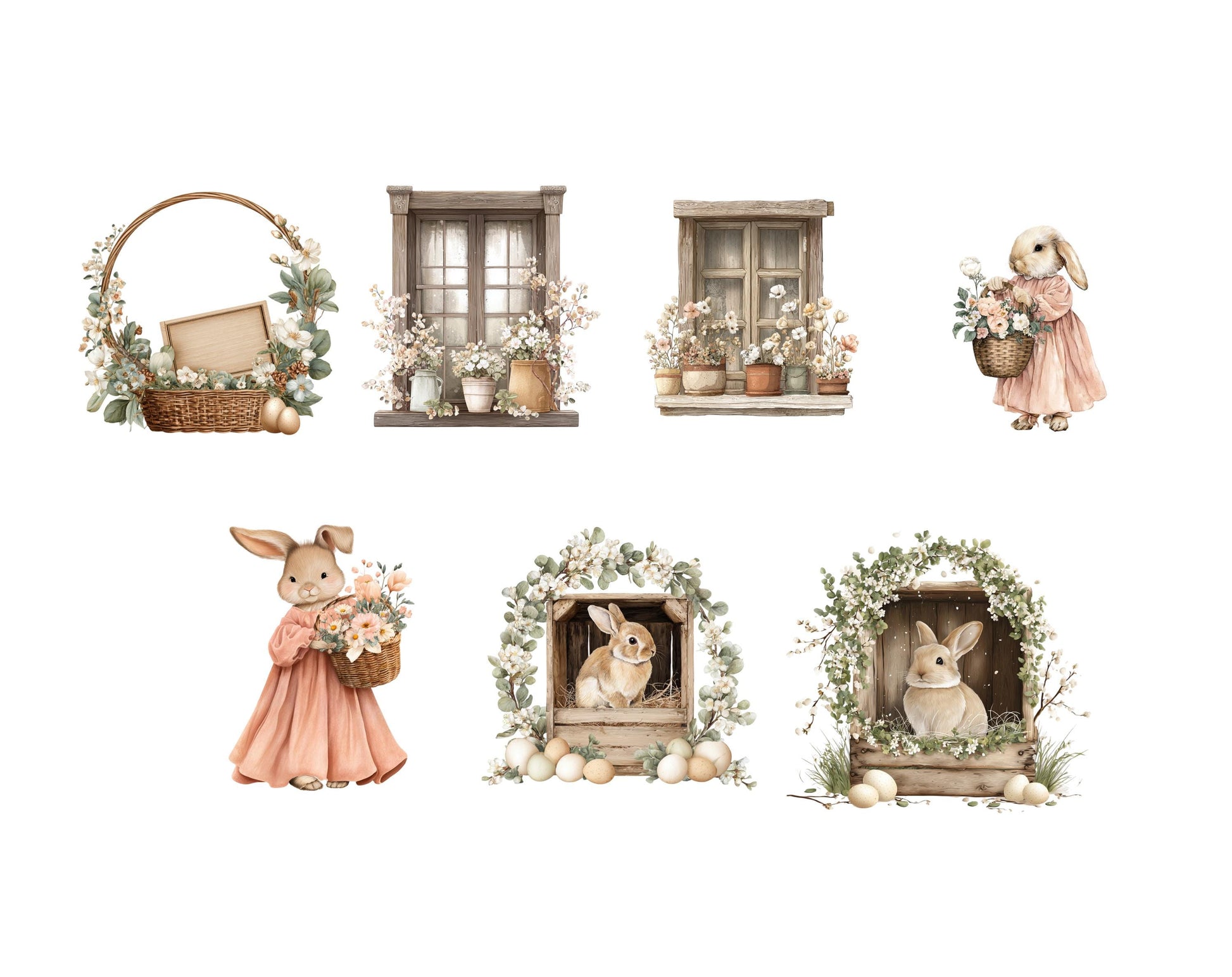 Lot de 82 images clipart rustiques de Pâques : lapin de Pâques aquarelle (PNG), panier de Pâques, style bohème, village de Pâques (PNG).