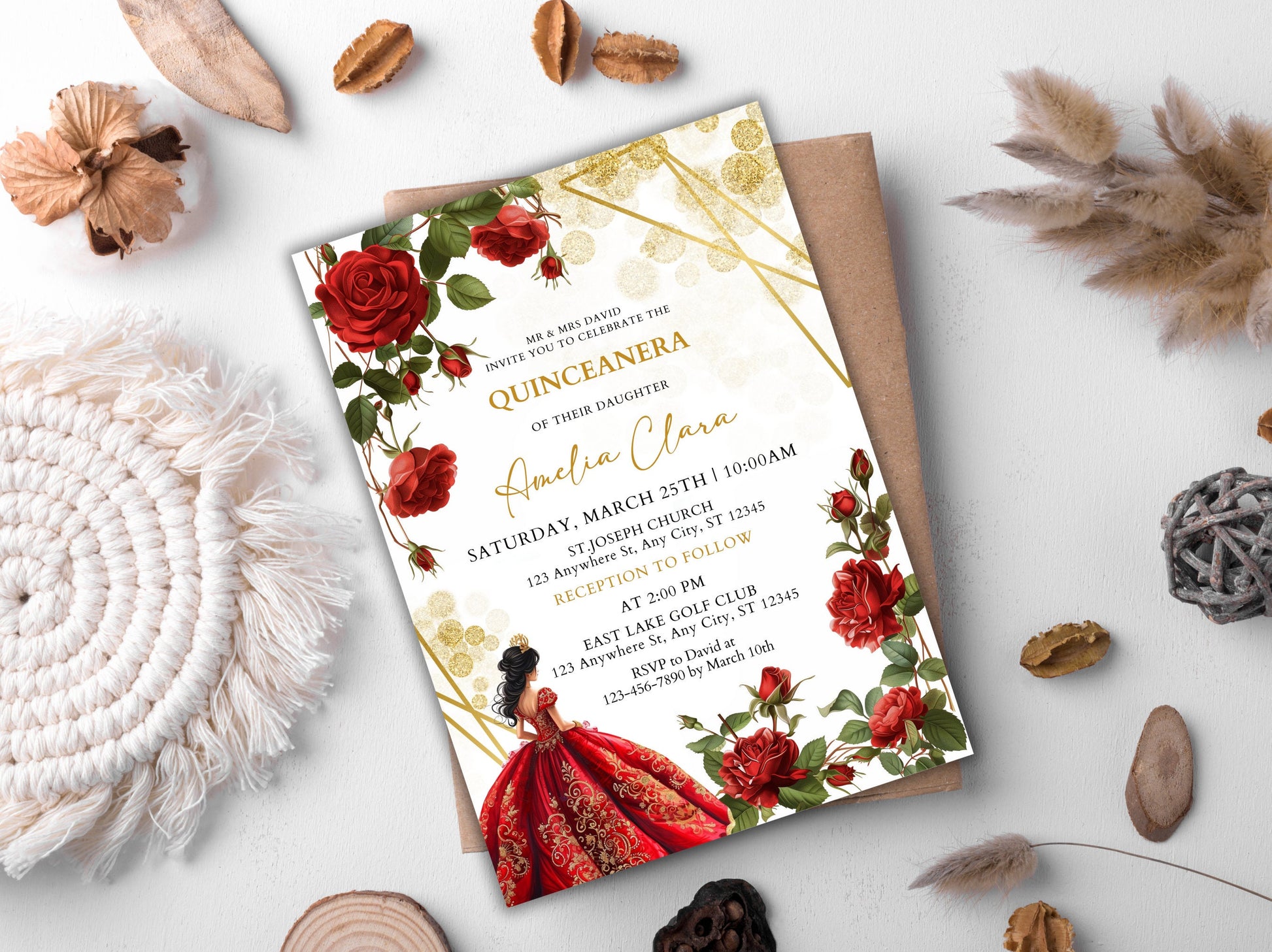 Invitation Quinceañera rouge et or de Bourgogne, Invitation d’anniversaire Mis Quince Emerald Red Rose, Floral Mis Quince Anos, Téléchargement instantané