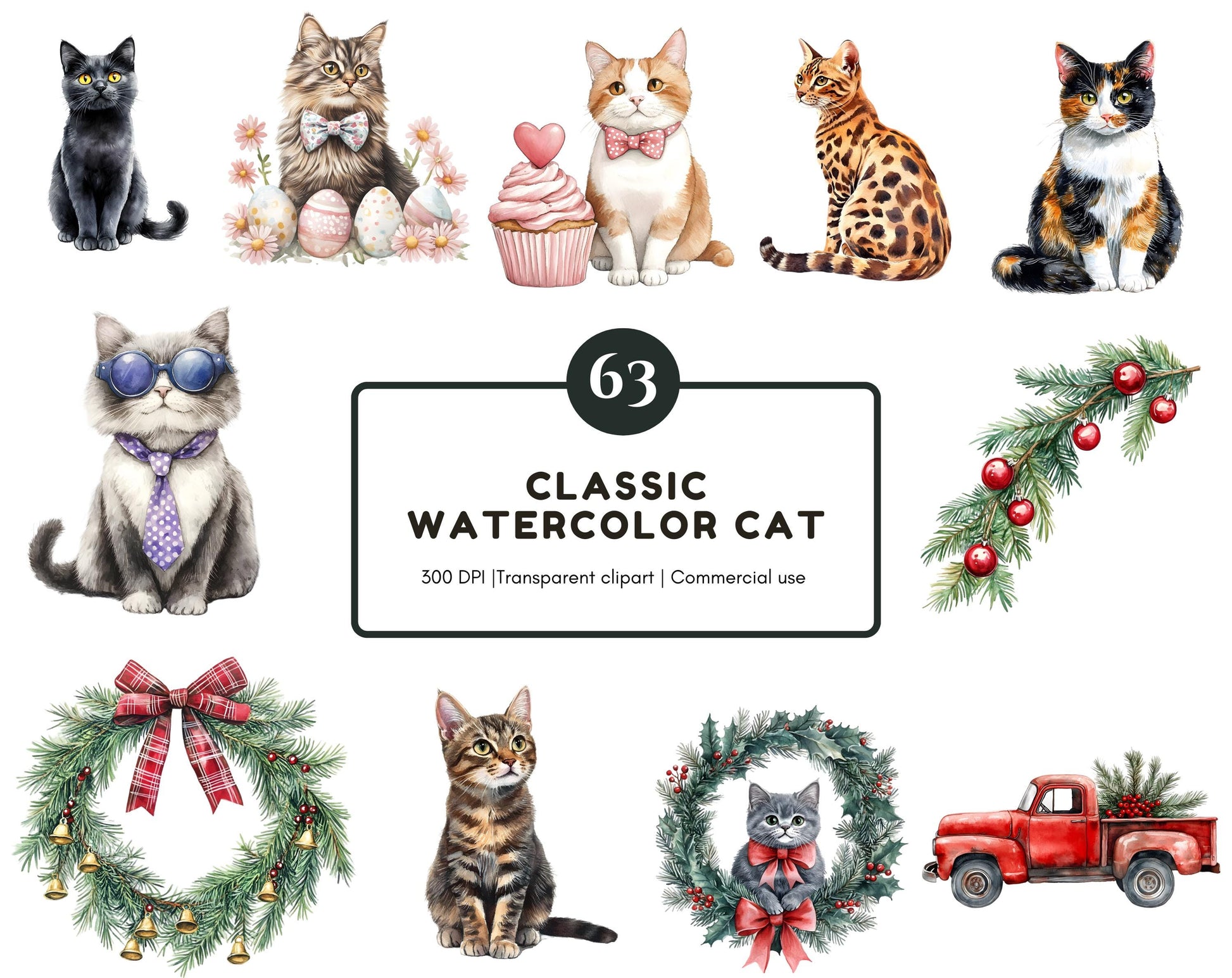 Ensemble d'images clipart de chats classiques, PNG de chats classiques, images clipart d'animaux à l'aquarelle, images clipart de chats mignons, PNG de chats, images clipart d'éléments de fêtes, téléchargement instantané
