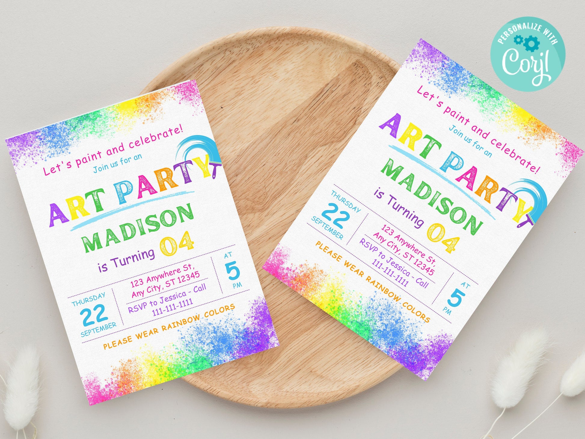 Invitation pour une fête de peinture colorée, thème arc-en-ciel (modifiable, téléchargement instantané)
