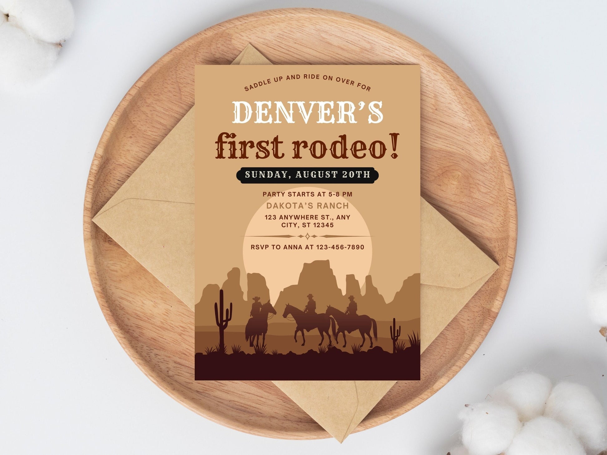 Invitation d'anniversaire sur le thème du rodéo pour un premier anniversaire de cowboy, Far West (Modèle Canva modifiable)