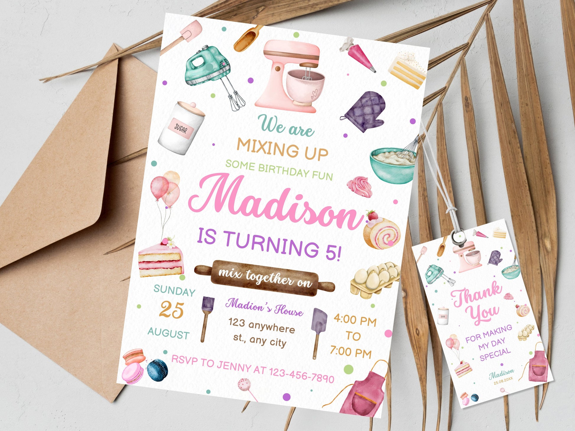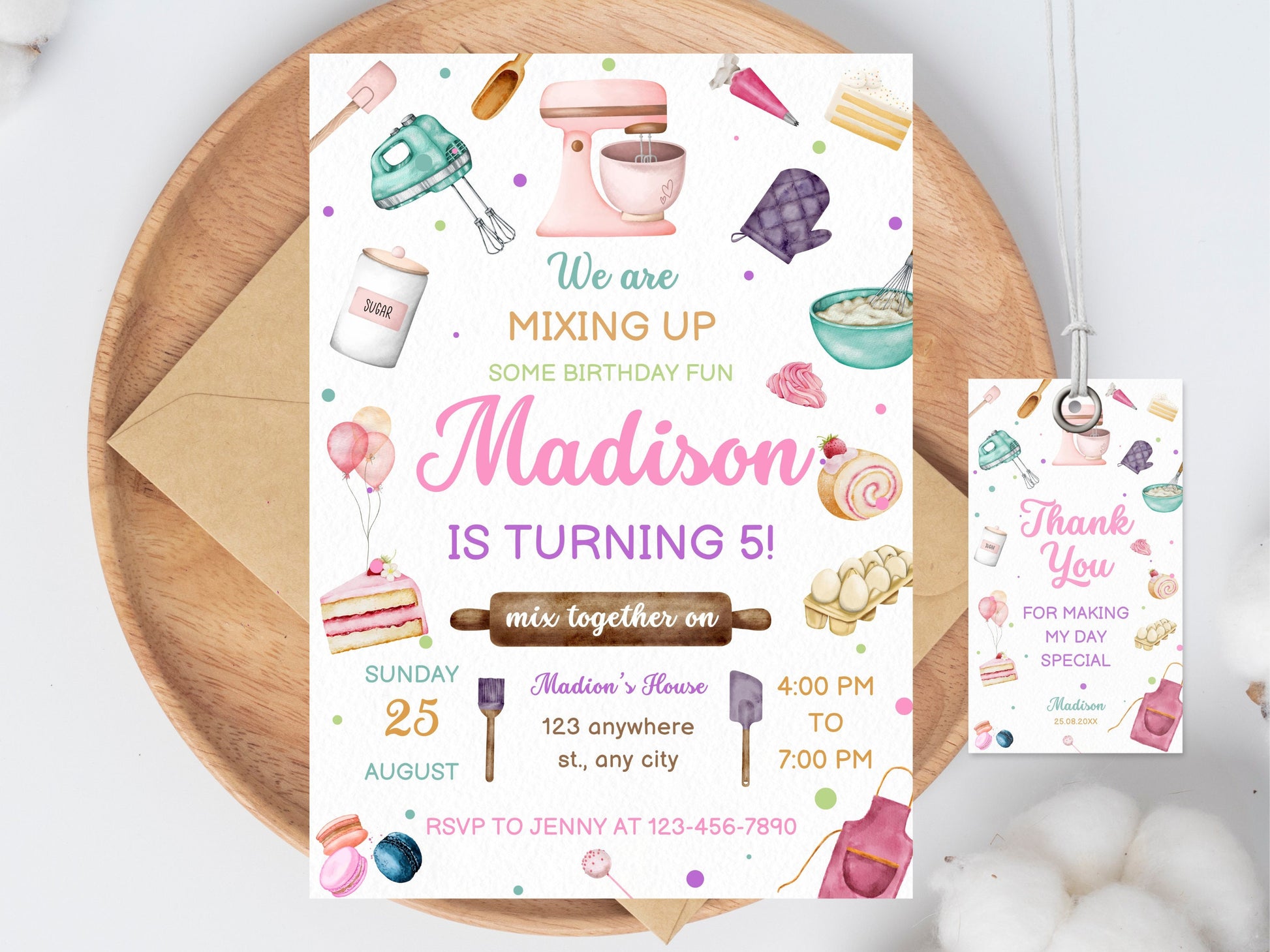 Invitation d'anniversaire sur le thème de la pâtisserie (modifiable), étiquette de remerciement pour la cuisine (téléchargement instantané)