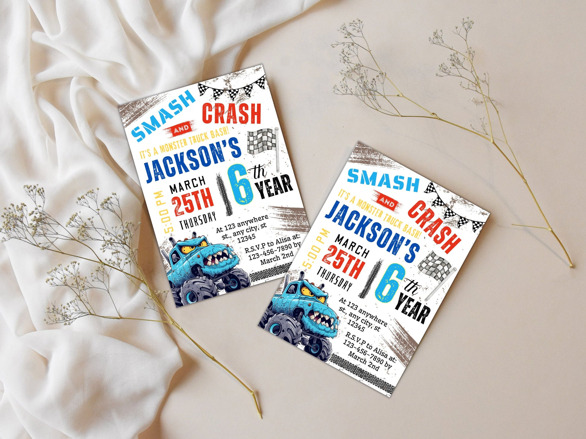 Transformez votre prochain anniversaire en un événement inoubliable grâce à notre modèle d'invitation d'anniversaire Monster Truck entièrement personnalisable ! Conçu sur Canva, ce modèle vous permet de personnaliser chaque détail en toute simplicité.