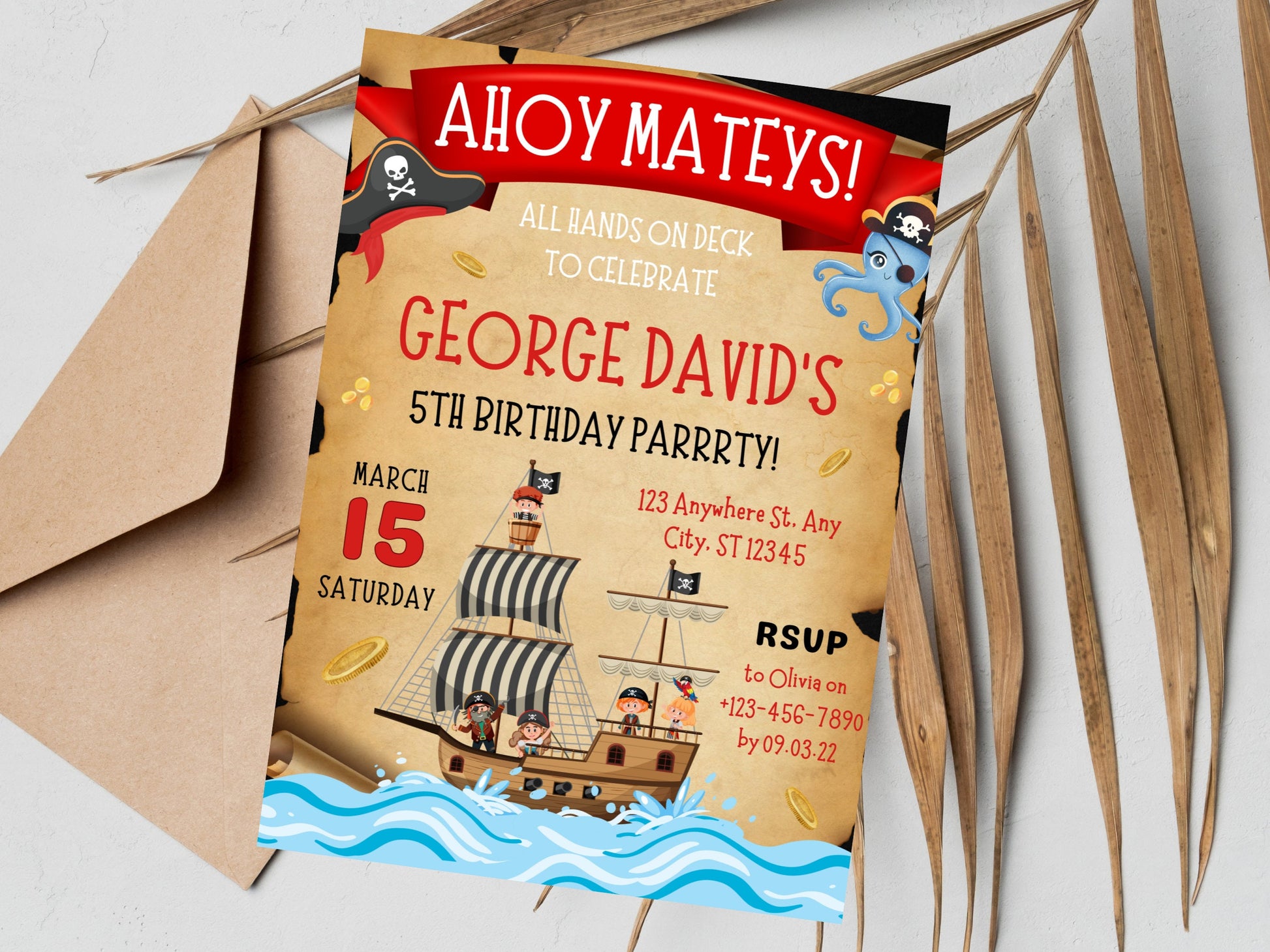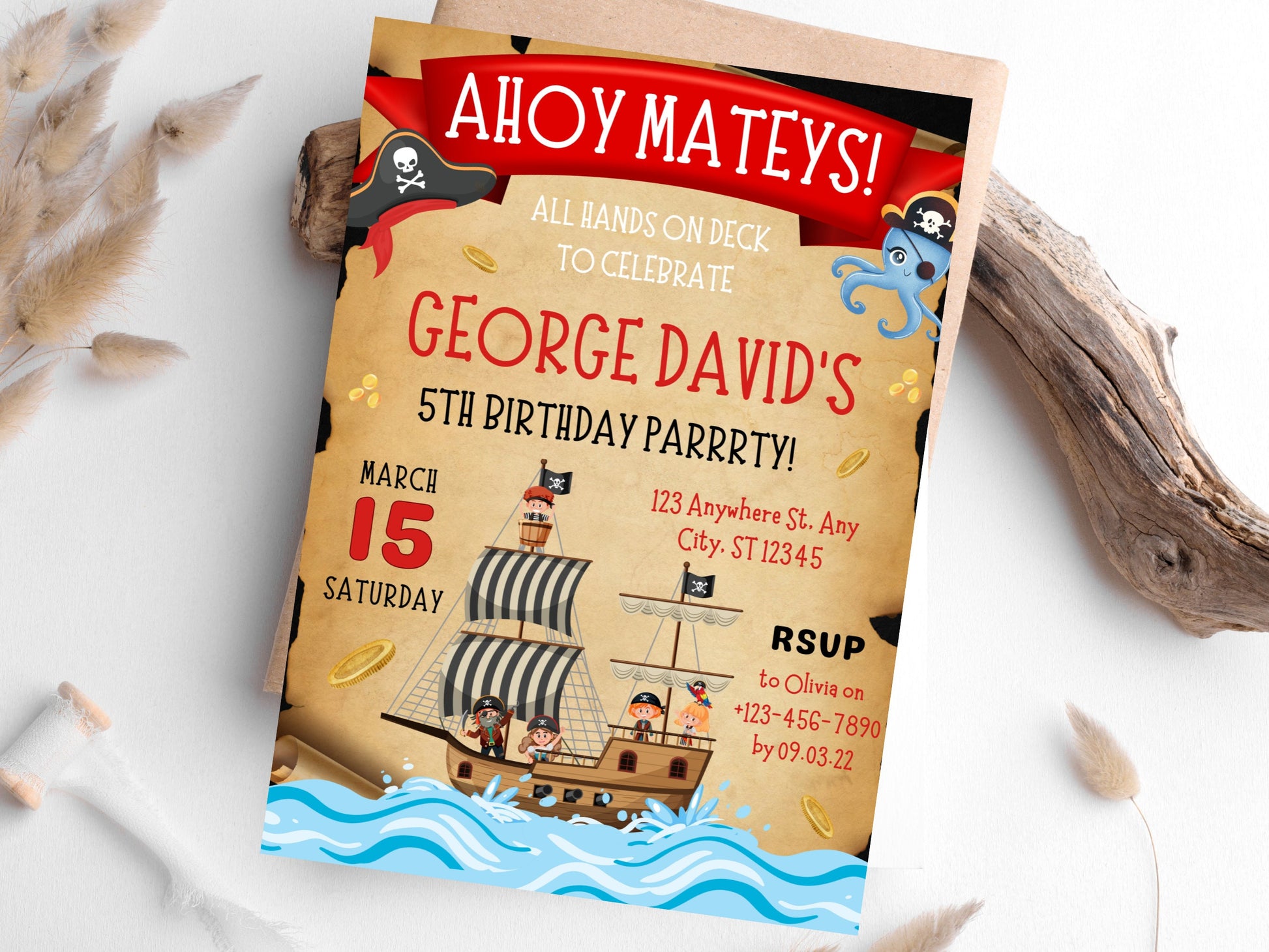 Modèle d'invitation d'anniversaire pirate modifiable, fête d'enfants (téléchargement instantané)