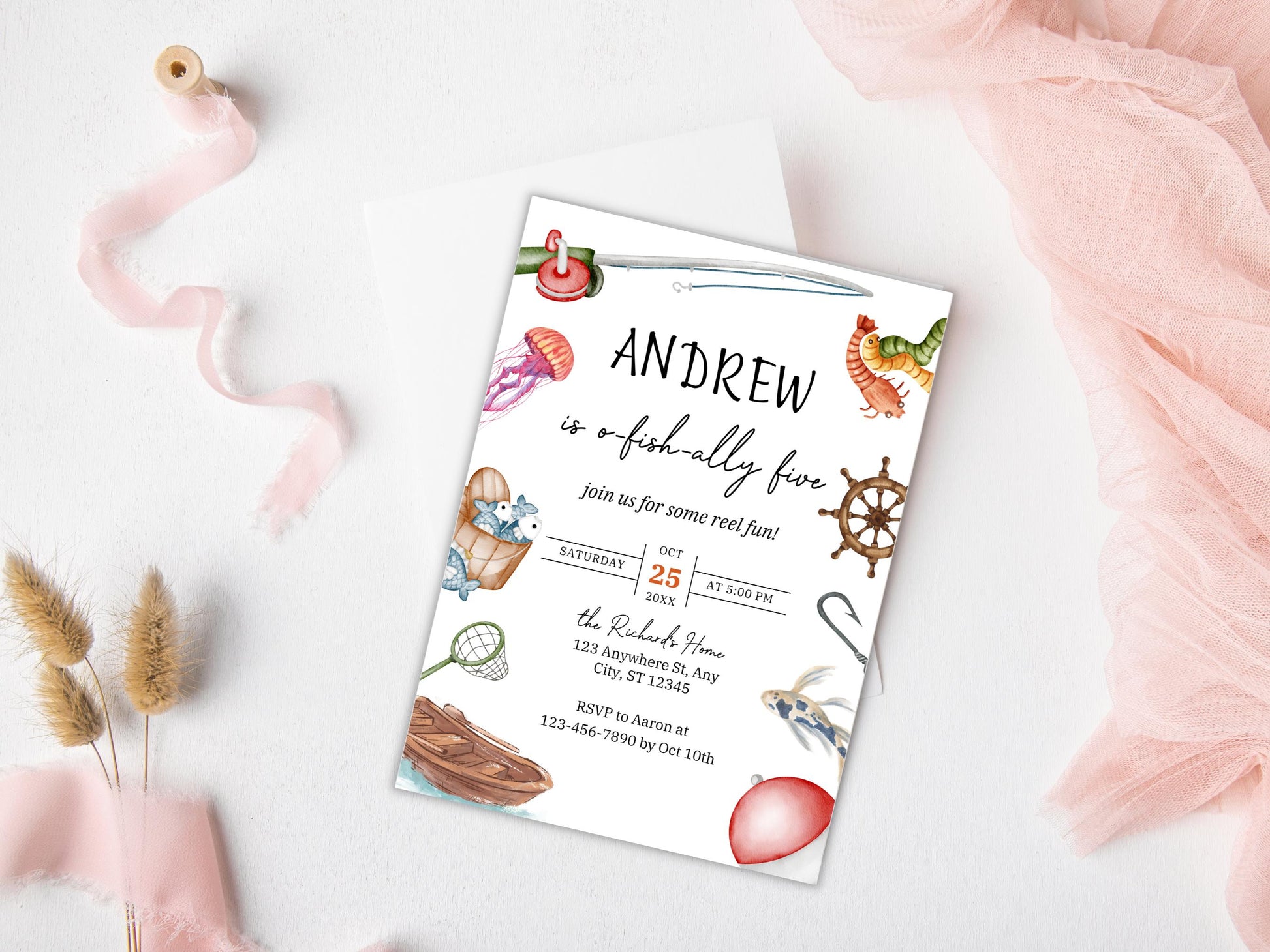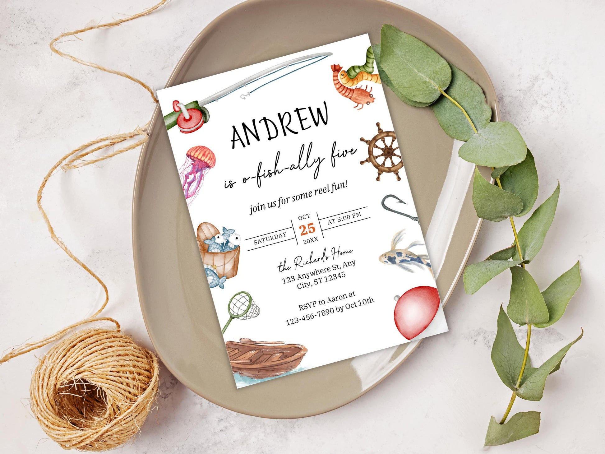 Invitation d'anniversaire sur le thème de la pêche, O-Fish-Ally One, modèle modifiable (téléchargement numérique)
