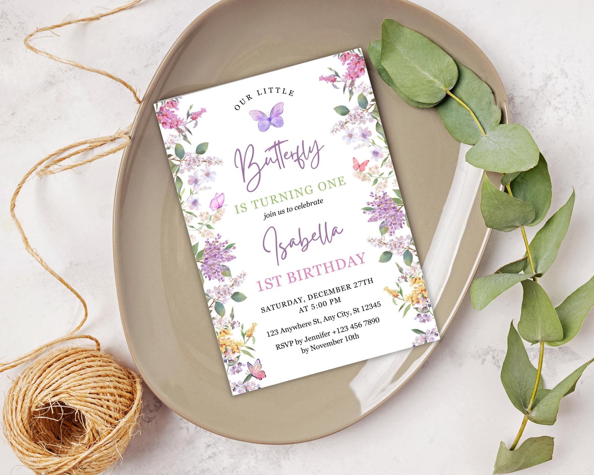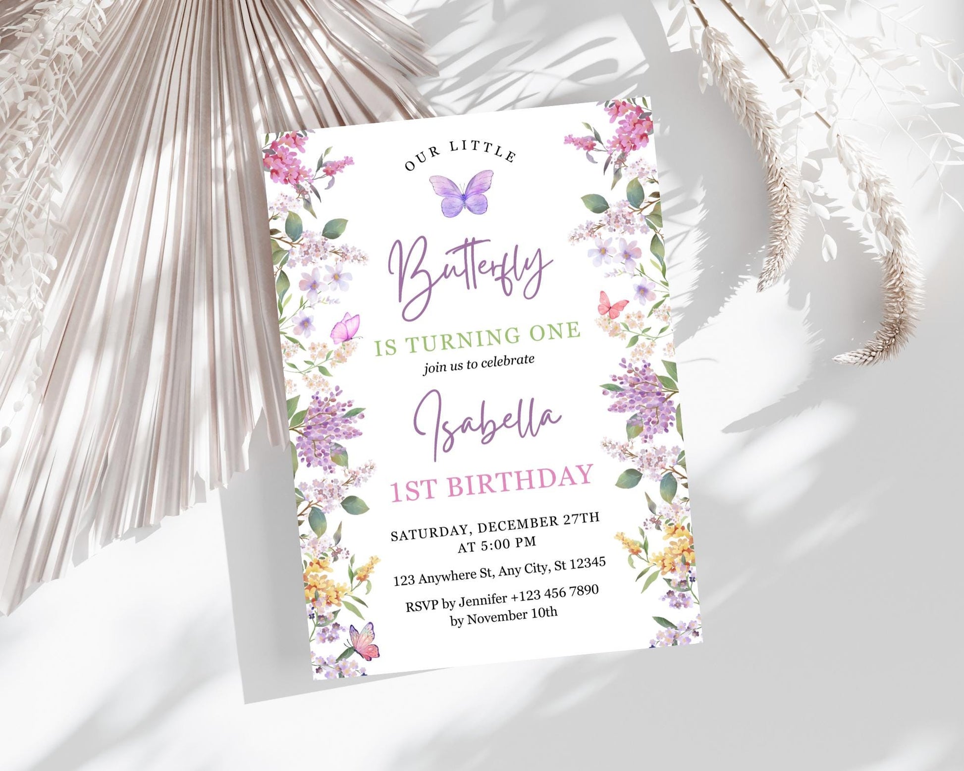 Invitation d'anniversaire papillon fleuri, invitation pour le 1er anniversaire sur le thème des papillons, fête d'anniversaire papillon pour fille, modèle Canva modifiable, téléchargement instantané