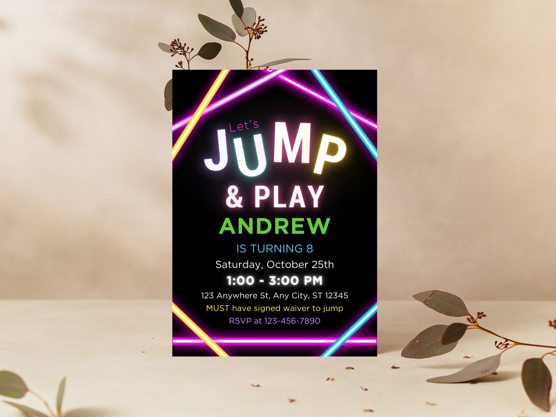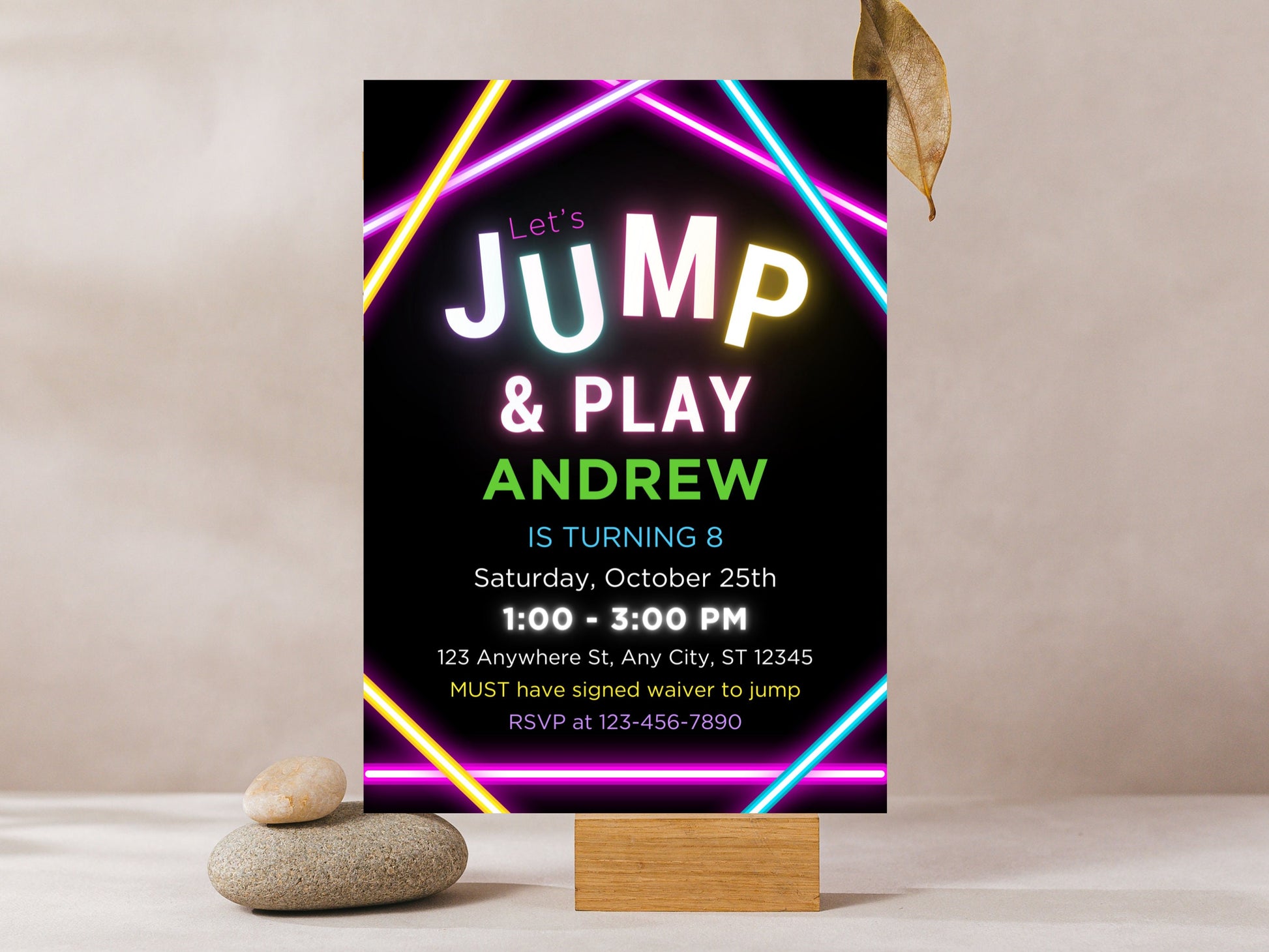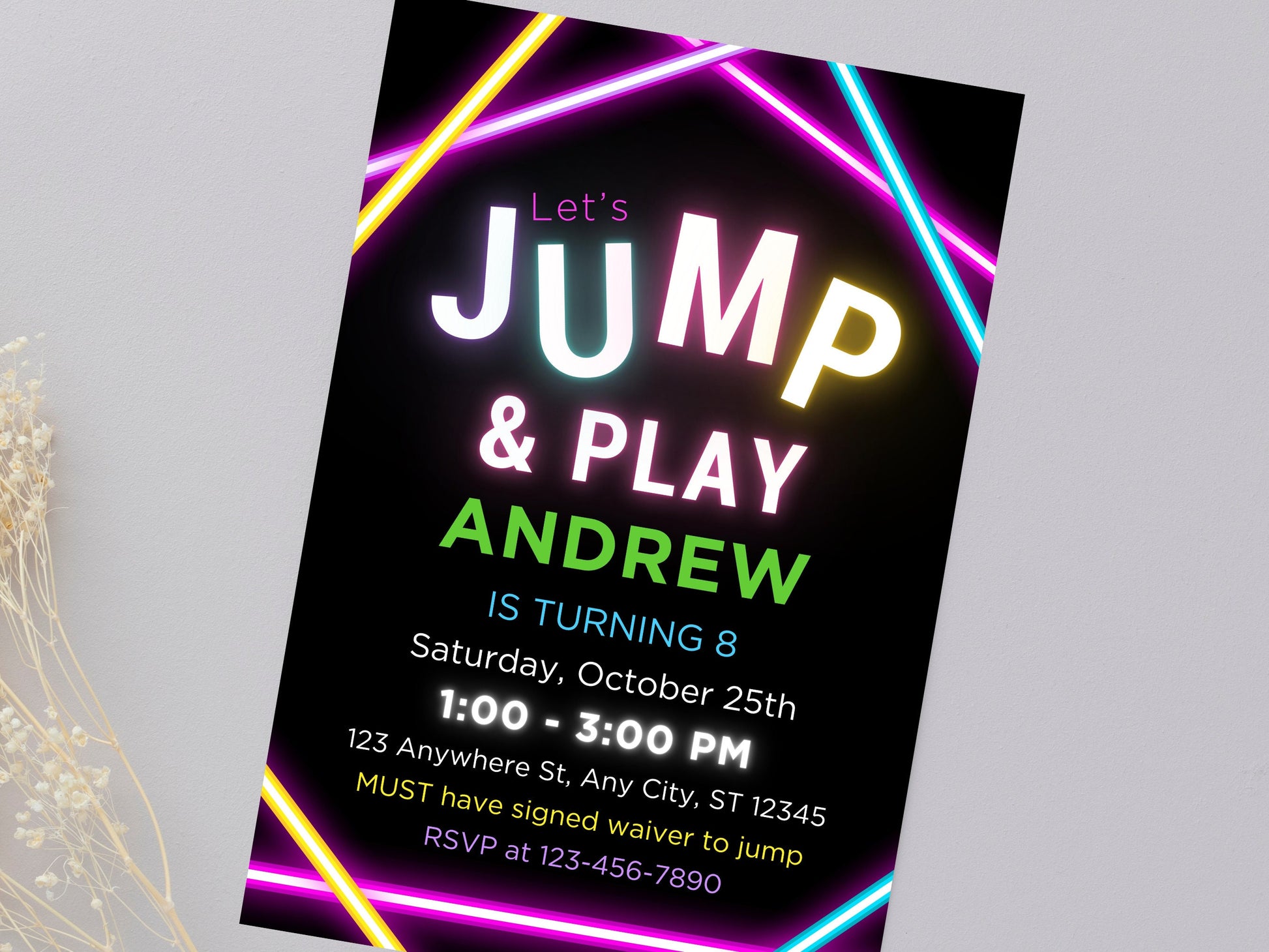 Invitation d'anniversaire sur le thème du saut, effet néon, modèle modifiable (téléchargement instantané)
