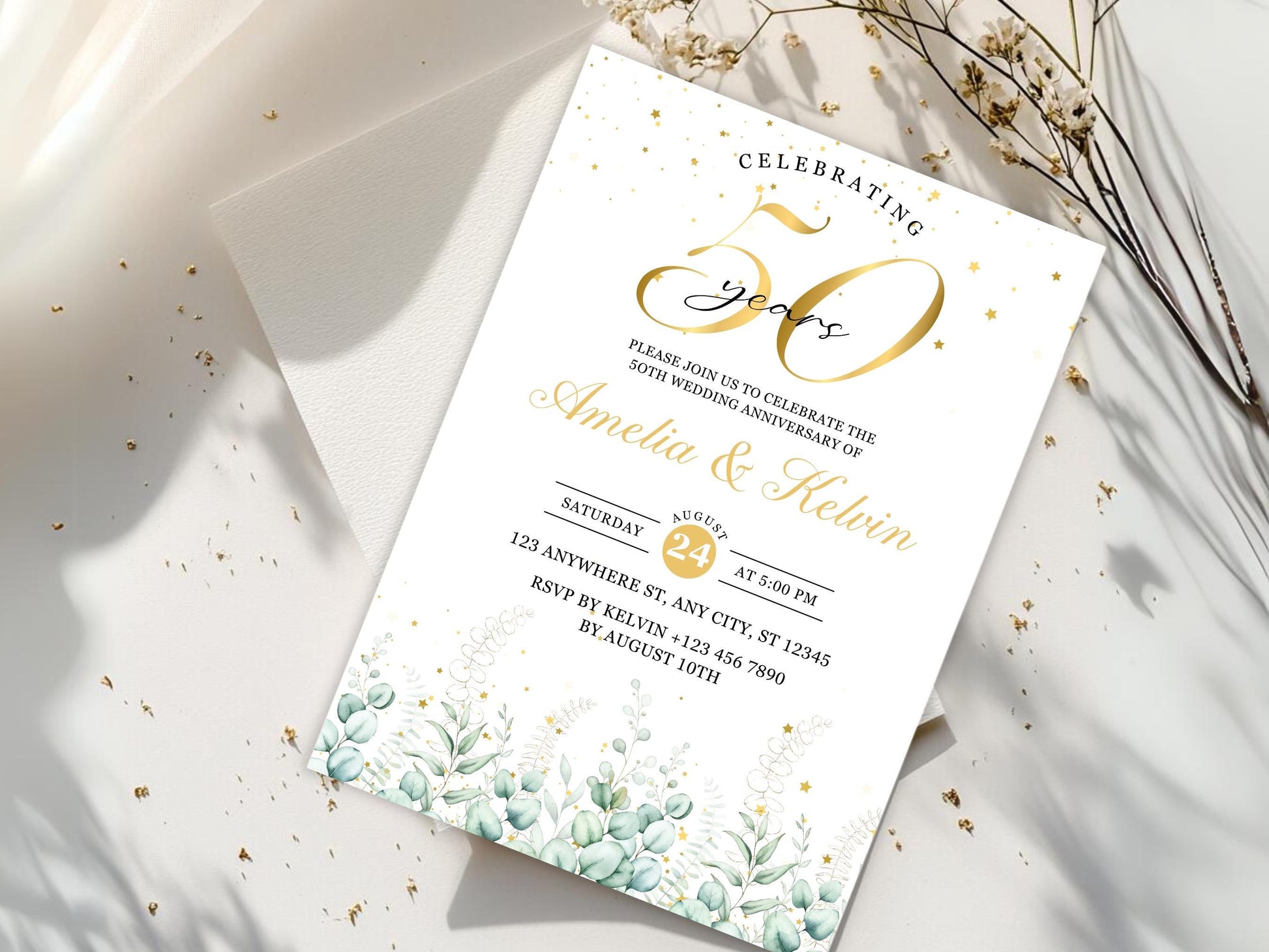 50th Anniversary Invitation: Elegant Eucalyptus Photo Template (Digital Download)
