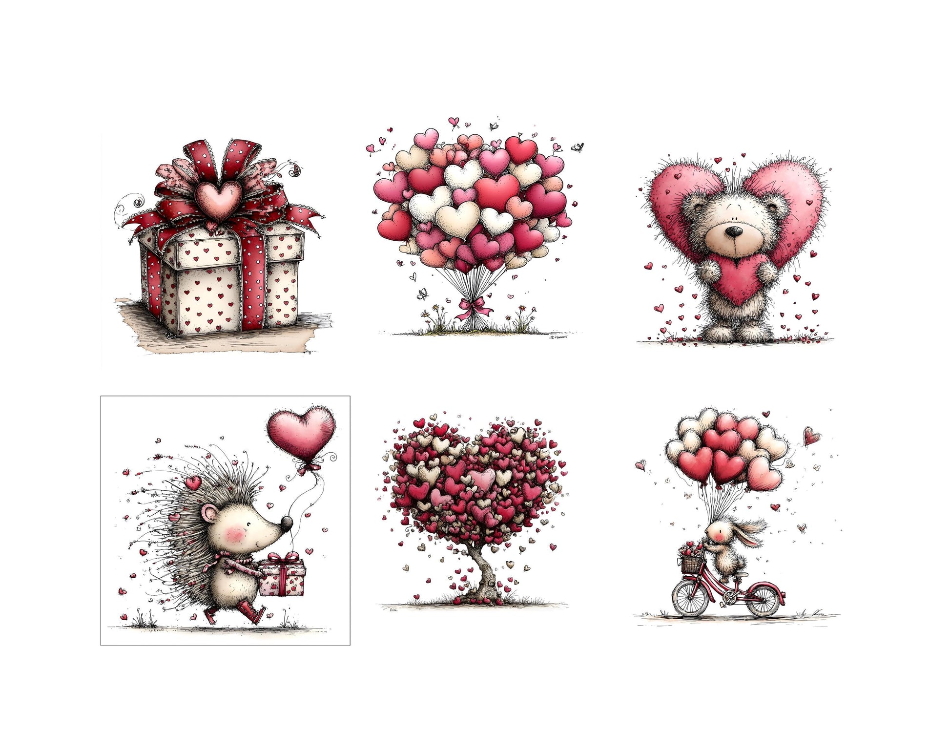 This set of 58 high-quality Whimsical Valentine's Day clipart illustrations is ideal for infusing creativity and charm into any project. Showcasing high-resolution graphics with transparent backgrounds, these whimsical images are perfect for a variety of uses, from children's party invitations to nursery decorations, scrapbooking, and beyond. Whether you’re designing personalized gifts, digital planners, or social media graphics, these charming and adaptable clipart illustrations are guaranteed to elevate your work and bring a delightful flair to every project.
