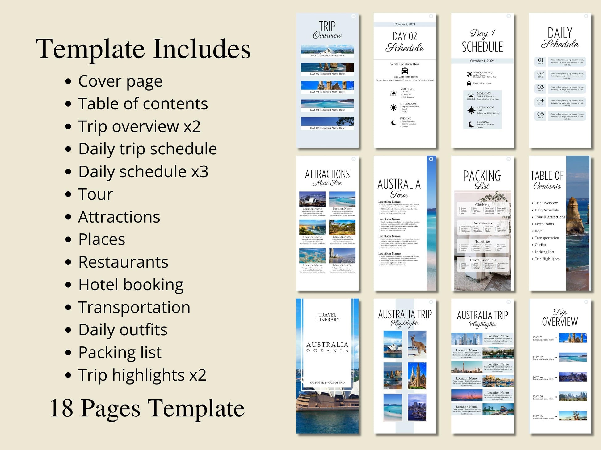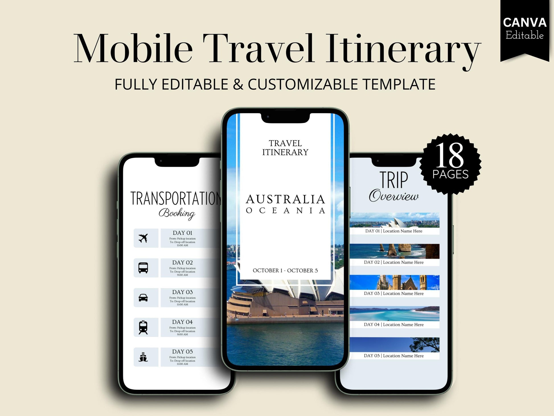 Plan your Australia trip with ease using this Mobile Travel Itinerary Template! This editable digital planner is designed for travellers who want to stay organized and make the most of every day. With 18 pages, including daily schedules, attractions, restaurants, transportation, packing lists, and more, this template keeps all your travel details in one place.