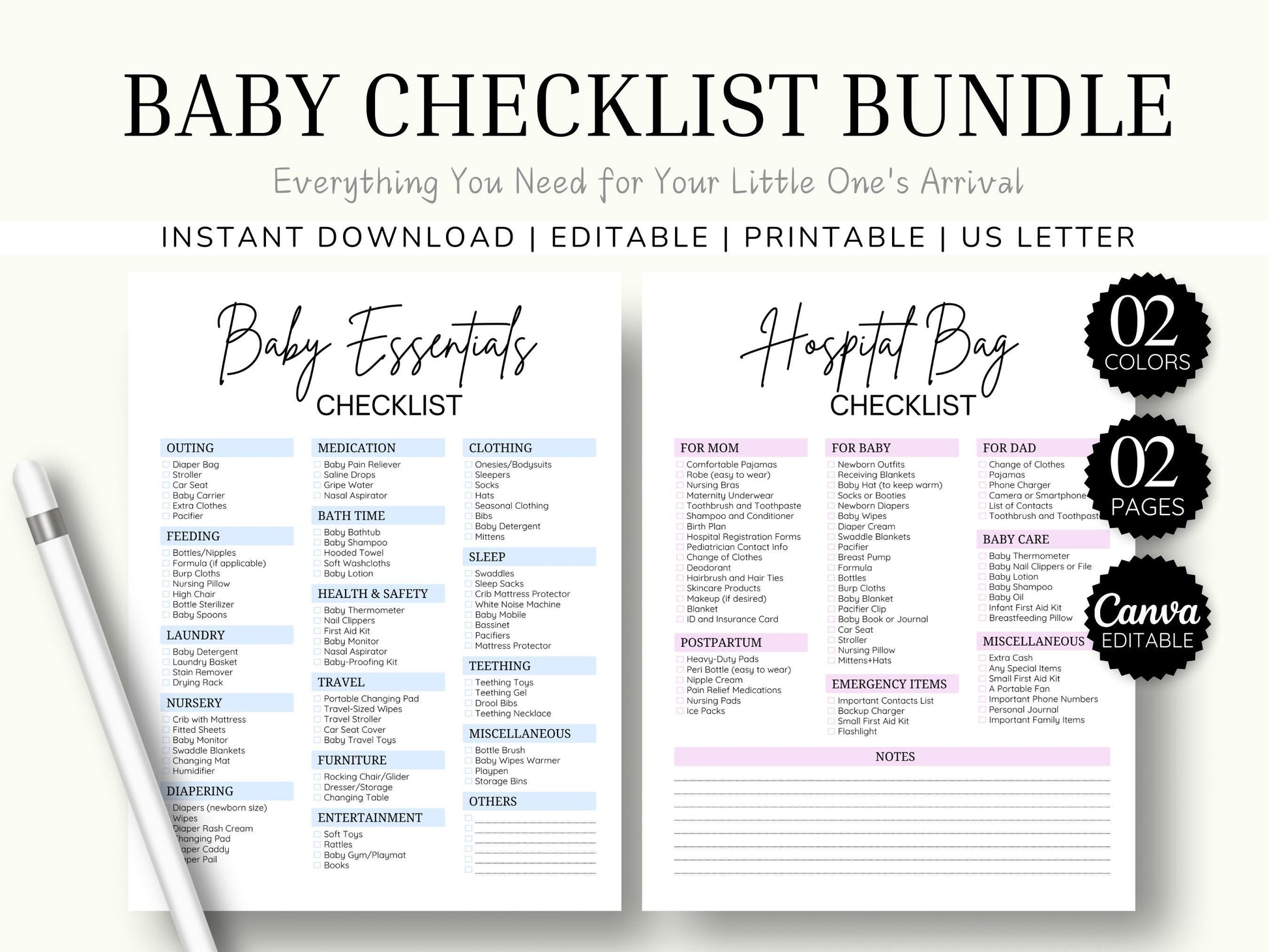 Editable in Canva: Customize the checklist to suit your needs using the free Canva platform. Change colors, add your own notes, or upload personal images, making it the perfect baby planner.