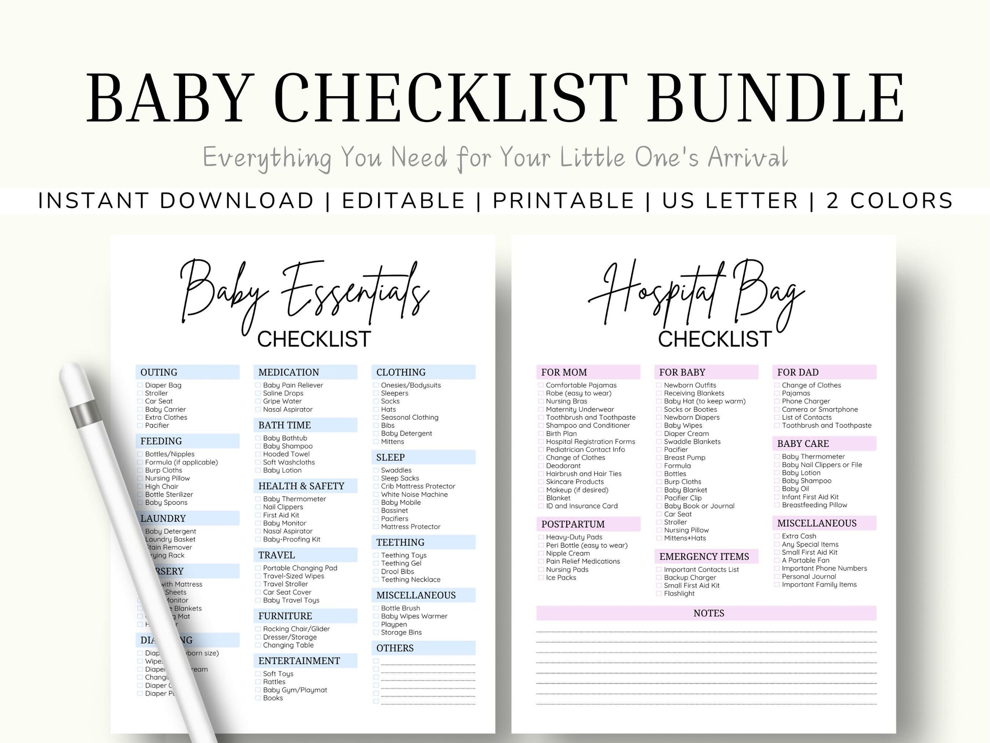 Four Pages of Checklists: Two color options (Baby Pink for girls and Baby Blue for boys), with two pages each for a total of four pages.