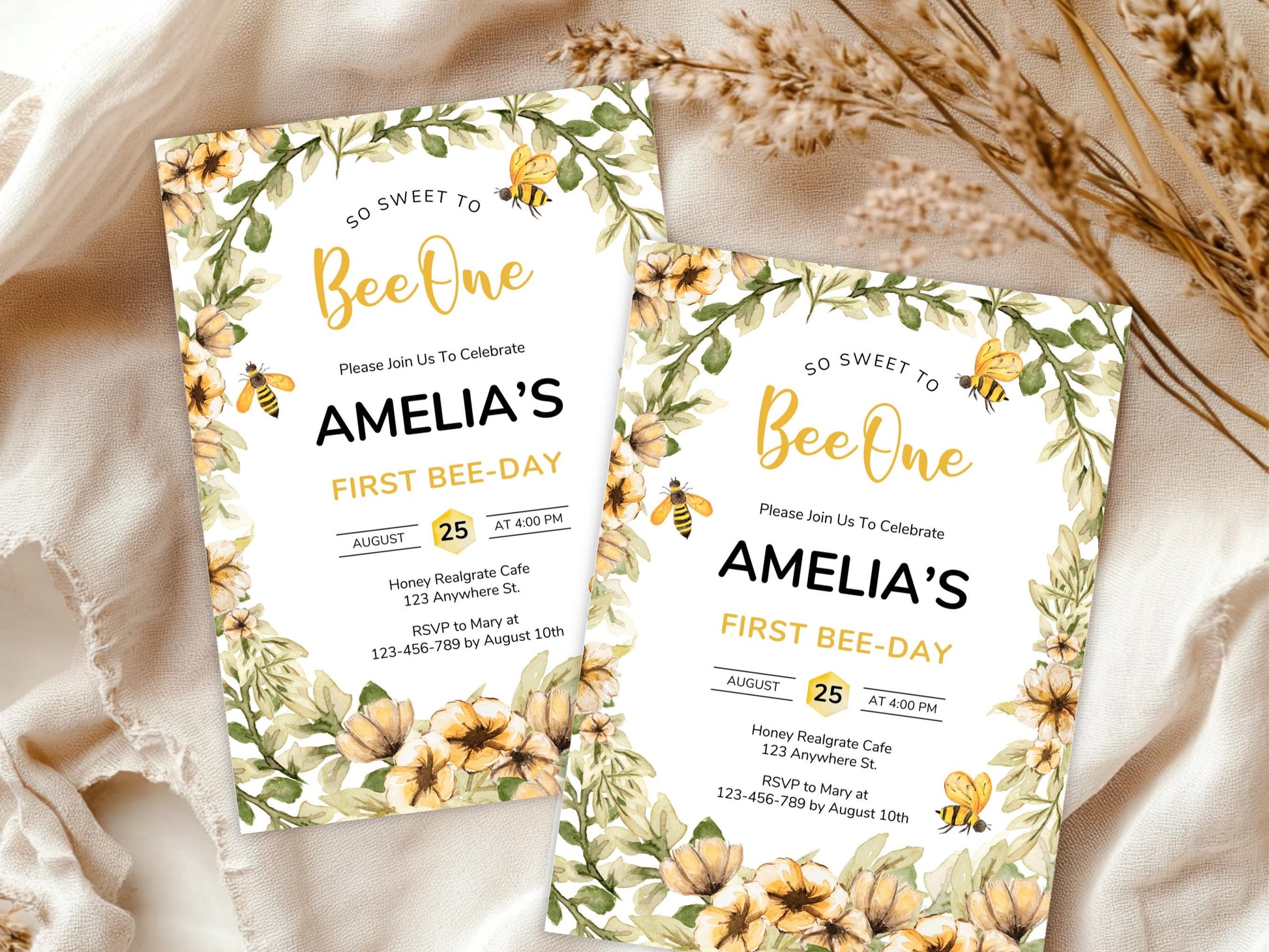 Bee First Birthday Invitation Template, Editable Canva (PDF)