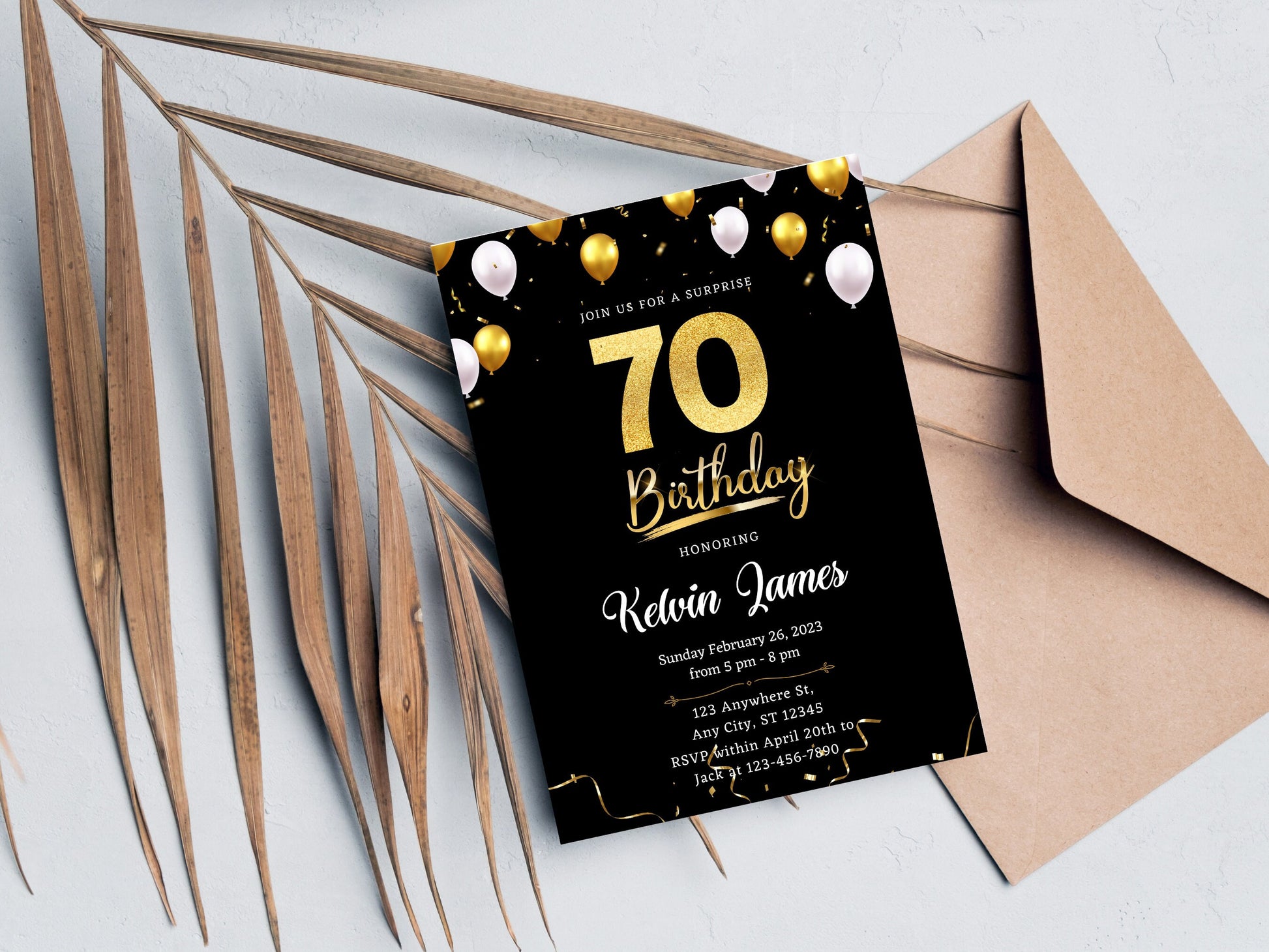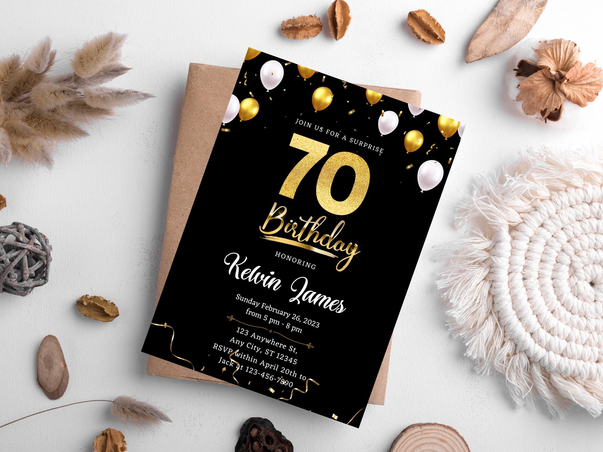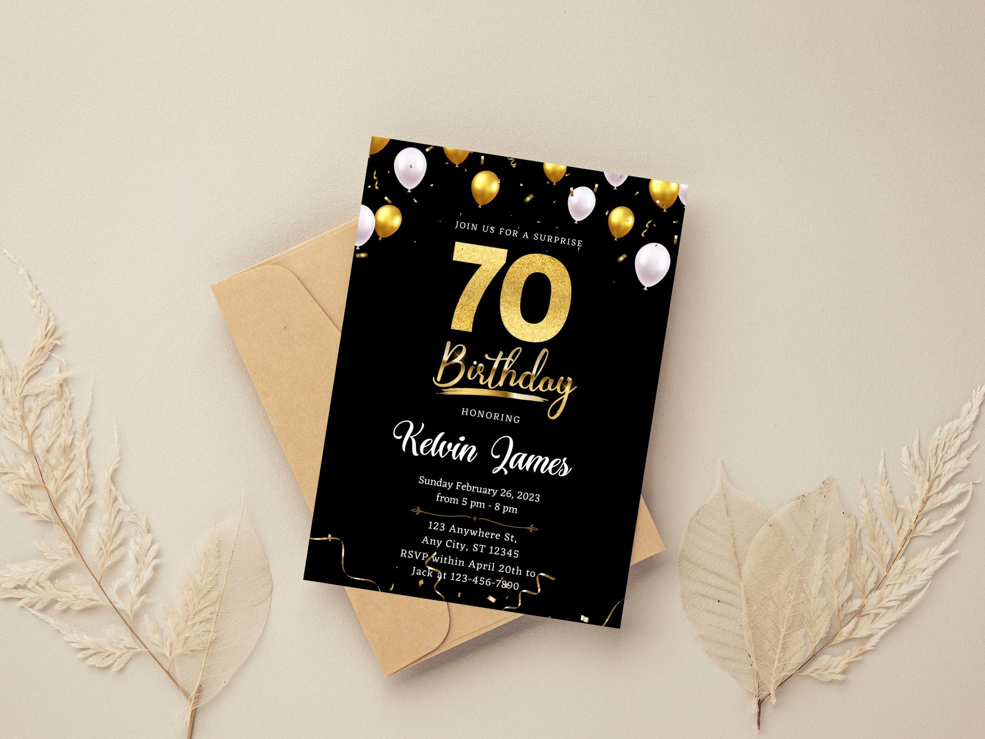 Black and Gold 70th Birthday Invitation Template (Editable Canva Template)