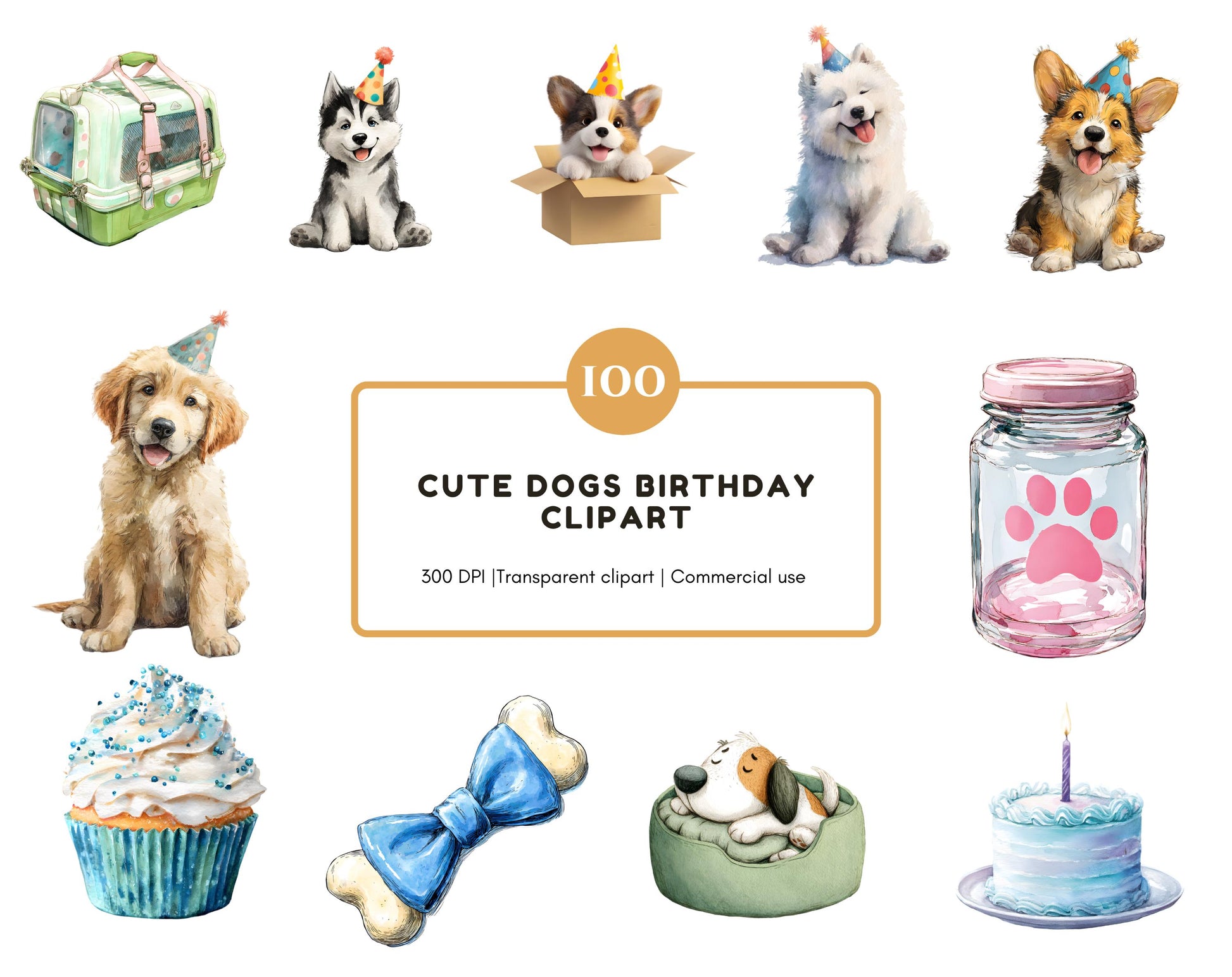 1) 100 high-quality Cute Dog Birthday clipart image files featuring transparent backgrounds