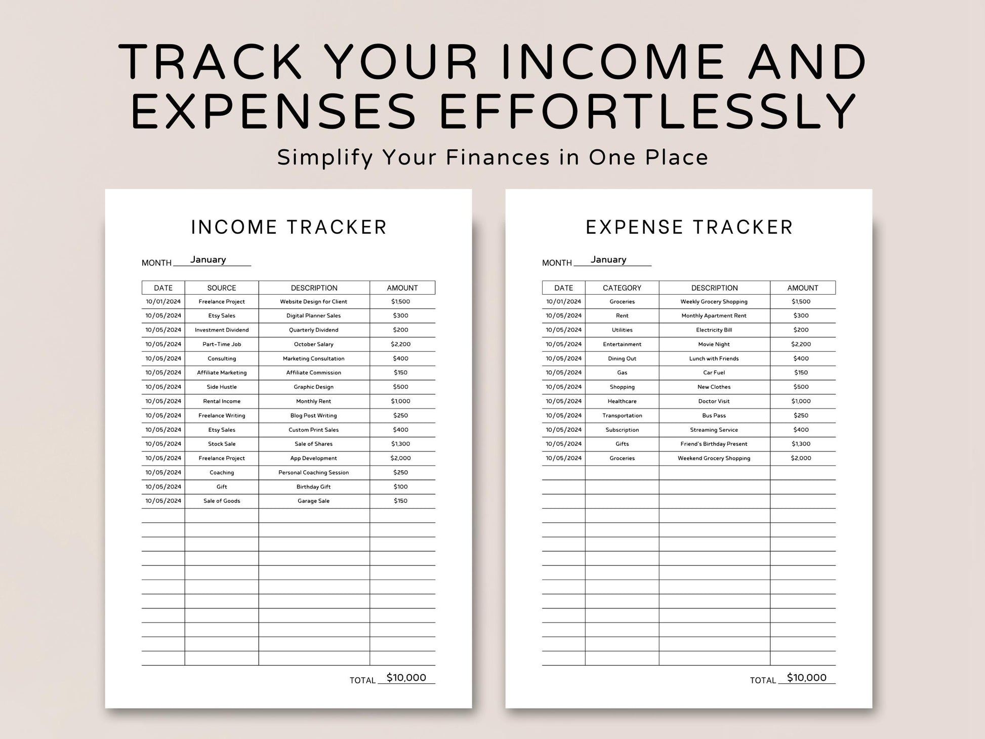 Two-Page Template: One page for tracking income and another for tracking expenses, keeping everything organized.