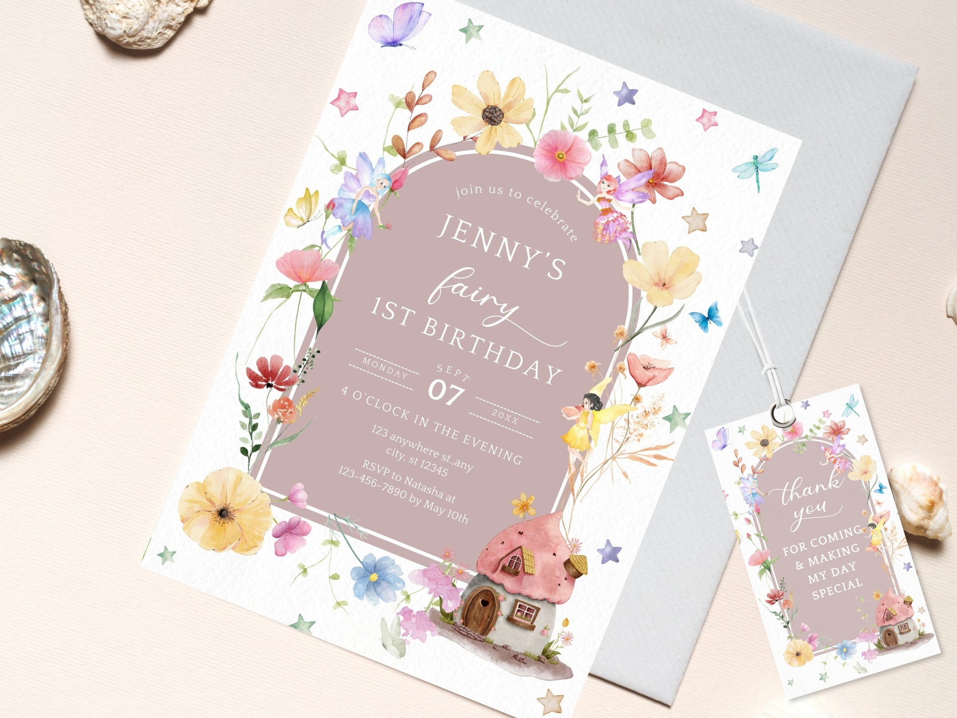 Fairy First Birthday Invitation Template, Muted Blush Boho Wildflower Birthday Invite, Enchanted Fairy First Birthday Garden Party Invite