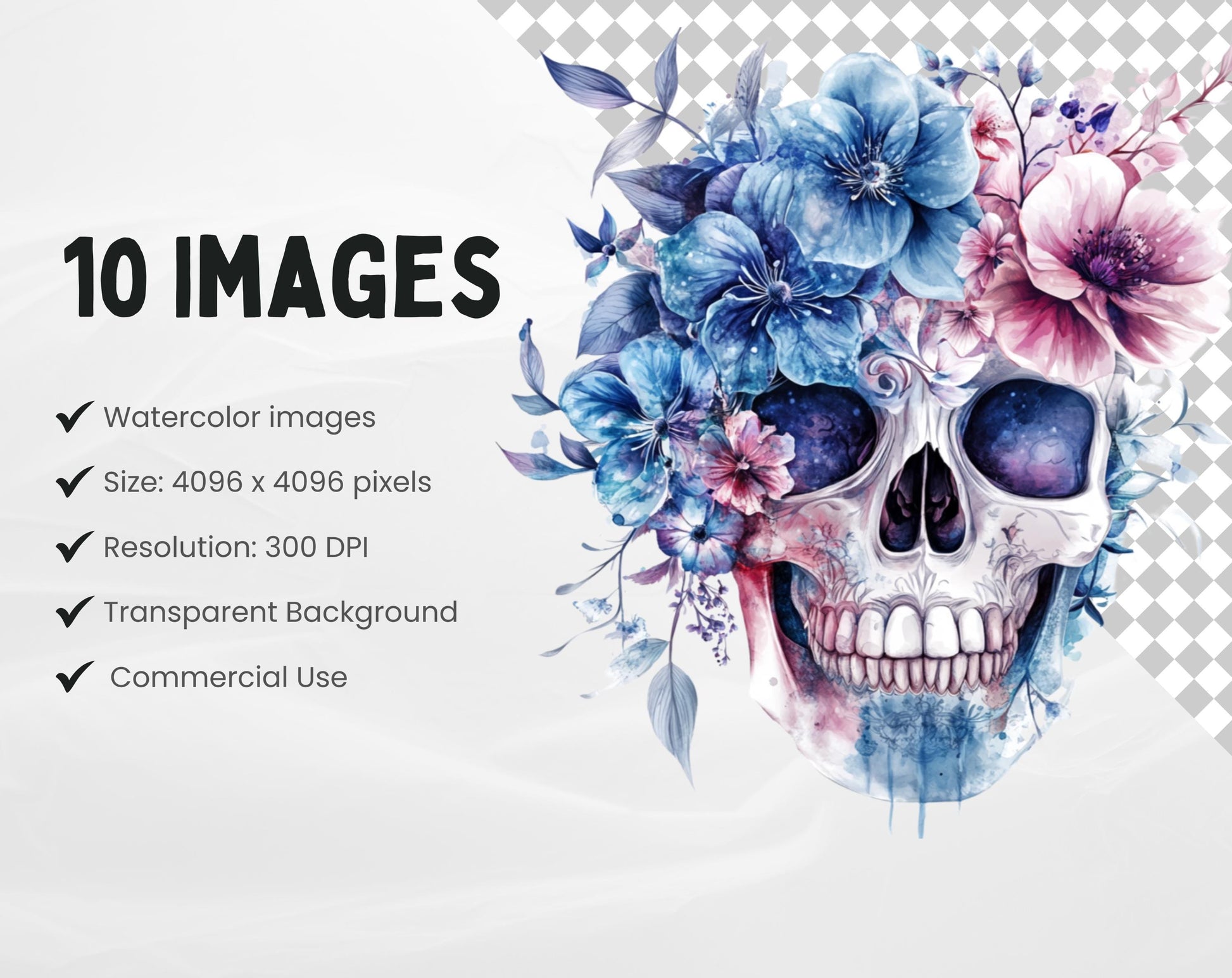 1) 10 high-quality Floral Skull clipart image files featuring transparent backgrounds