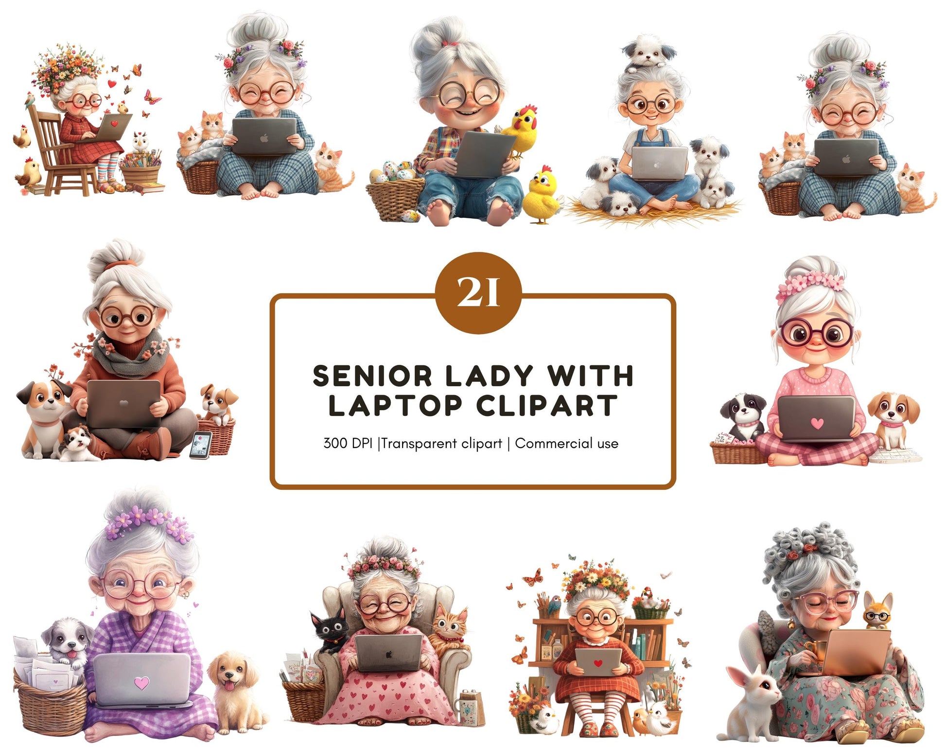 1) 21 high-quality Senior Lady With Laptop clipart image files featuring transparent backgrounds