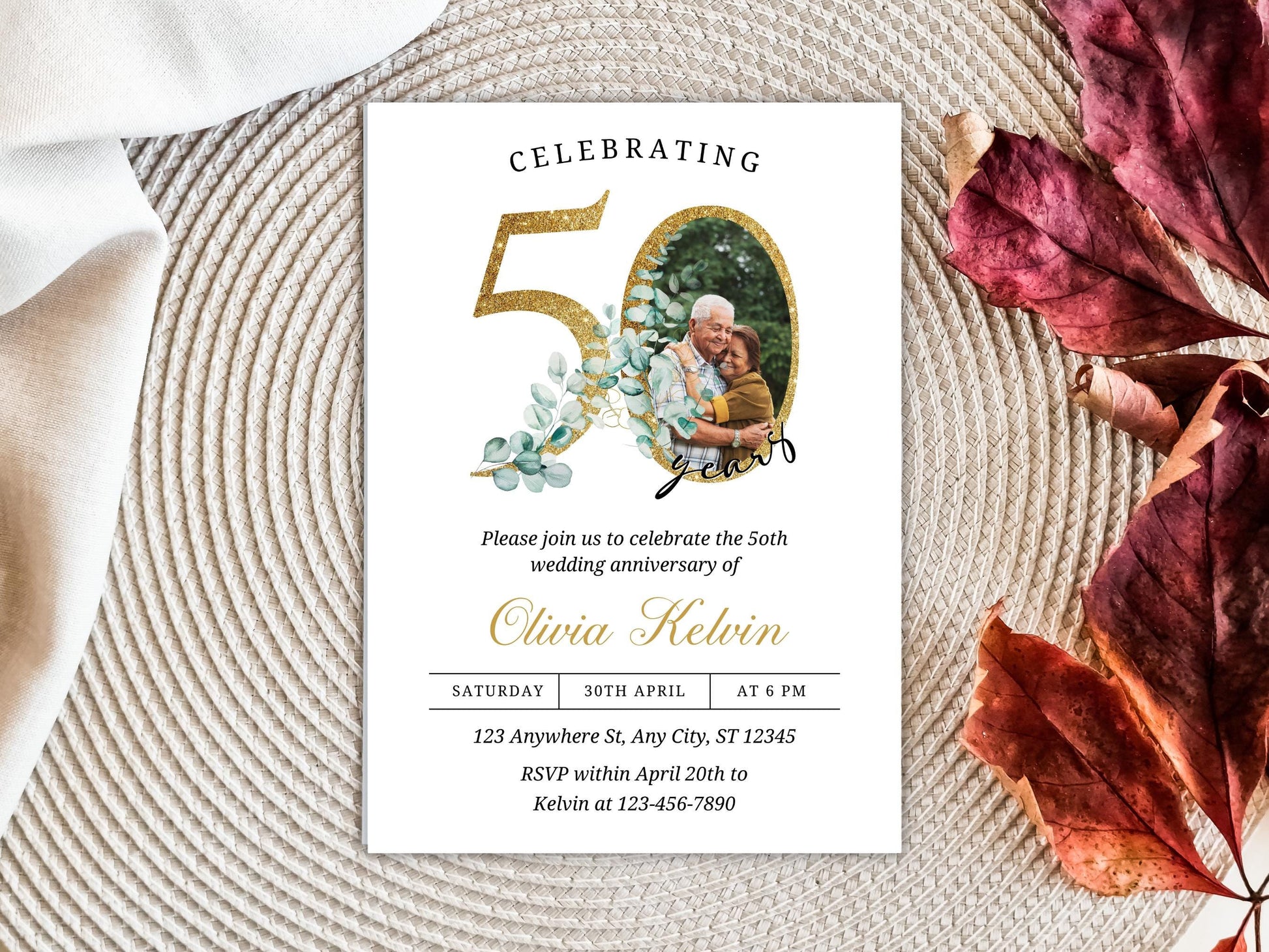Greenery 50th Anniversary Invitation Template, Editable (PDF)