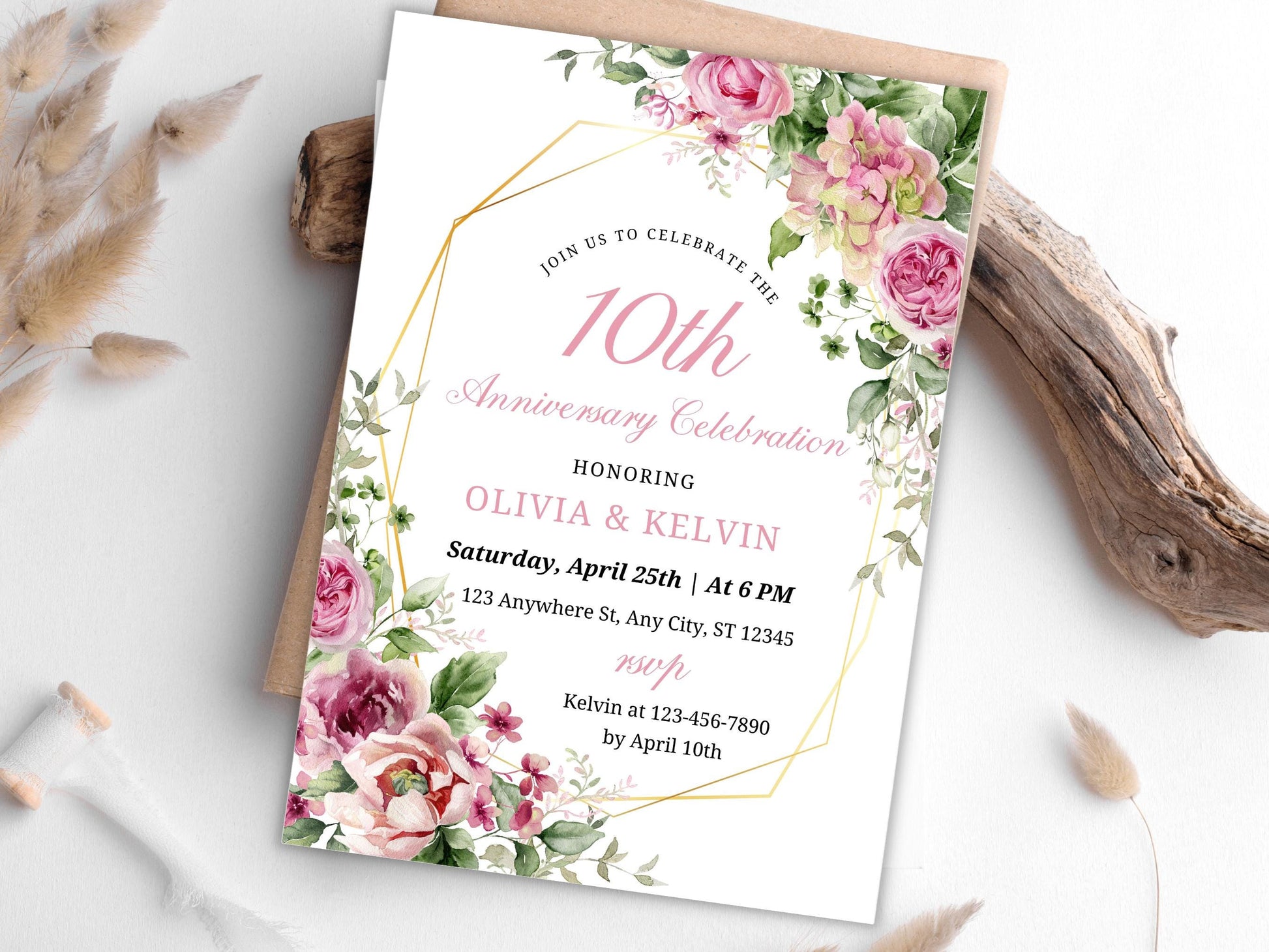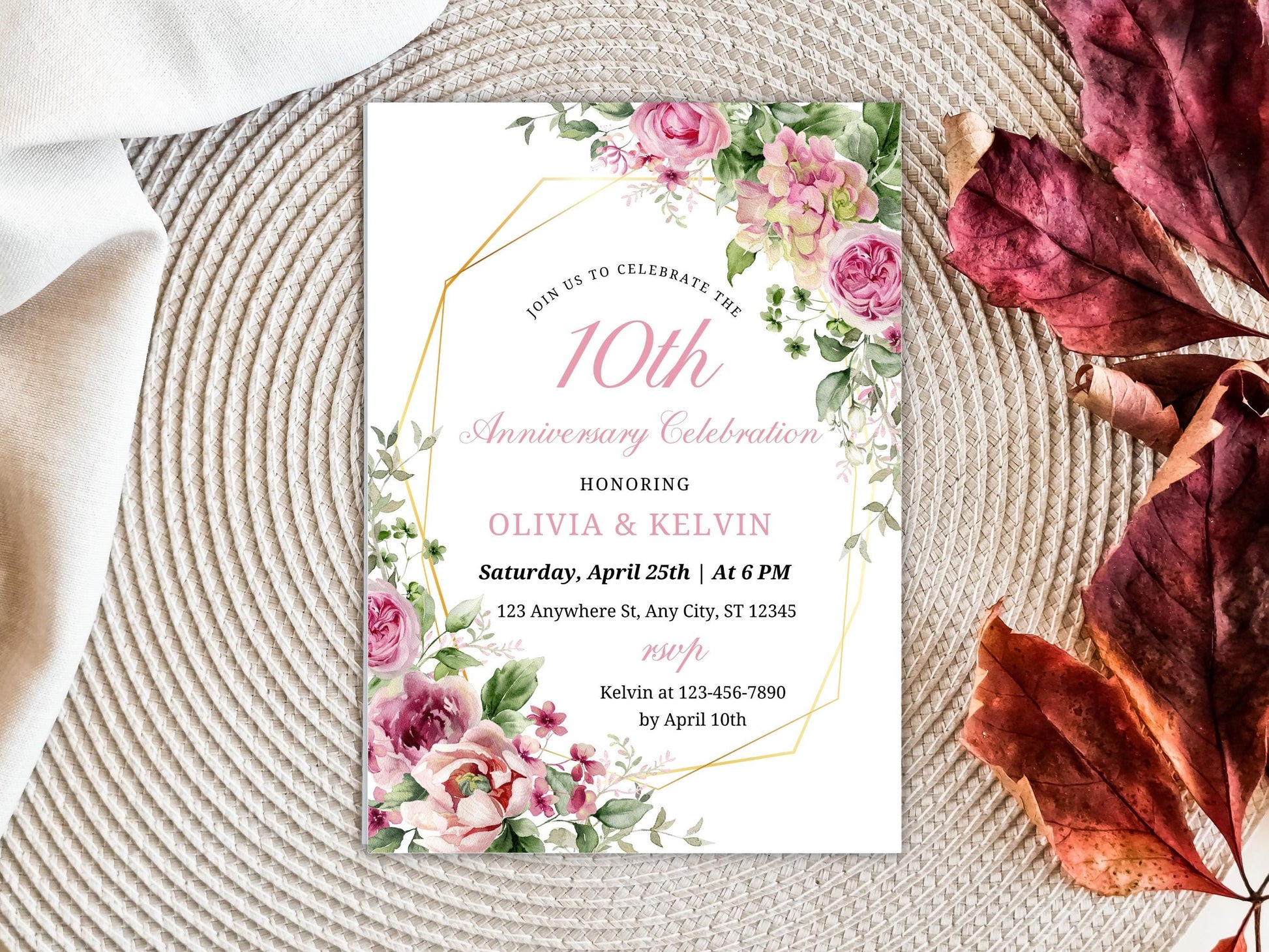 Greenery Floral 10th Anniversary Invitation Template (Editable, Printable)