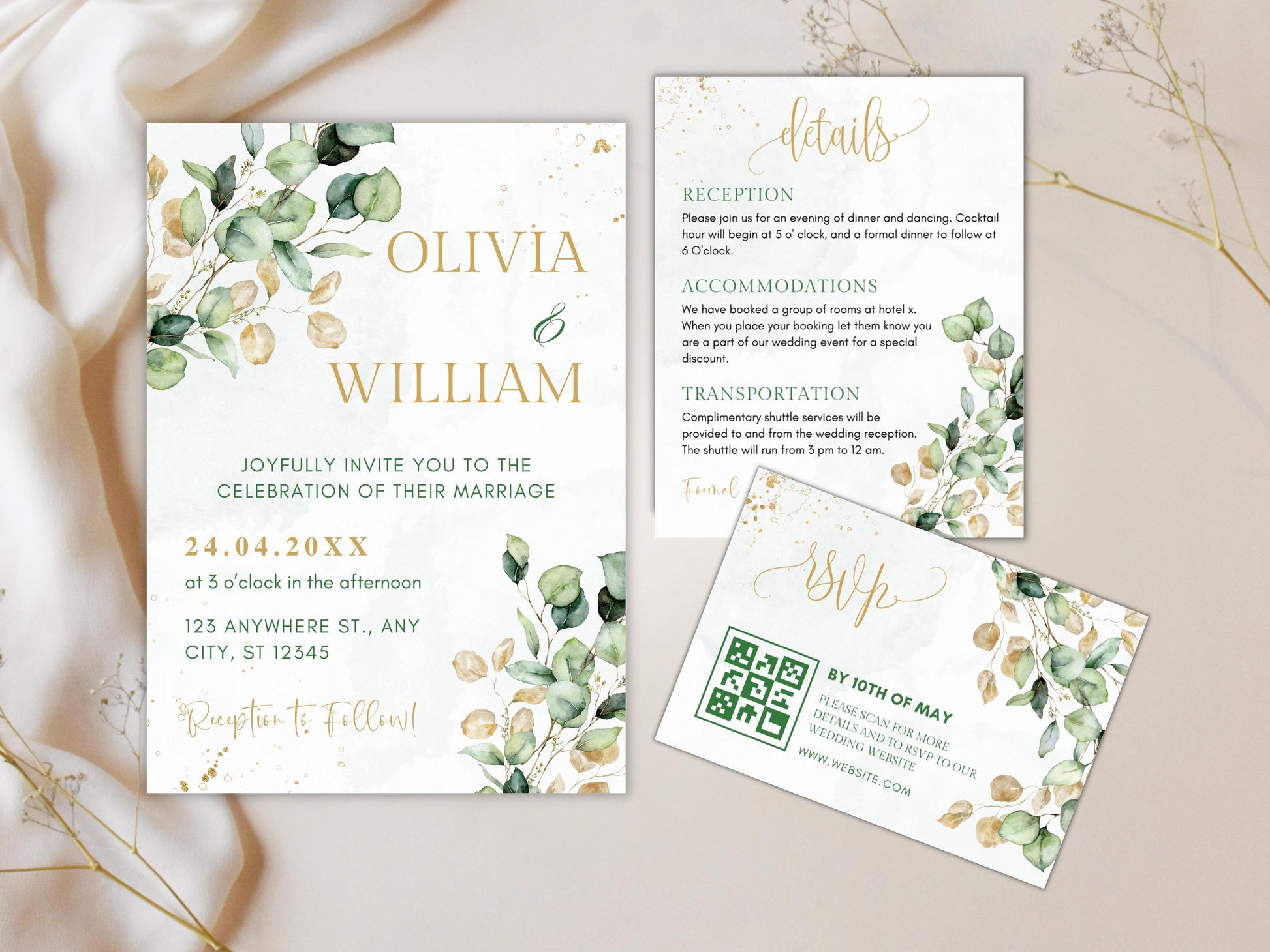 Saga Green Wedding Invitation, Greenery Wedding Invitation Suite, Wedding Invitation Template, Rsvp Qr code Greenery Eucalyptus Invitation