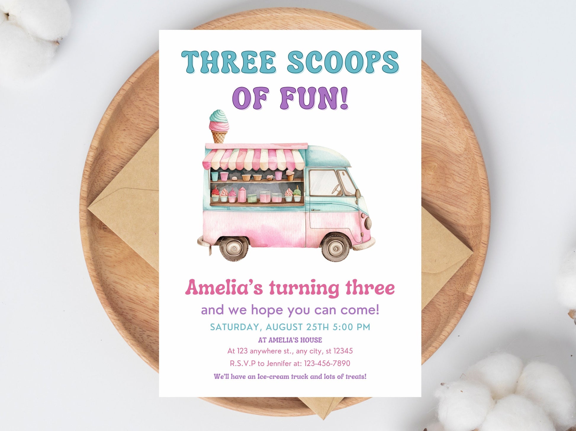 Ice Cream Truck Birthday Invitation Template, Editable Ice Cream Birthday Invite, Three Ice Cream Scoops Birthday Party, Instant Download