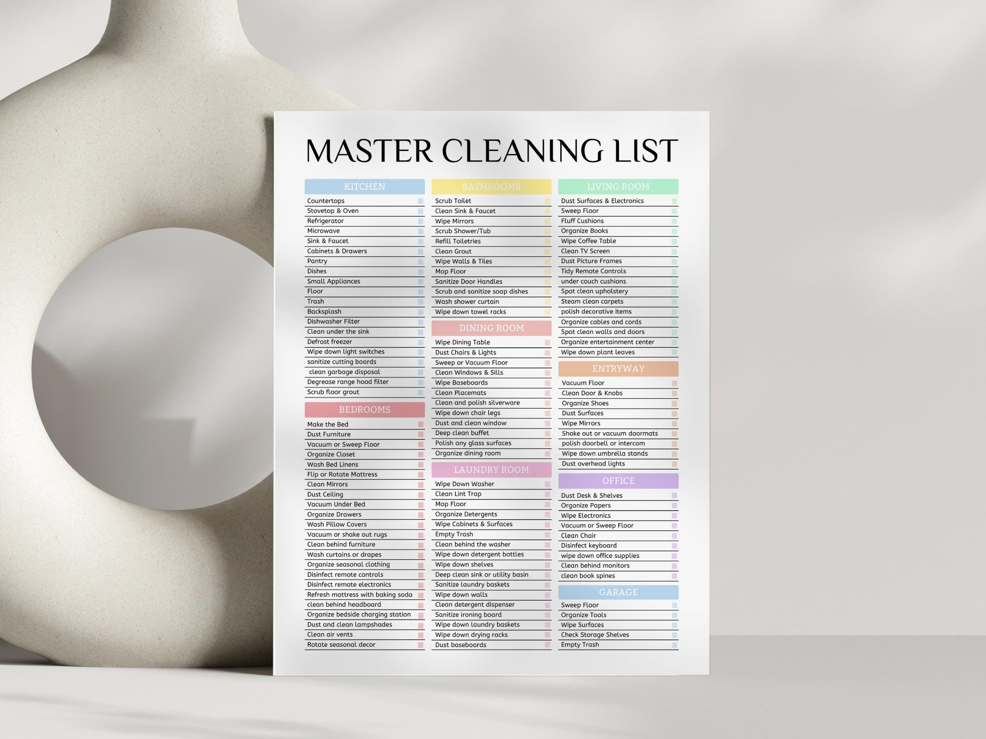 Stay organized and on top of your cleaning routine with this versatile Master Cleaning Checklist. Perfect for creating a comprehensive cleaning plan tailored to your needs.