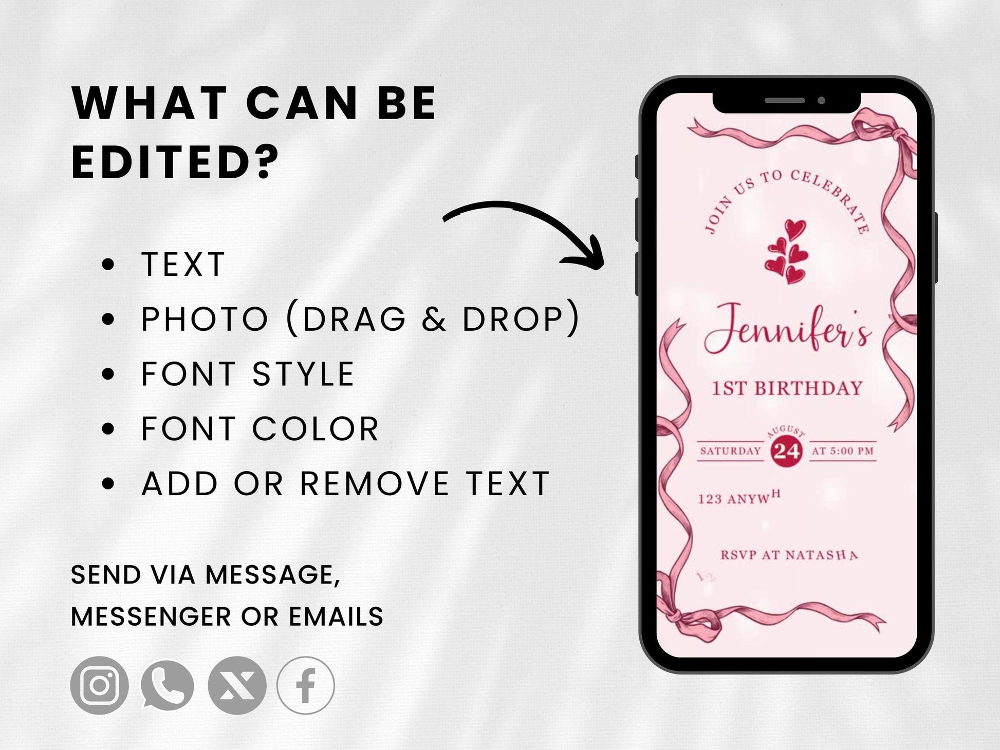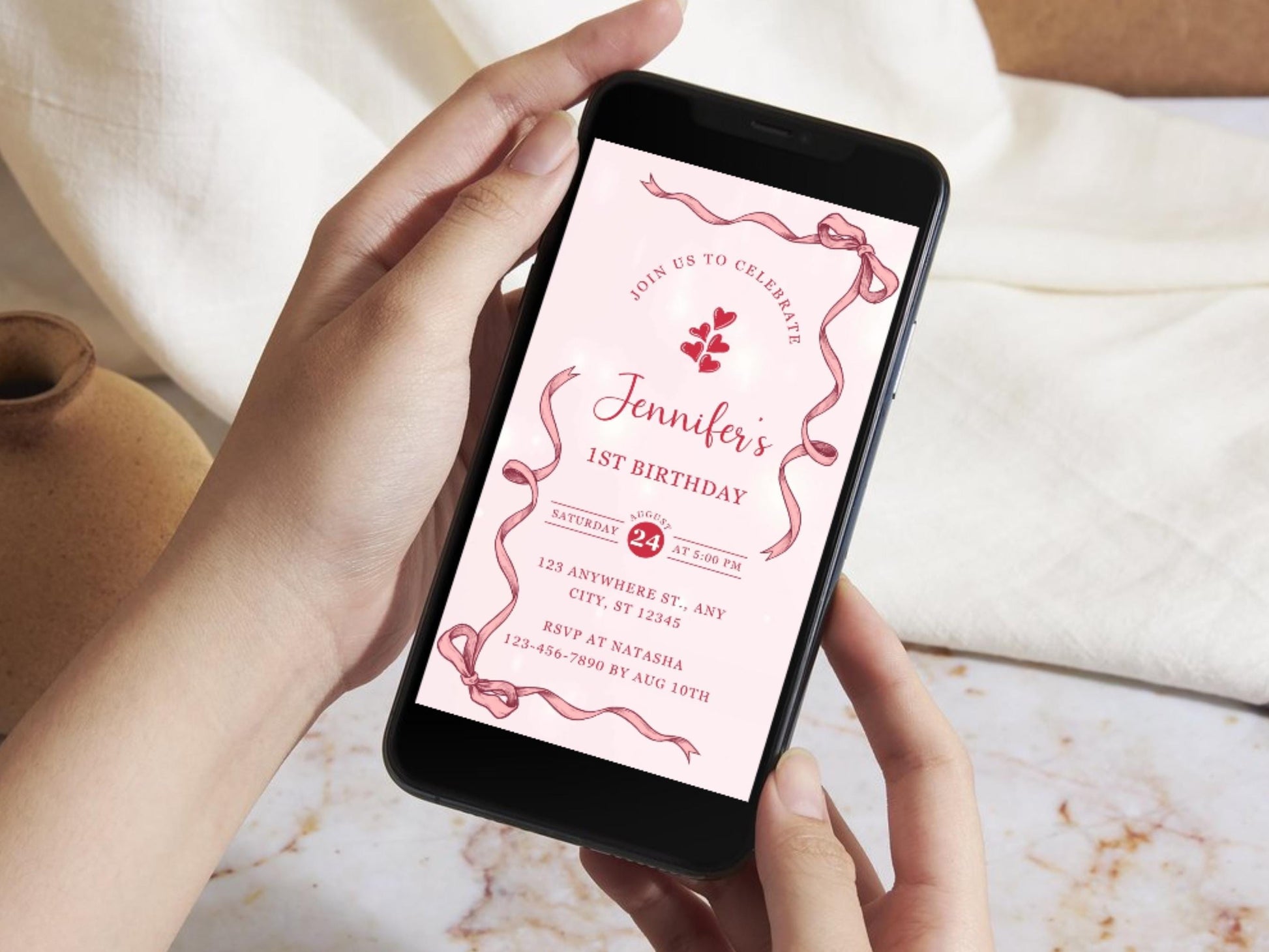 Pink 1st Birthday Invitation Girl: Ribbon Phone E-Invite (Canva Template)