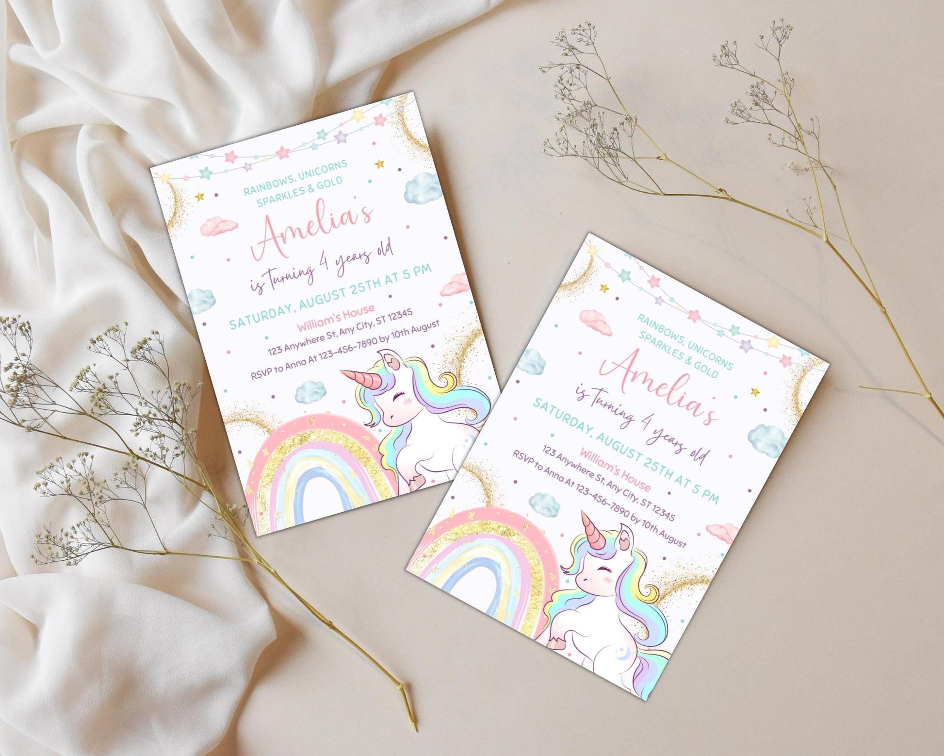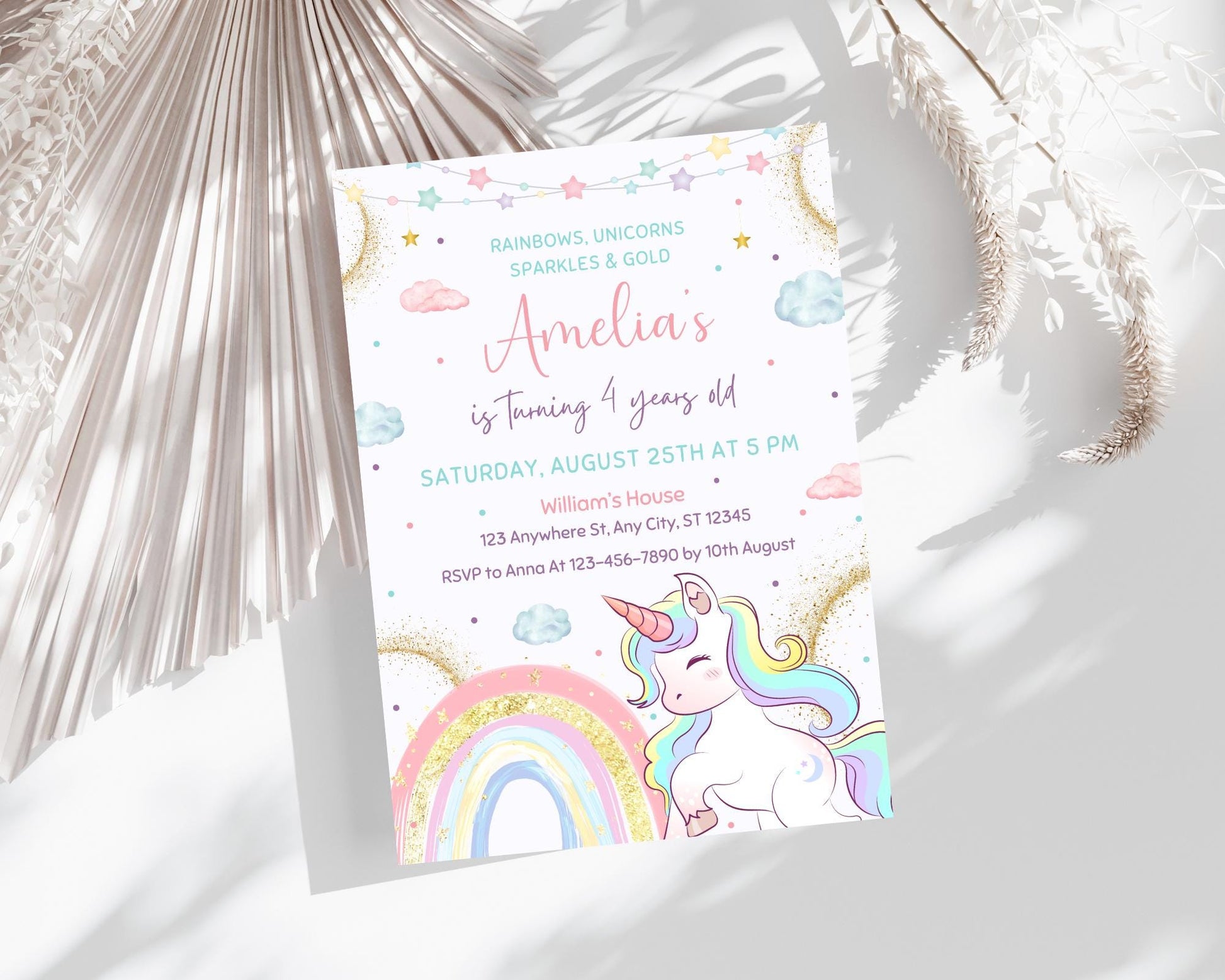 Unicorn Birthday Invitation, Editable Magical Pastel Rainbow Unicorn Birthday Party, Whimsical Fairytale Unicorn Princess Birthday Invite